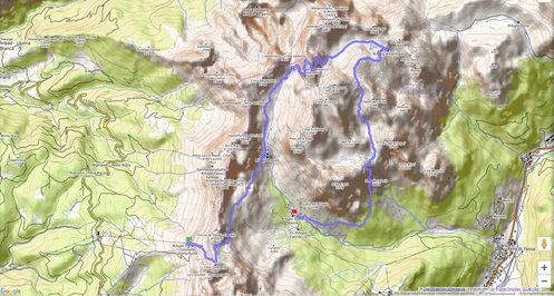 Von der Seilbahnstation an der Kölner Hütte (2339 m) sind wir auf das Tschagerjoch (2630 m) hinaufgestiegen, jenseits ging es wieder hinunter bis zur Vajoletthütte (2243 m). Am Grasleitenpass (2599 m) begann der Klettersteig auf den höchsten Gipfel im Rosengarten, den Kesselkogel (3002 m). Der Klettersteig auf der Ostseite brachte uns hinunter zur Antermoiahütte (2497 m) am gleichnamigen See. Über den gesicherten Scalettesteig wurde dann Gardeccia (1950 m) erreicht.