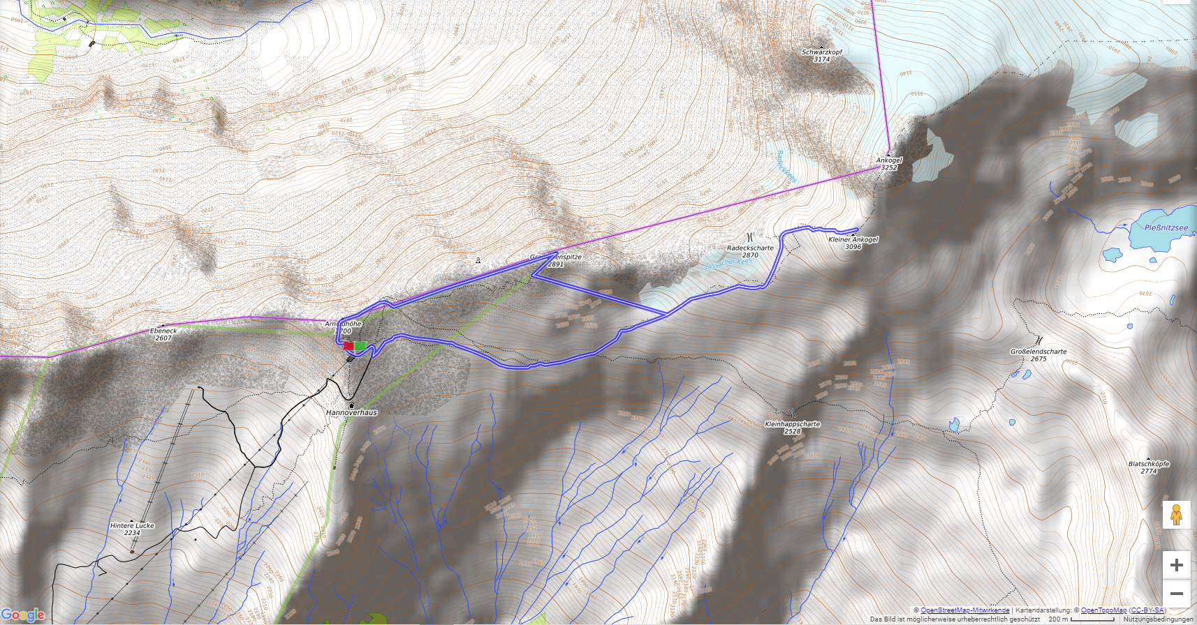 Diese Tour startet ebenfalls an der Bergstation der Ankogelseilbahn (2630 m). Wir sind zuerst auf die Grauleitenspitze (2891 m) gestiegen und dann zum Weg auf den Ankogel gequert. Auf dem Kleinen Ankogel (3096 m) verhinderte ebenfalls eine starke Vereisung den Weiterweg.