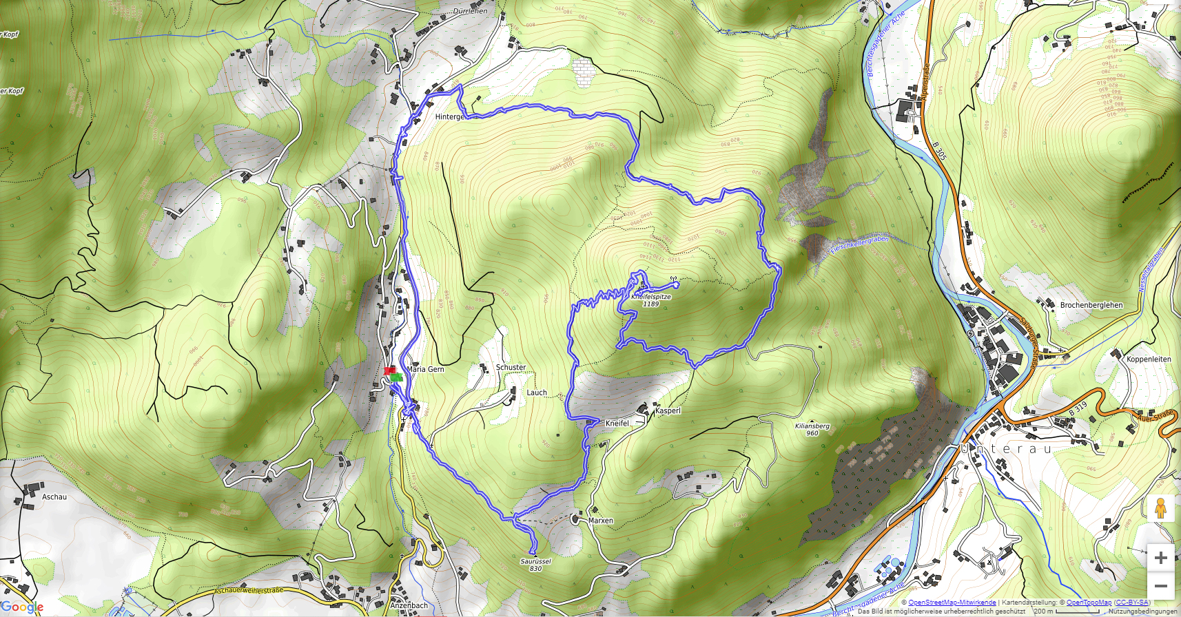 Schöne, kurze Tour auf einen herrlichen Aussichtsberg mit Gipfelhütte. Von Maria Gern (732 m) auf gutem, teilweise steilem Weg zur Paulshütte auf der Kneifelspitze (1189 m). Schöner als der direkte Aufstieg ist der Weg über die Marxenhöhe.