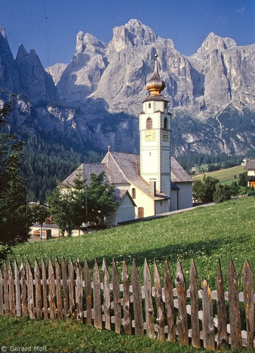 Bild in Lightbox öffnen (open image in lightbox). In einmaliger Harmonie mit der Landschaft steht die Pfarrkirche zum hl. Vigilius von Kolfuschg unter den Wänden des Sellamassivs.