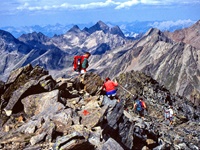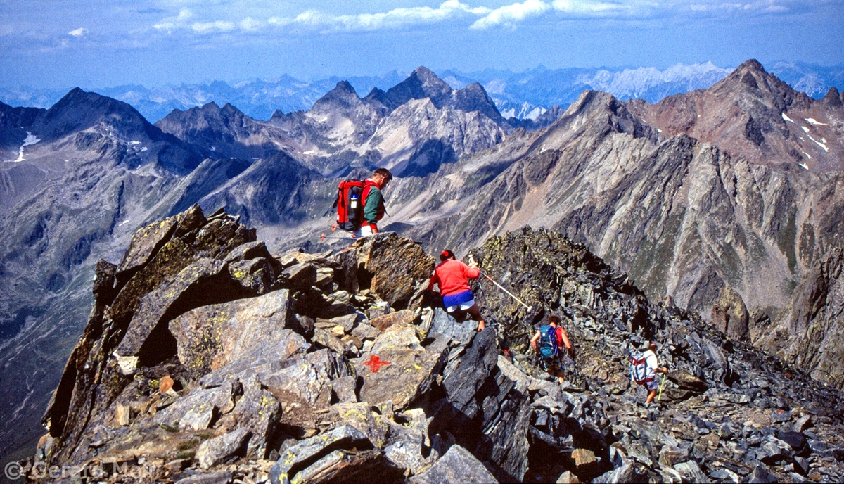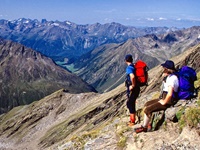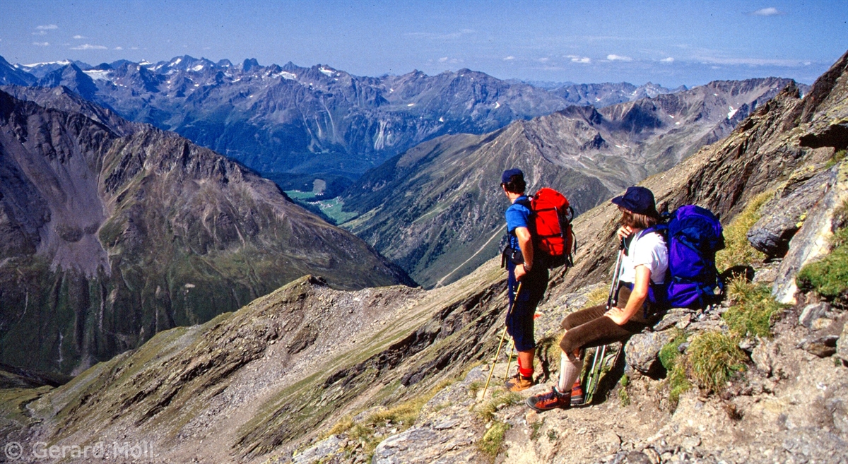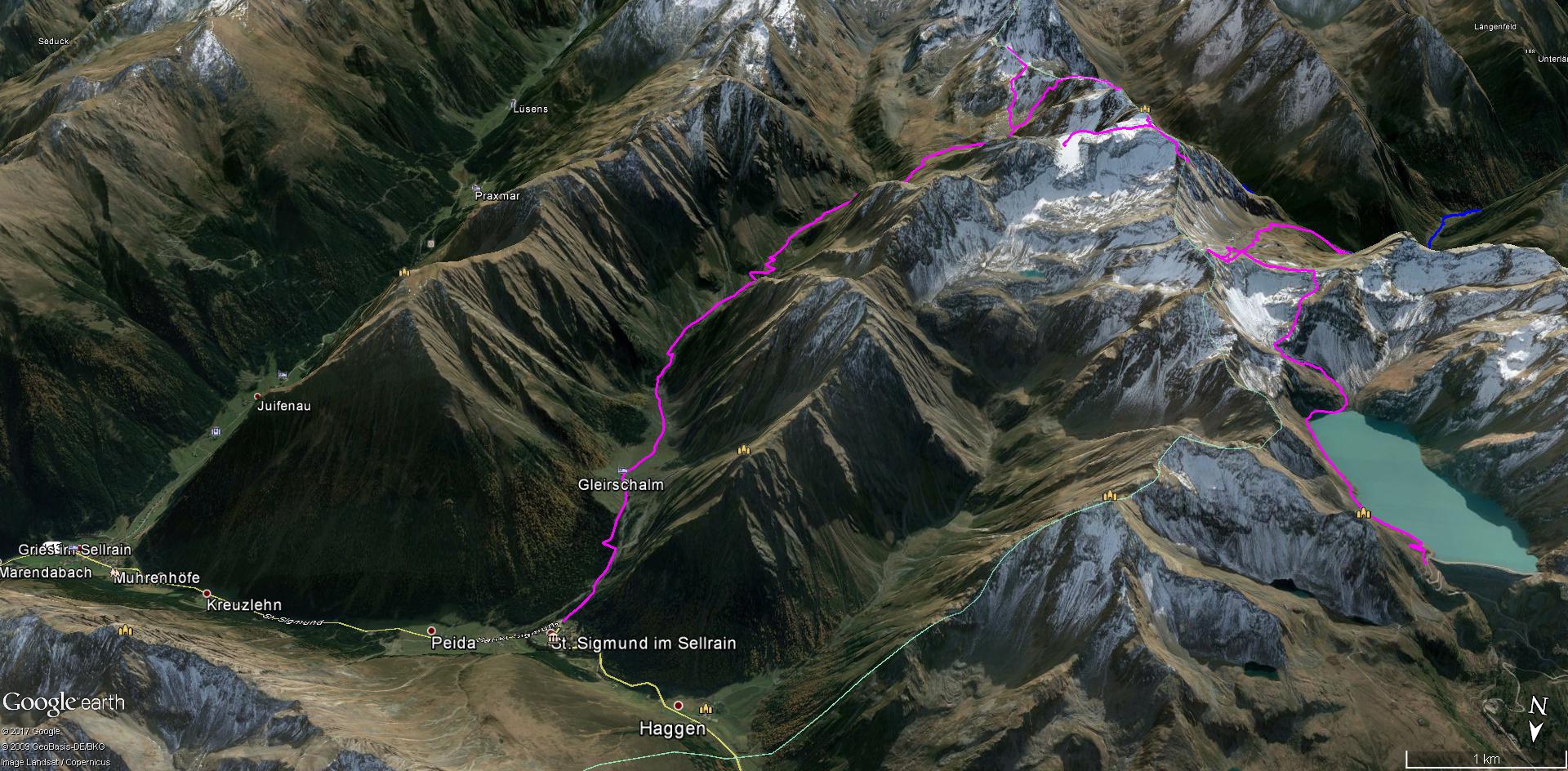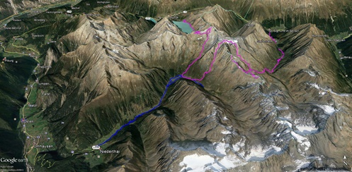 Vom Kühtaisattel (2017 m) führt das erste Wegstück zum Speicher Finstertal und dann steiler hinauf zur Finstertalerscharte (2777 m). Nach der Besteigung der Kraspesspitze (2954 m) steigen wir fast 1000 Meter zur Schweinfurter Hütte (2034 m) ab. Zu ihr gelangt man auch von Niederthai (1550 m) über die Larstiggalm. Am anderen Tag geht es dann steil hinauf zum Zwieselbacher Rosskogel (3081 m). Vom schönen Gipfel steigen wir ab zur Pforzheimer Hütte(2310 m) und durch das Gleirschtal nach St. Sigmund im Sellrain (1513 m).