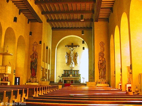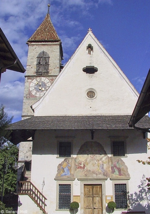 Bild in Lightbox öffnen (open image in lightbox). Die neue Pfarrkirche Hl. Kreuz wurde um 1940 als zentral gelegenes, modernes Gotteshaus erbaut. Sie besitzt die größte Kirchenglocke Südtirols.