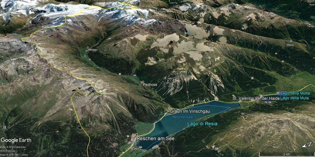 Das dünn besiedelte Langtauferer Tal zweigt in Graun am Reschensee Richtung Ötztaler Berge nach Osten ab.