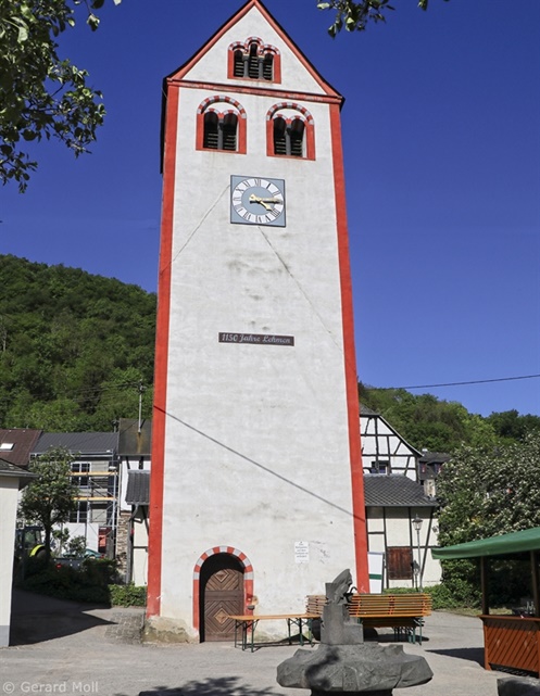 Bild in Lightbox öffnen (open image in lightbox). Der romanische Glockenturm in Lehmen stammt aus dem 12. Jahrhundert.