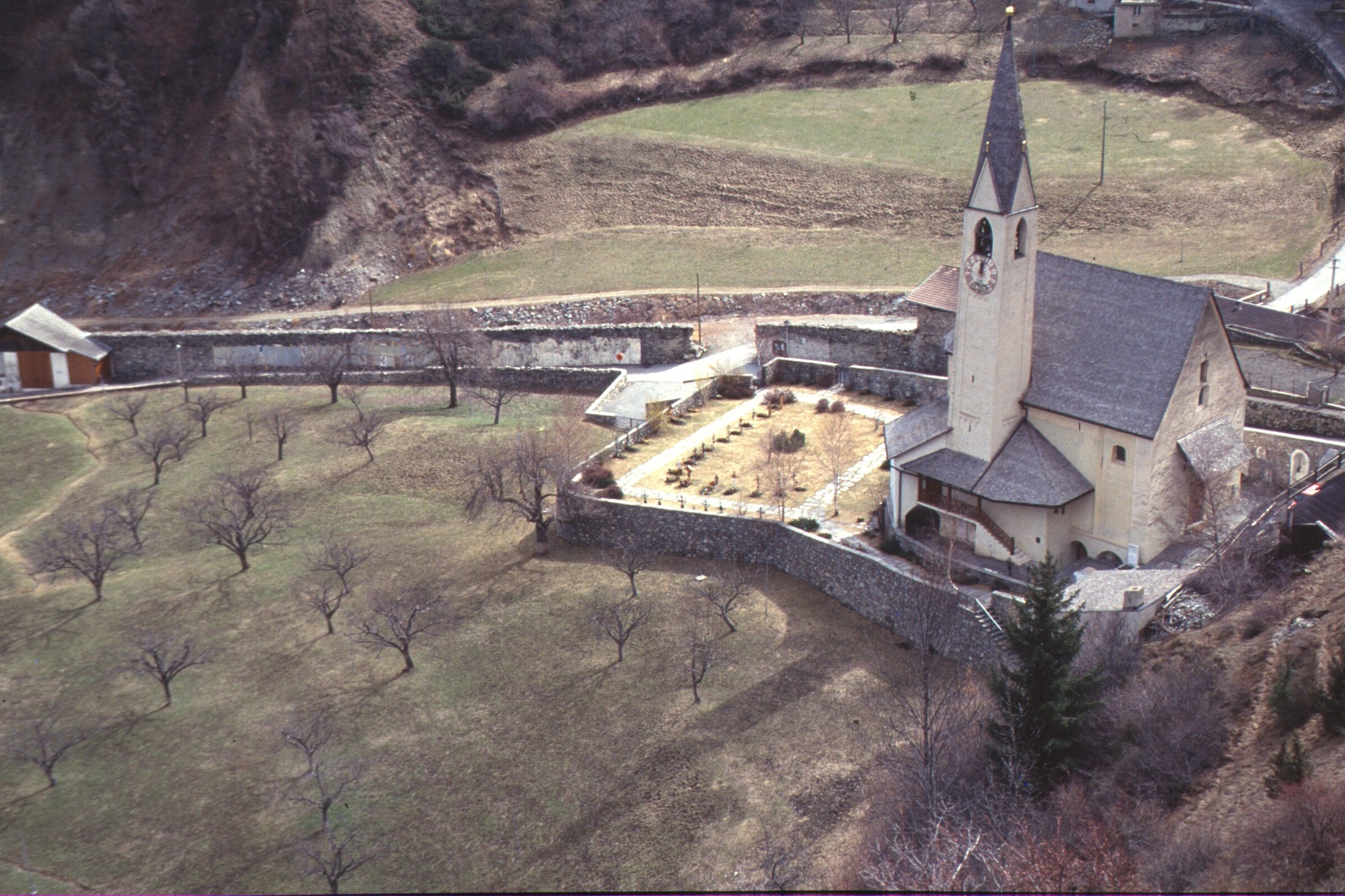 romanische Pfarrkirche wurde im 16. Jahrhundert von einer Mure zerstört. Der Neubau von 1580 entstand unter Einbeziehung von Teilen der älteren Kirche.