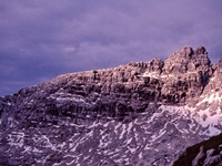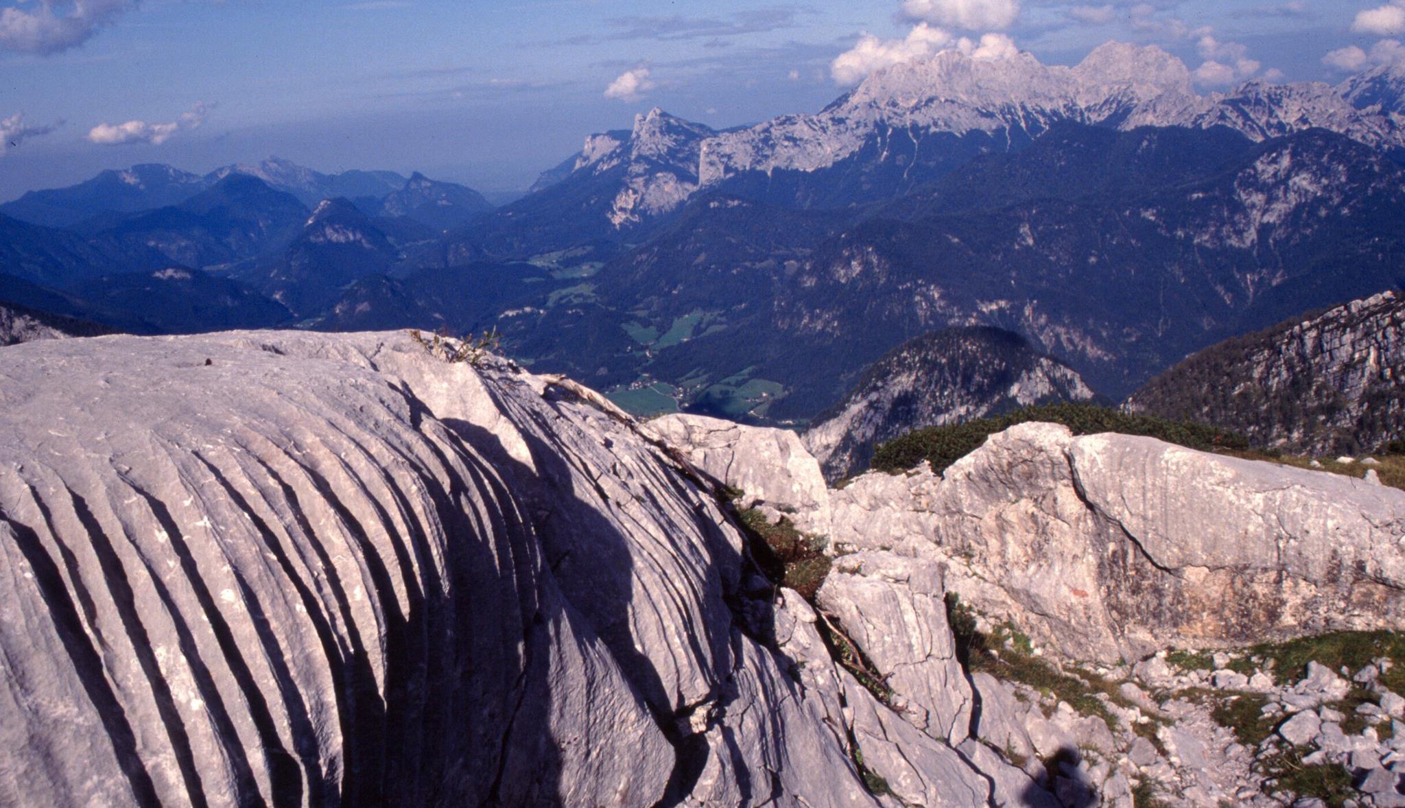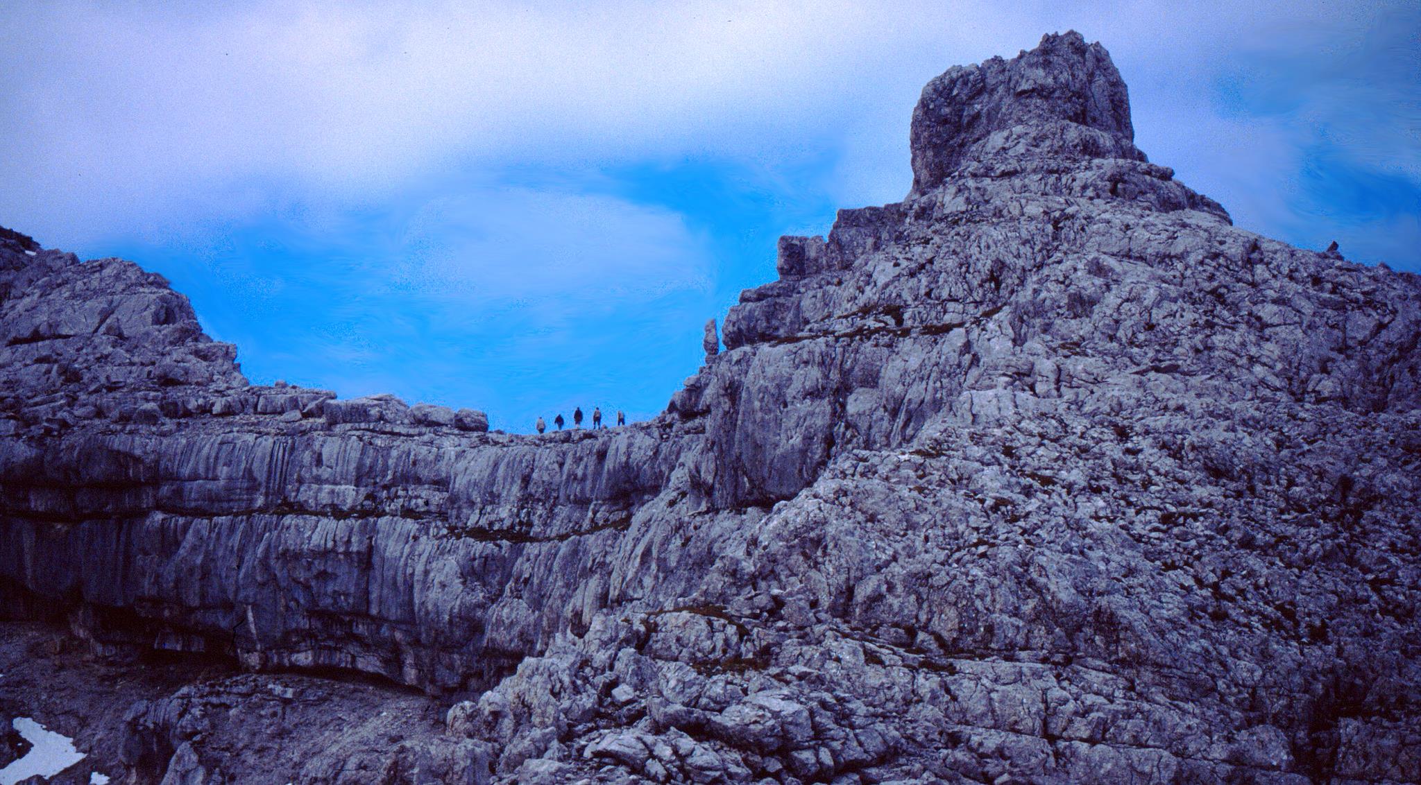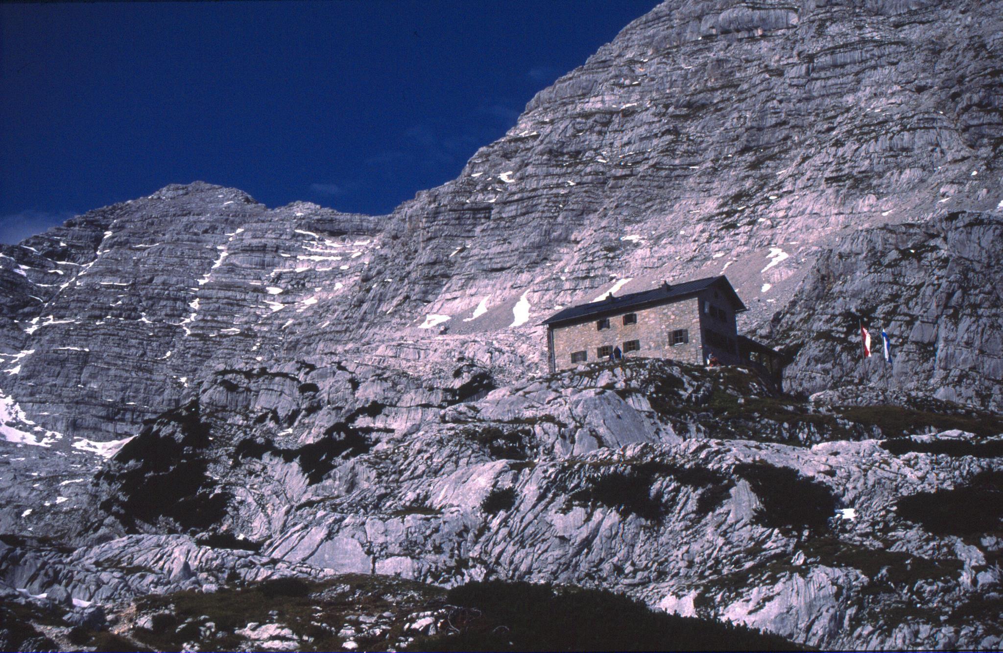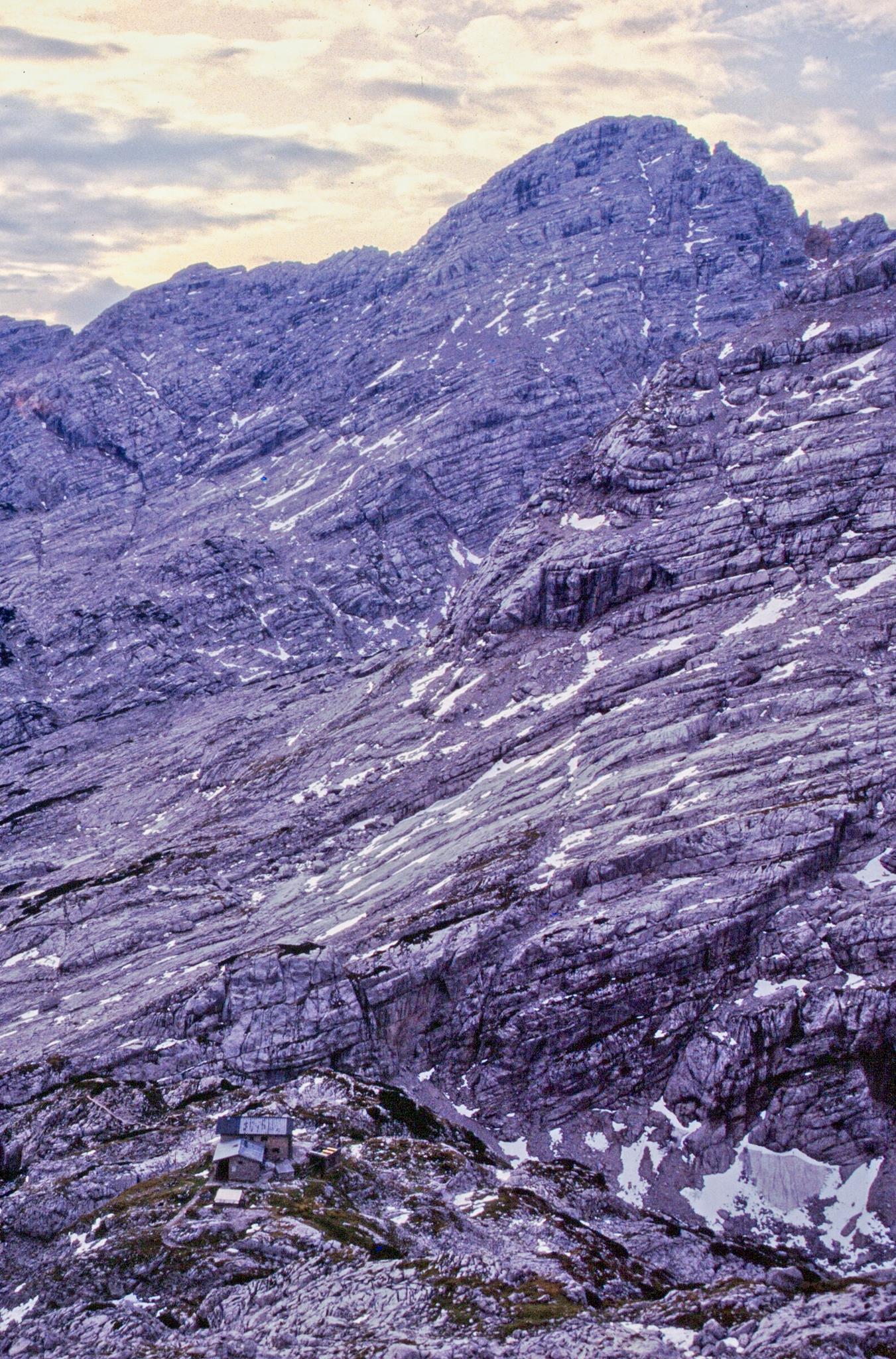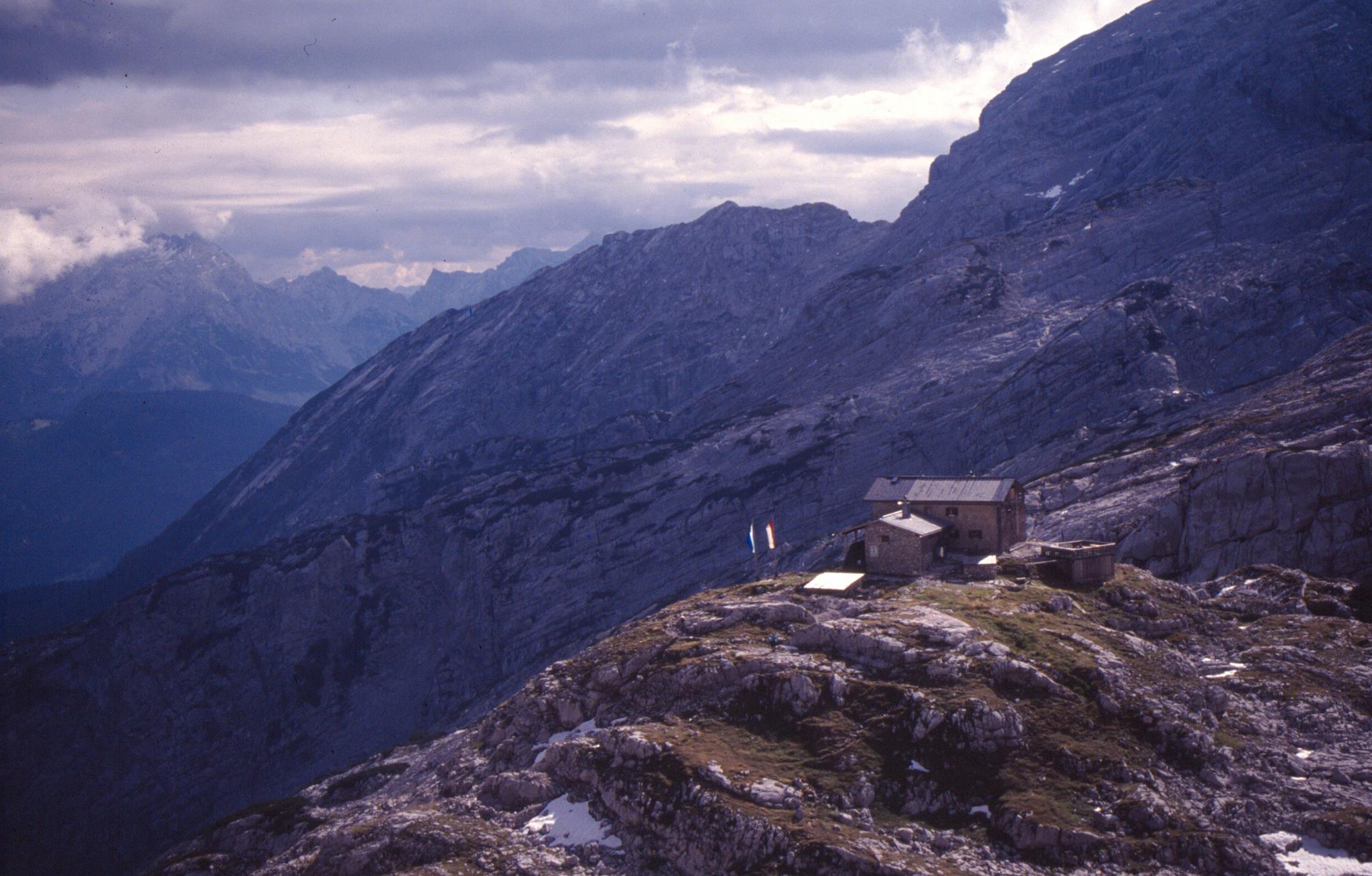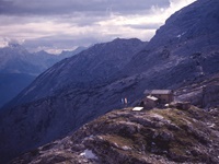 Hier alte Bilder einer Zwei-Tagestour in die Loferer Steinberge. Vom Loferer Hochtal (781 m) ging es auf steilem Weg zur Schmidt-Zabierow-Hütte (1966 m). Am selben Tag wurde noch das Grosse Reifhorn (2488 m) über Bänder bestiegen. Am nächsten Tag zuerst erfolgte zuerst der Aufstieg auf das Mitterhorn (2506 m), dann kam der Abstieg zur Hütte und zum Schluss wurde noch der höchste Gipfel, das Grossen Ochsenhorn (2511 m) bestiegen. Anschließend ging es wieder hinunter ins Tal.