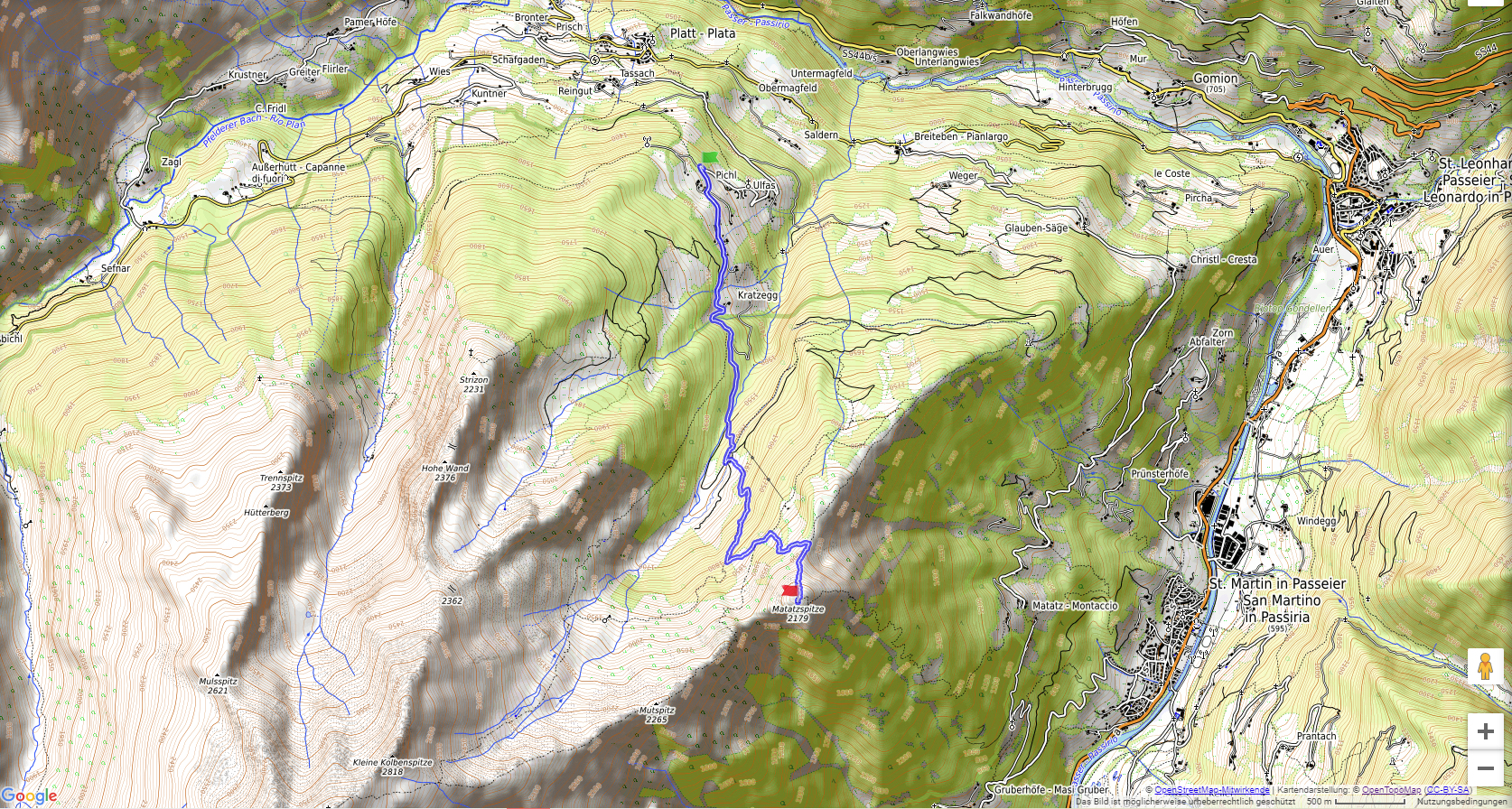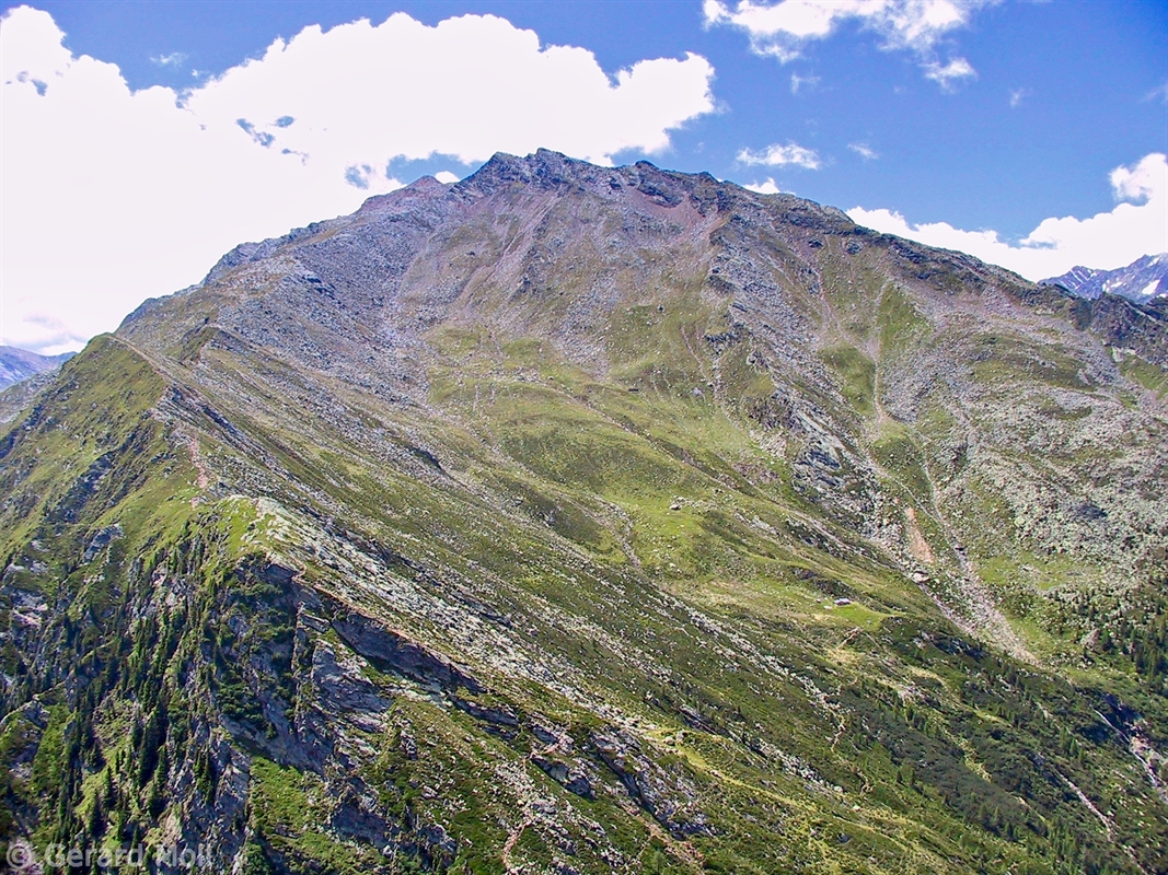 Von der Ulfaser Alm (1601 m, siehe Kolbenspitze) ist man relativ schnell auf der Matatzspitze (2179 m), die schöne Ausblicke ins Passeier bietet.