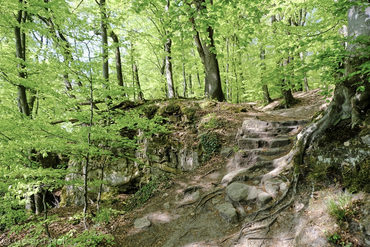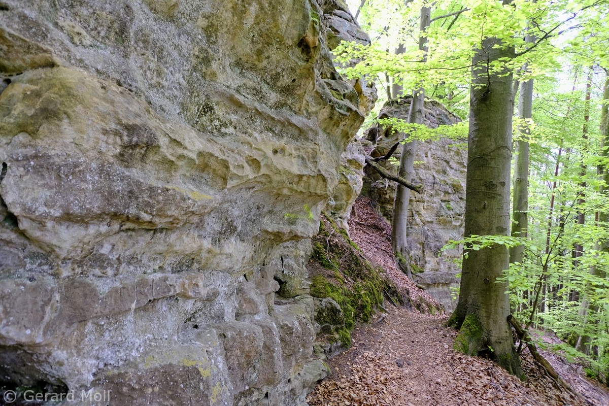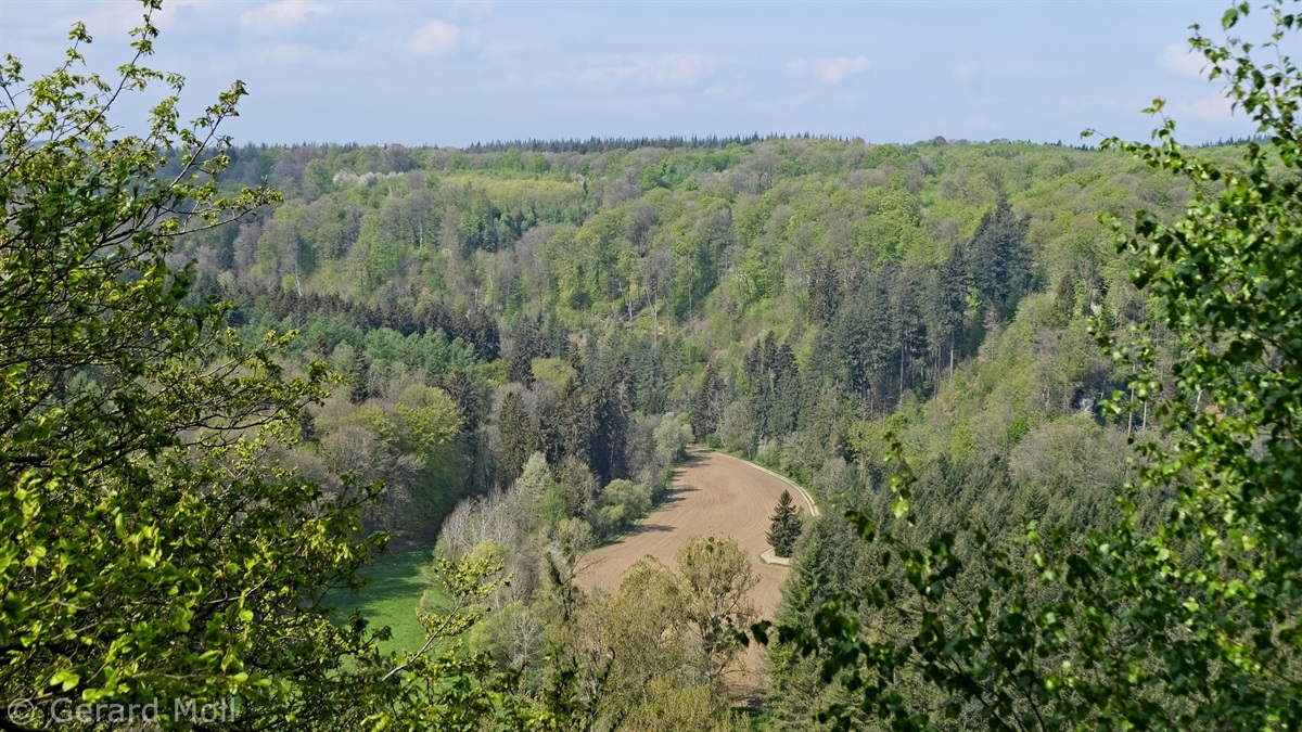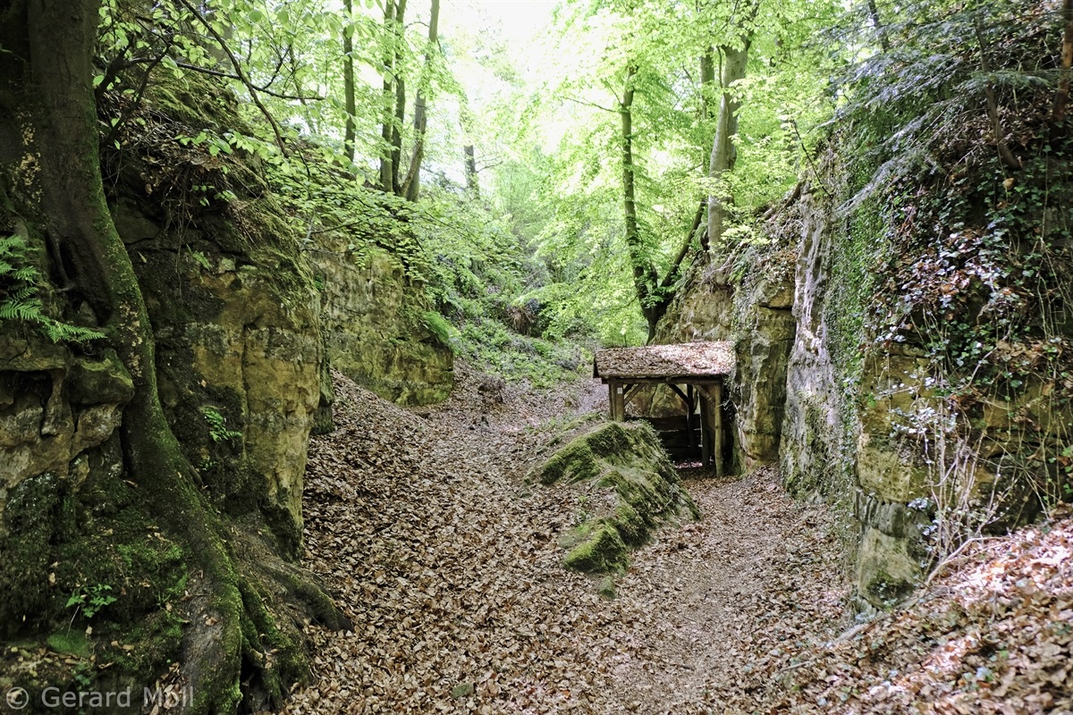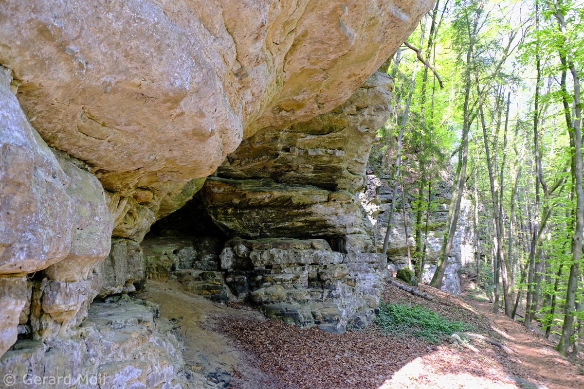 Wir parken oberhalb des Campingplatzes Kronenberg bei dem Unabhängigkeitsdenkmal. Von hier wandern wir hinüber zu den Felsformationen der Mamerleeën. Bei der Höhle der Huellee erkennen wir unter uns Schloss Schoenfels. Nach der Überquerung der Hochfläche blicken wir vom Predigtstuhl auf Burg Hollenfels. Danach geht es auf einem neu angelegten Weg in Serpentinen hinunter zum "Hunnebuer". Von hier geht es noch einmal steil auf einem wenig gepflegten Weg hinauf bis zu der interessanten Schlucht "Wollefsgriecht" von wo aus wir dann rasch wieder bei unserem Ausgangspunkt sind.