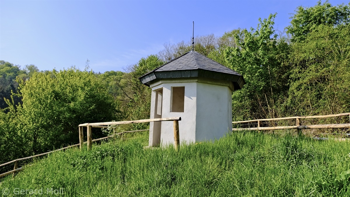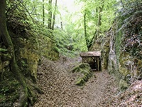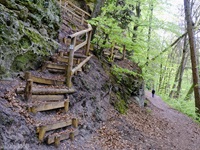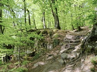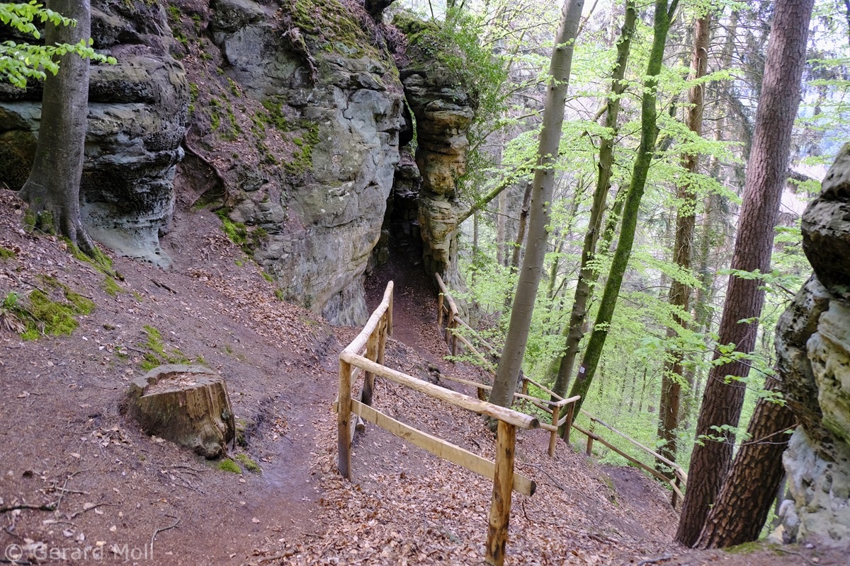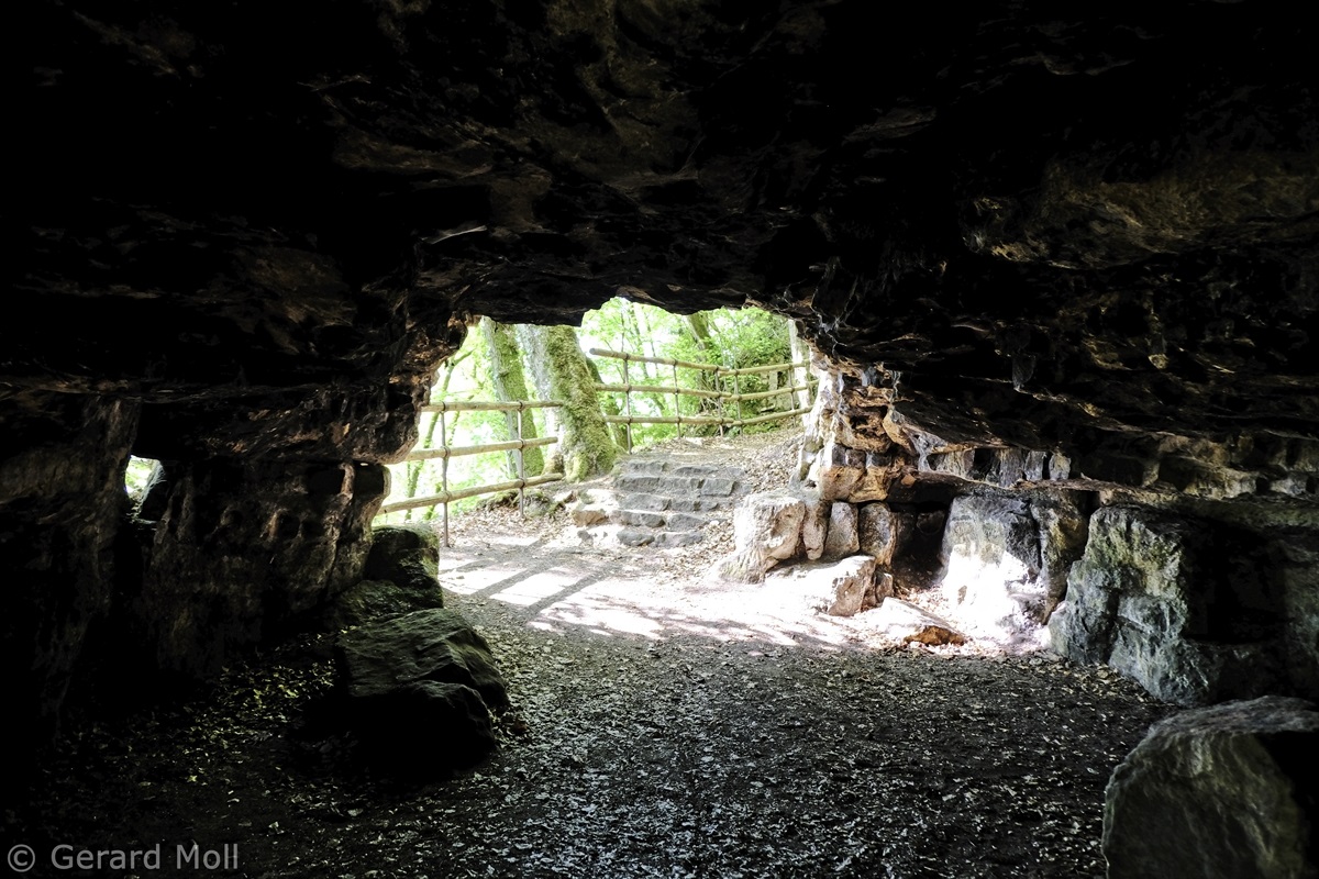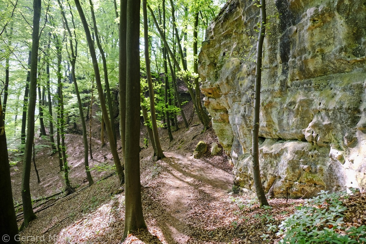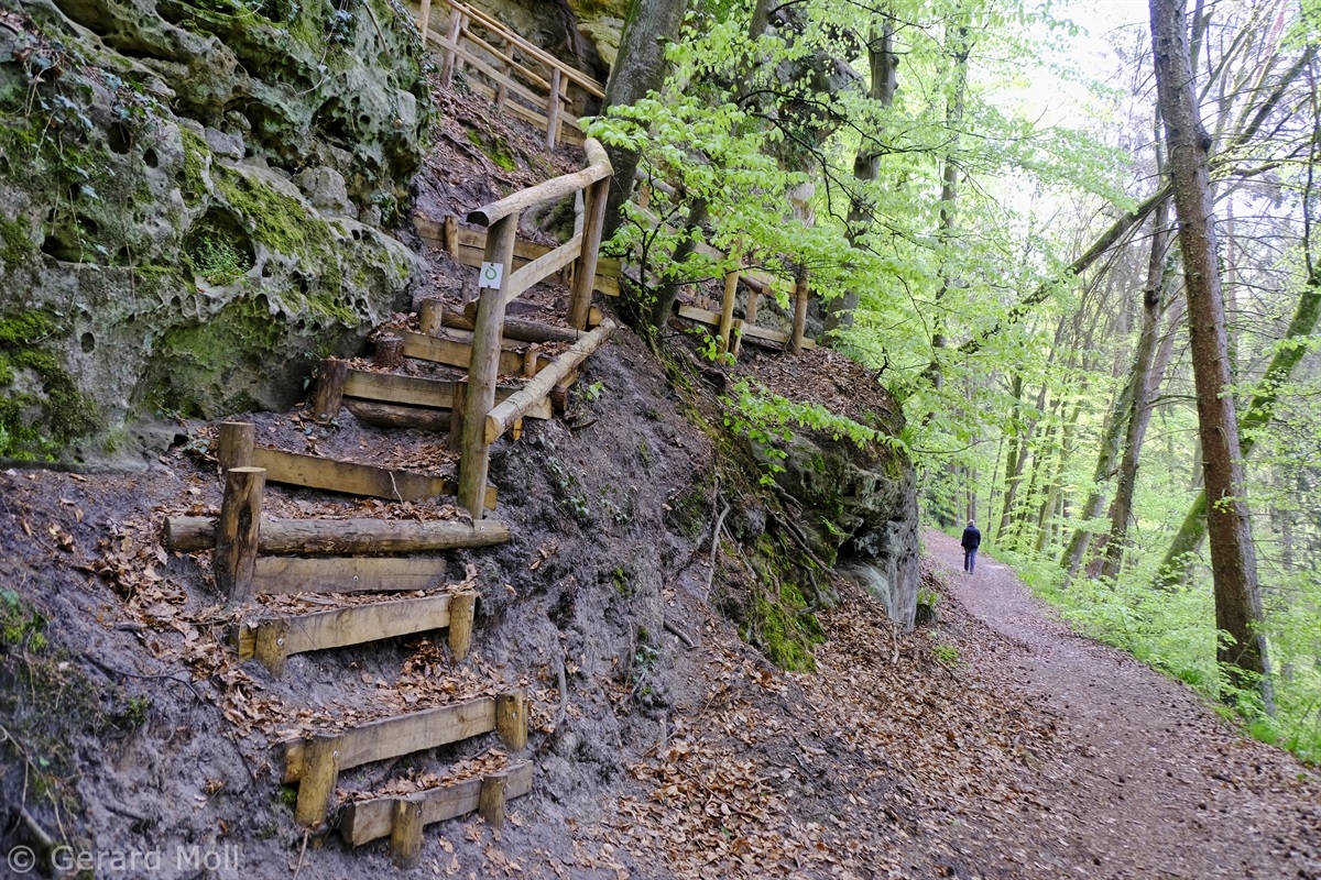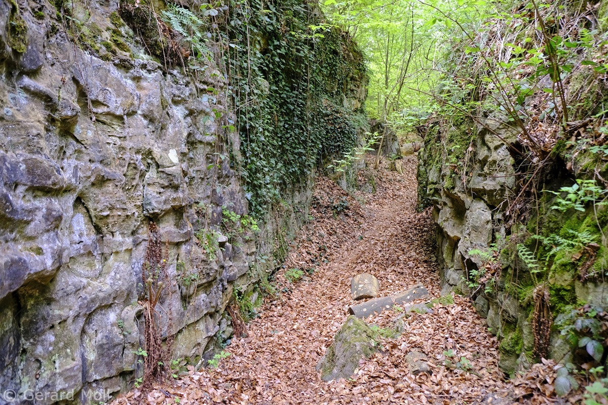 Wir parken oberhalb des Campingplatzes Kronenberg bei dem Unabhängigkeitsdenkmal. Von hier wandern wir hinüber zu den Felsformationen der Mamerleeën. Bei der Höhle der Huellee erkennen wir unter uns Schloss Schoenfels. Nach der Überquerung der Hochfläche blicken wir vom Predigtstuhl auf Burg Hollenfels. Danach geht es auf einem neu angelegten Weg in Serpentinen hinunter zum "Hunnebuer". Von hier geht es noch einmal steil auf einem wenig gepflegten Weg hinauf bis zu der interessanten Schlucht "Wollefsgriecht" von wo aus wir dann rasch wieder bei unserem Ausgangspunkt sind.