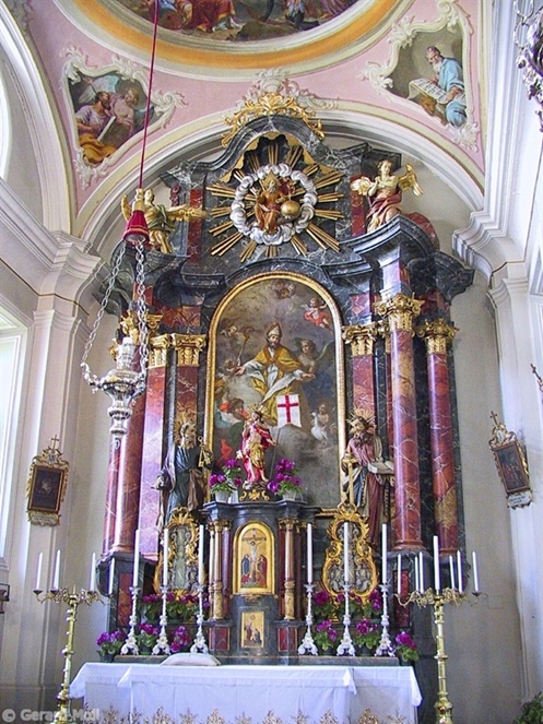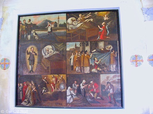 Bild in Lightbox öffnen (open image in lightbox). St. Isidor am Friedhof wurde um 1700 erbaut, Ölgemälde mit Szenen aus dem Leben des Heiligen.