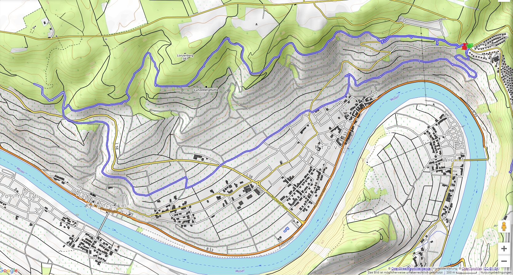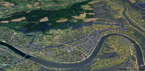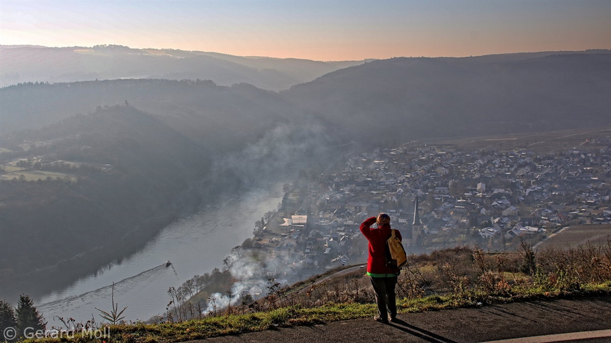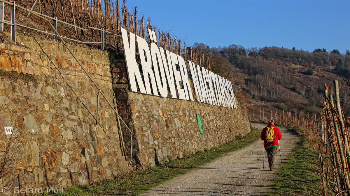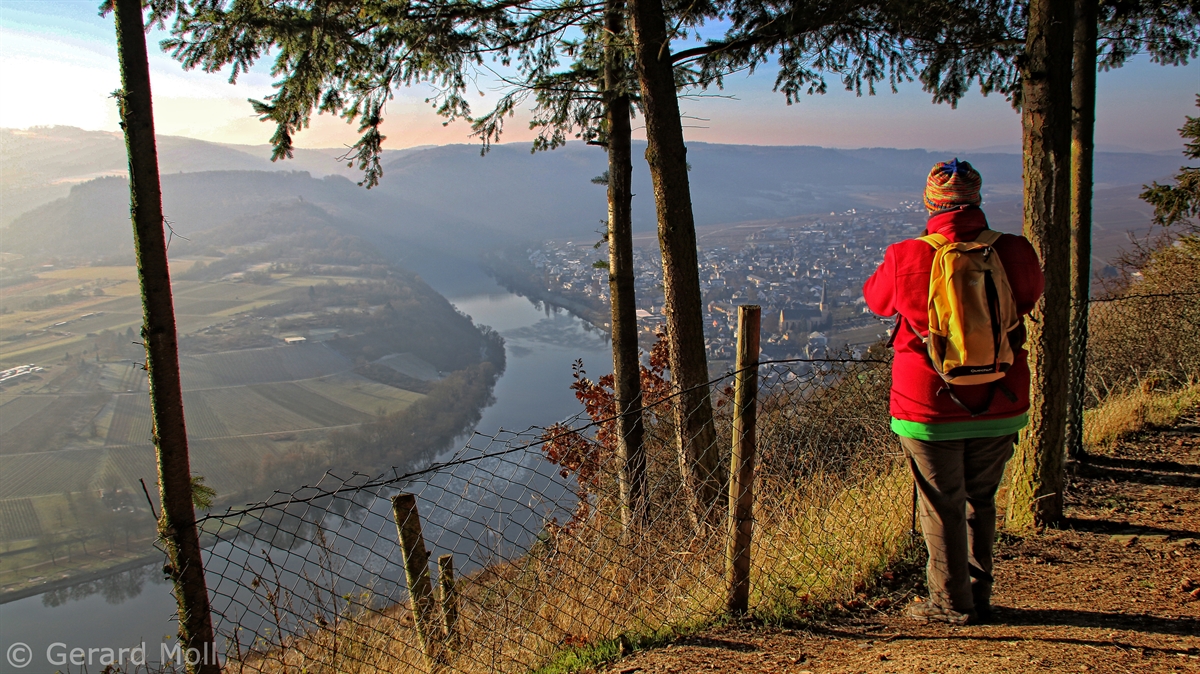 Vom Parkplatz nahe dem Berghof auf dem Mont Royal folgen wir dem Moselhöhenweg, teils am Waldrand, teils durch den Wald, bis zum Mötschenkopf. Ein kleiner Abstecher bringt uns zum Sucellusblick, dann wandern wir durch die Weinberge oberhalb von Kinheim und Kröv und steigen schließlich wieder zum Ausgangspunkt auf.