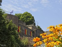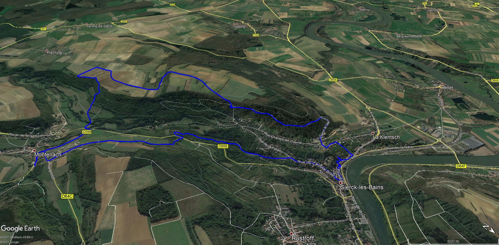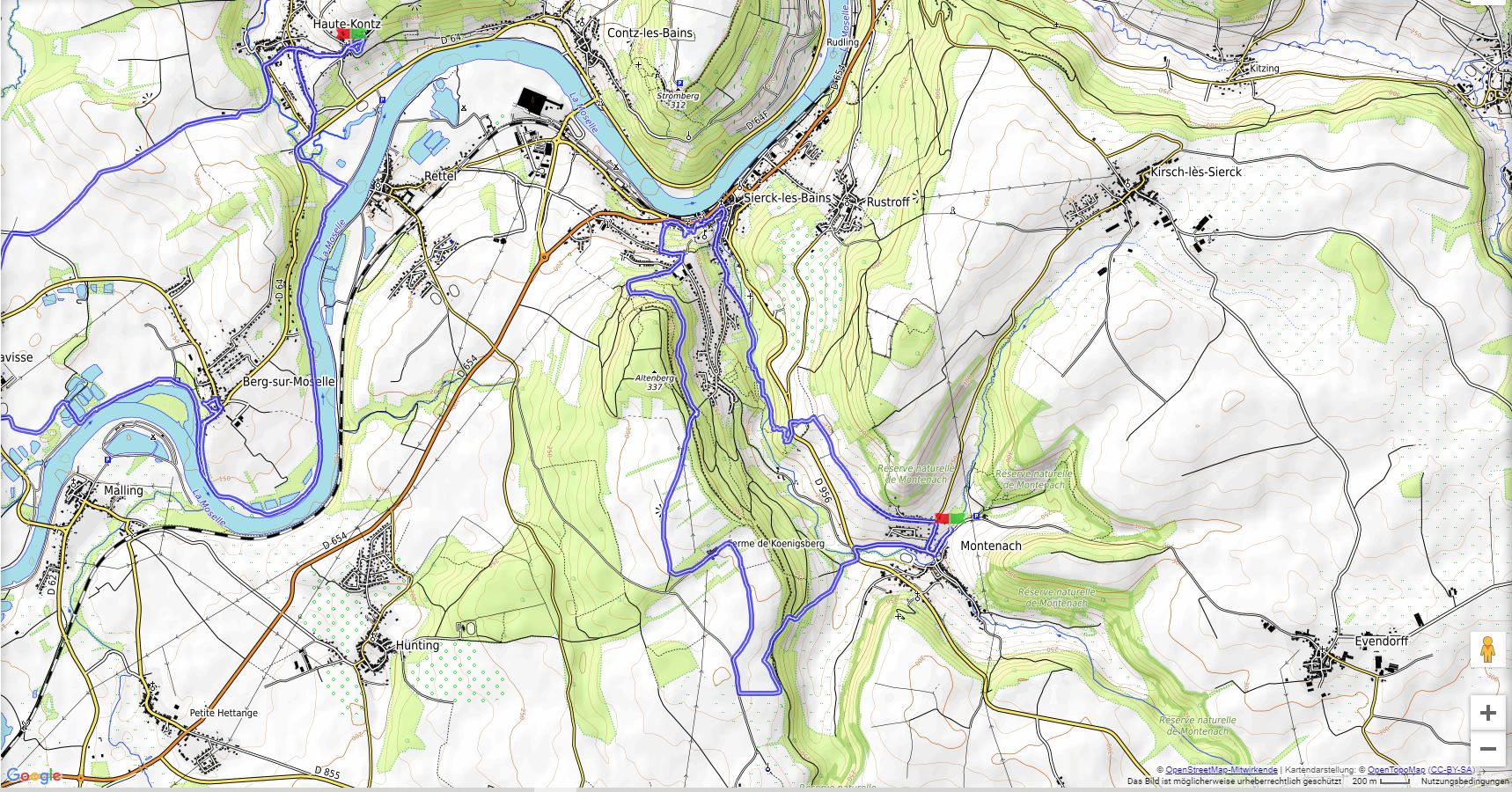 Vom Parkplatz am Haus der Natur in Montenach folgen wir der Beschilderung zum Weiler Koenigsberg. Von hier führt der Weg hinunter zum sehenswerten Ort Sierck-les-Bains am Moselufer mit seiner großen Burganlage. Der Rückweg nach Montenach erfolgt durch das Tal des Montenacher Baches mit seinem Quartzitvorkommen.