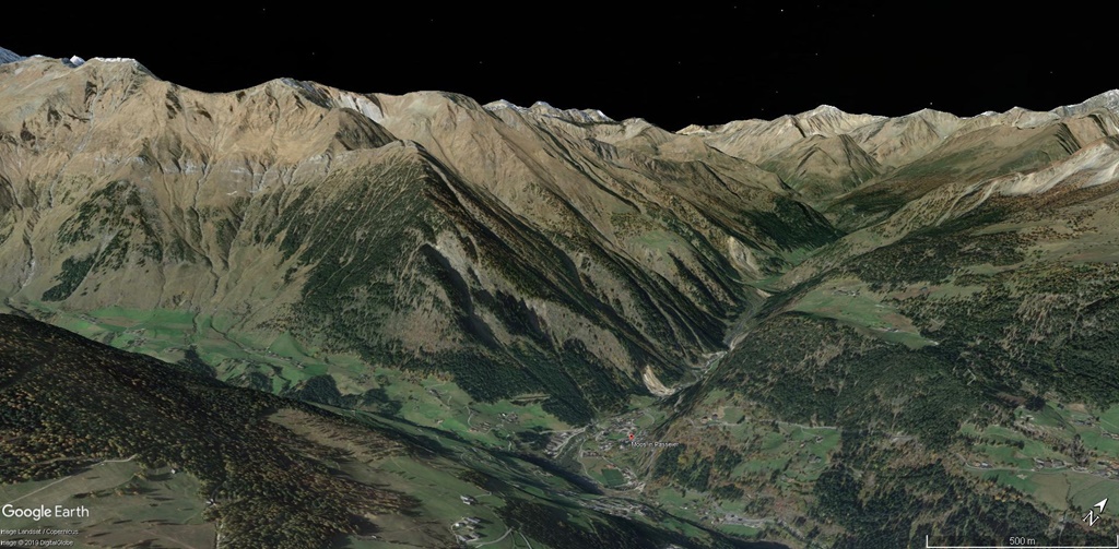 Der Ort Moos liegt westlich von St. Leonhard im Passeiertal vor der Auffahrt zum Timmelsjoch.