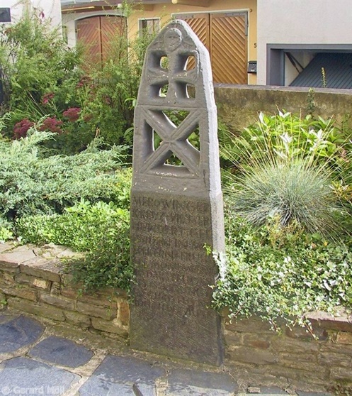 Bild in Lightbox öffnen (open image in lightbox). Bei der Kirche befindet sich eine Kopie des Merowingerkreuzes aus dem 7. Jahrhundert.