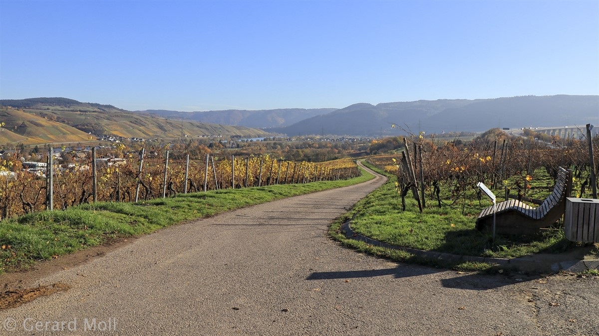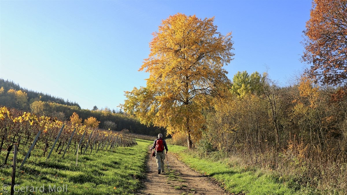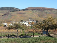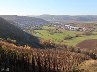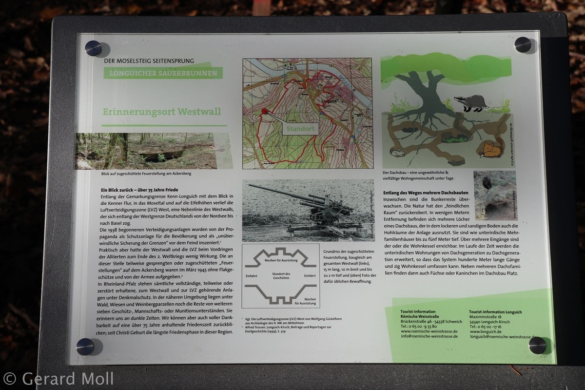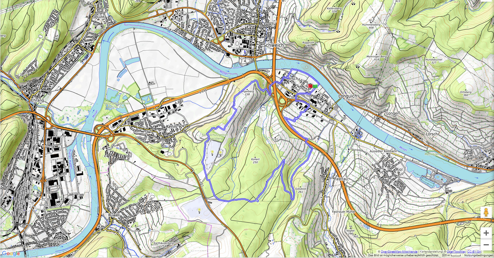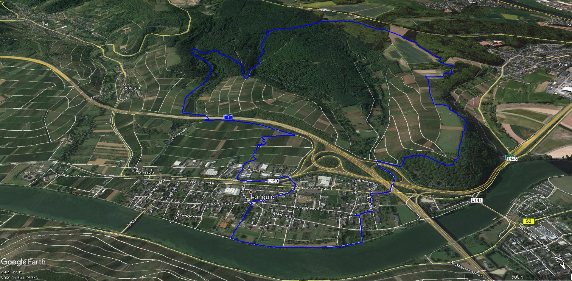 Vom Parkplatz am Kreisverkehr in Longuich gehen wir hinauf zu der Römervilla aus dem 2. Jahrhundert. Nach einer Besichtigung führt der Weg hinter der Villa hinauf in die Weinberge und an der Autobahn entlang bis zu einer Unterführung. Jenseits der Autobahn wandern wir an einem Teich vorbei hinauf in die Wälder und zum Longuicher Sauerbrunnen. Über den Ackersberg gehen wir, mit schöner Aussicht nach Kenn, zum Angelberg und hinunter nach Kirsch. Am Moselufer entlang spazieren wir dann zurück nach Longuich.
