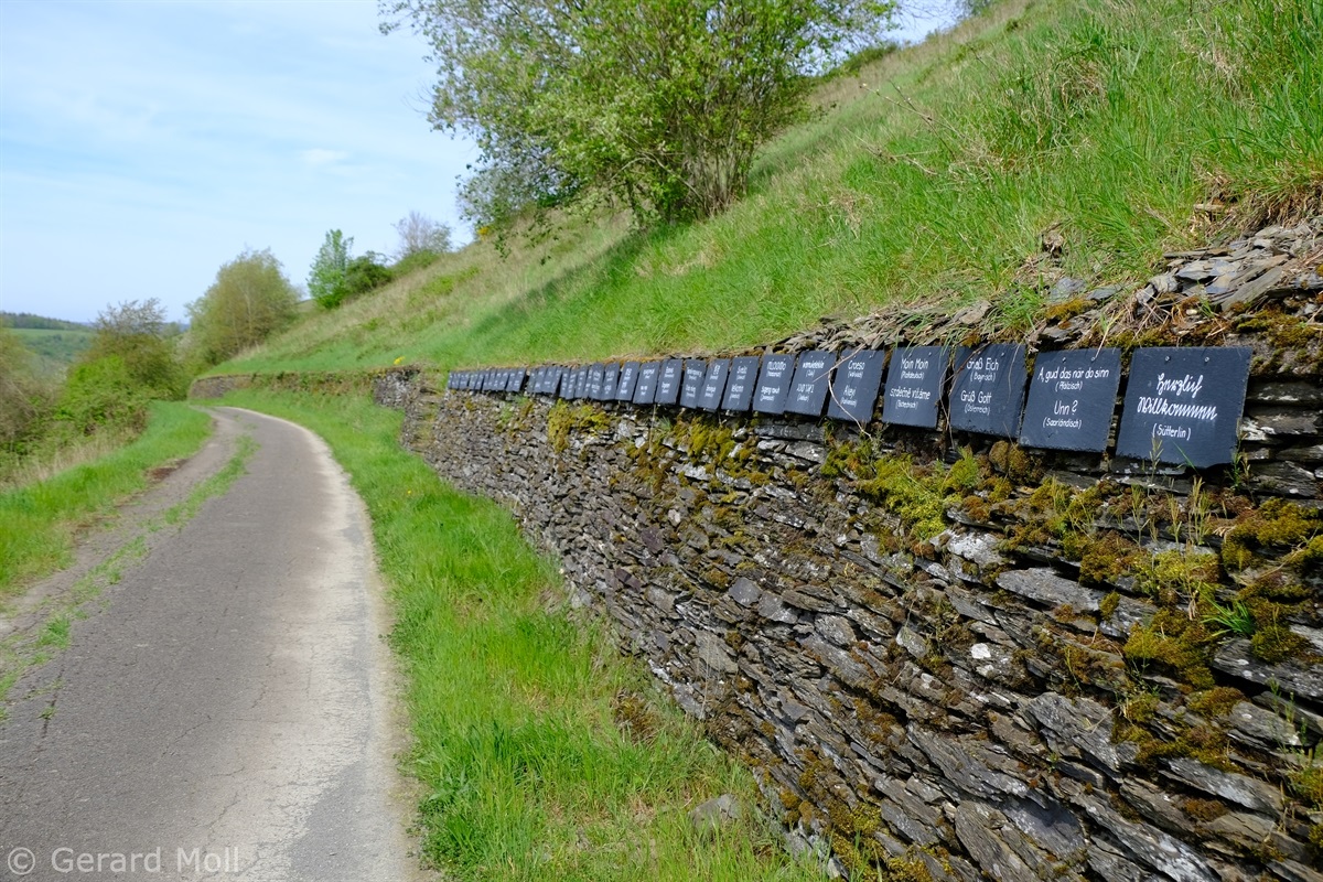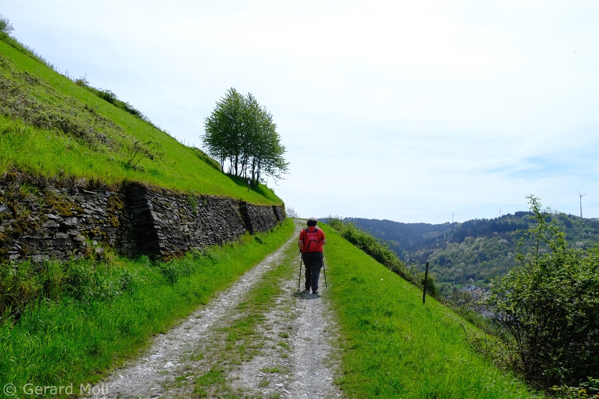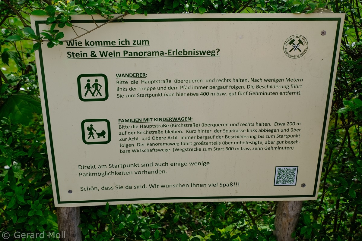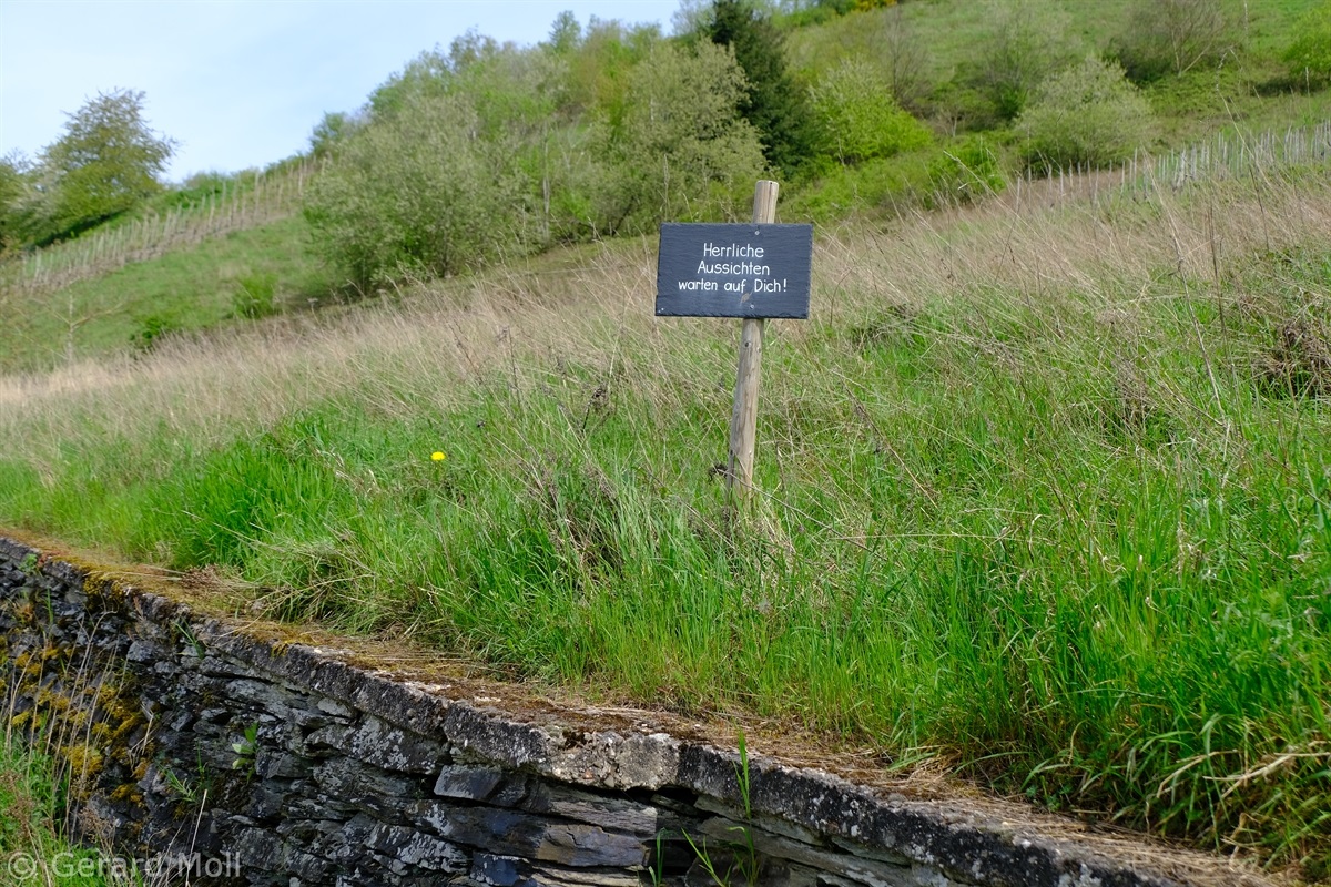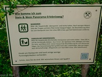 Vom Parkplatz am Sportplatz führt der Weg zunächst steiler hinauf in die Weinberge. Bald erreichen wir den Parkplatz am eigentlichen Beginn der Tour. Der hervorragend angelegte Weg bietet nicht nur ein herrliches Panorama ,sondern überrascht uns immer wieder mit interessanten Tafeln, Zeichnungen und Informationen. An zwei Stellen wird uns die Möglichkeit geboten, Abkürzungen zu folgen, aber es lohnt sich auf alle Fälle, den Weg vollständig zu begehen.