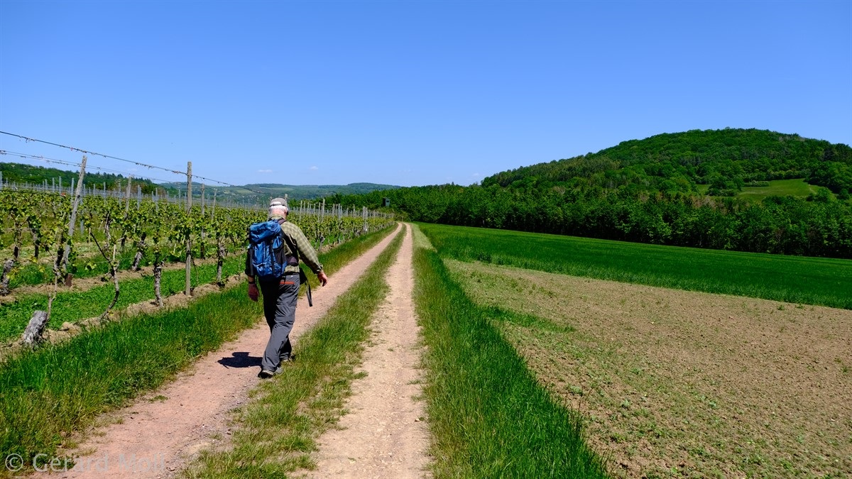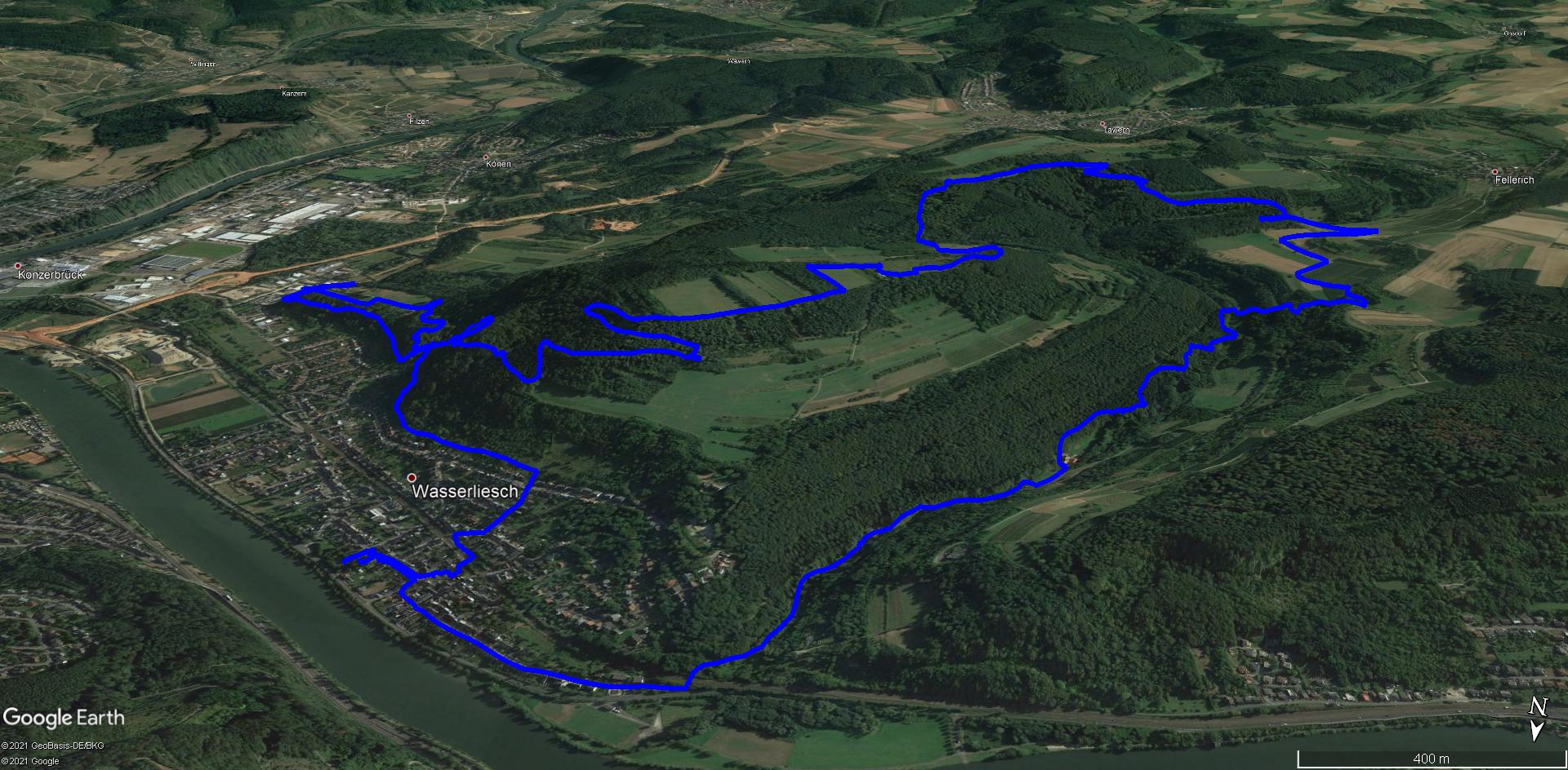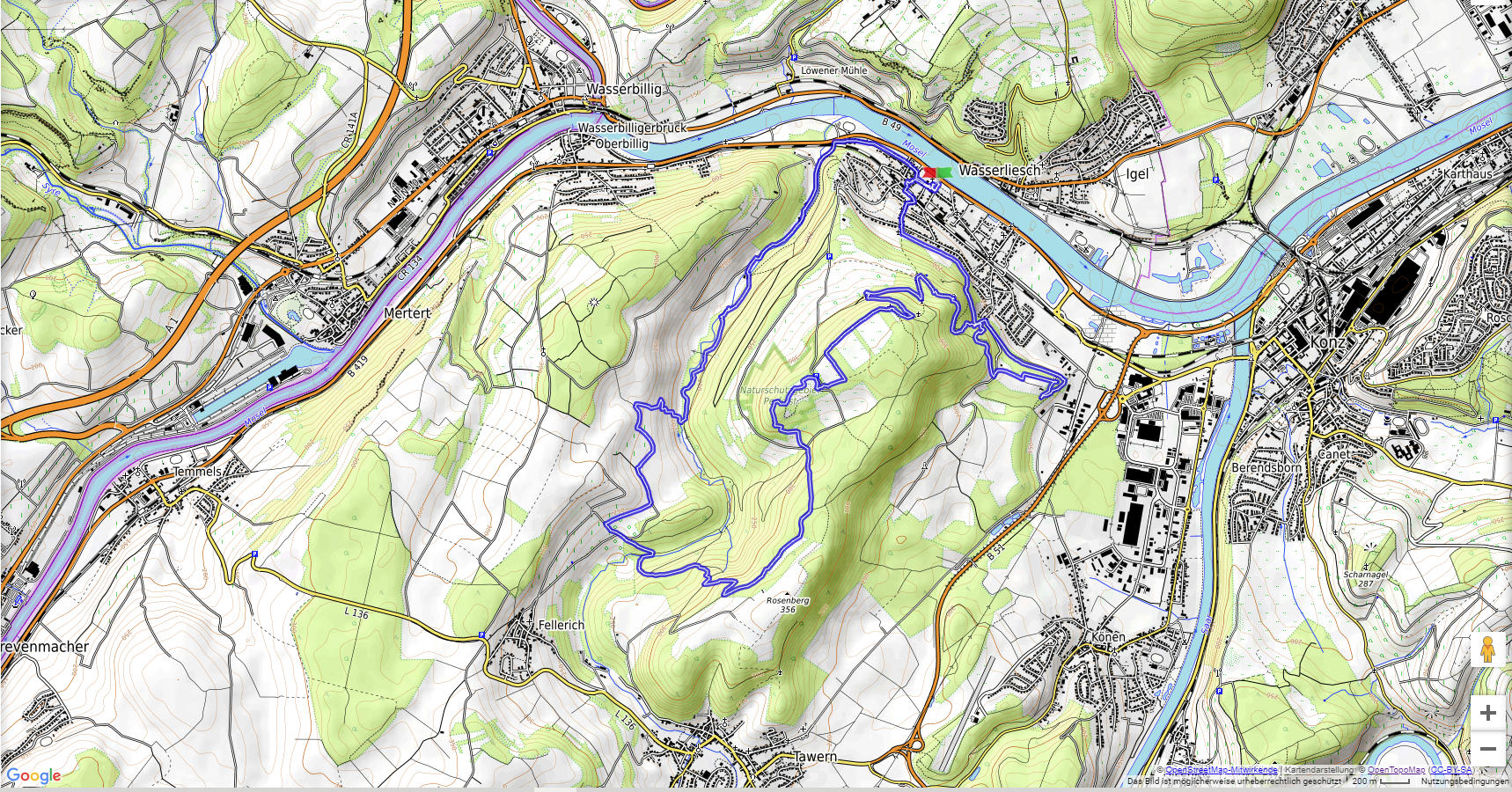 Wir haben an der Kirche St. Aper in Wasserliesch geparkt und sind von dort zum eigentlichen Startpunkt des Weges, durch den Ort spaziert. Unsere erste Zwischenstation ist das Grana-Denkmal, welches an eine Schlacht im Jahre 1675 erinnert. Dann folgt der längste Anstieg der Tour, der uns, vorbei an einer Grillhütte,  zu der herrlich gelegenen Löschemer Kapelle bringt. Von hier haben wir einen tollen Blick auf das gegenüberliegende Igel sowie auf Konz und Trier. Durch das sehenswerte Naturschutzgebiet Perfeist (zahlreiche Orchideenarten) erreichen wir das Alte Lager aus der Römerzeit.  Durch Wald erreichen wir die Felder und Weinberge nahe Fellerich. Durch das wildromantische Albachtal kehren wir nach Wasserliesch zurück.