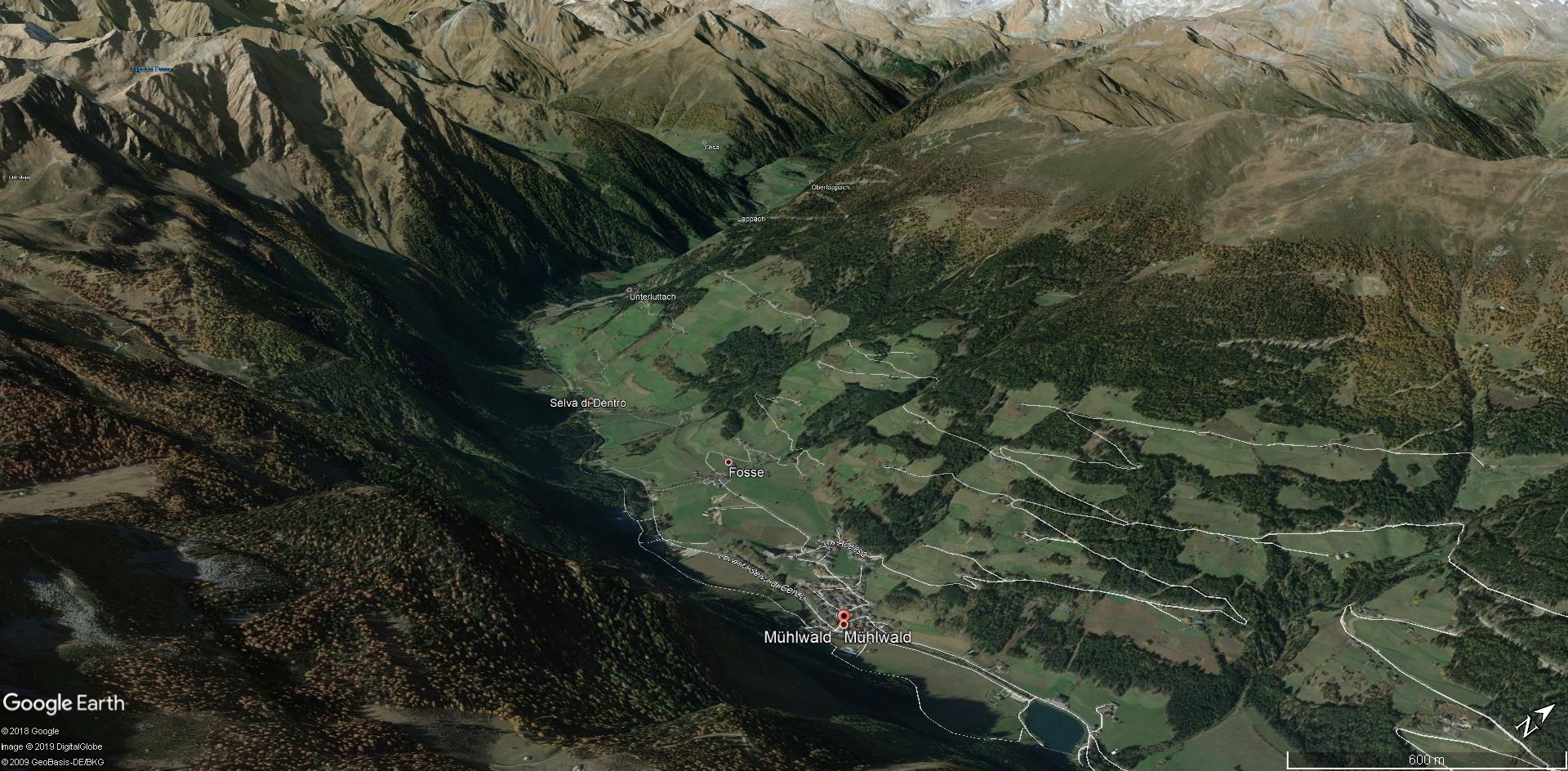 Mühlwald liegt in der Mitte des gleichnamigen Tales, das vom Tauferer Tal in westliche Richtung zum Nevesstausee zieht.