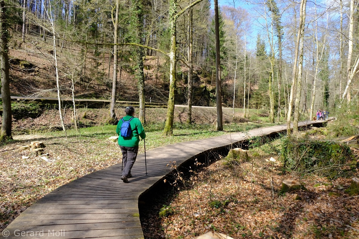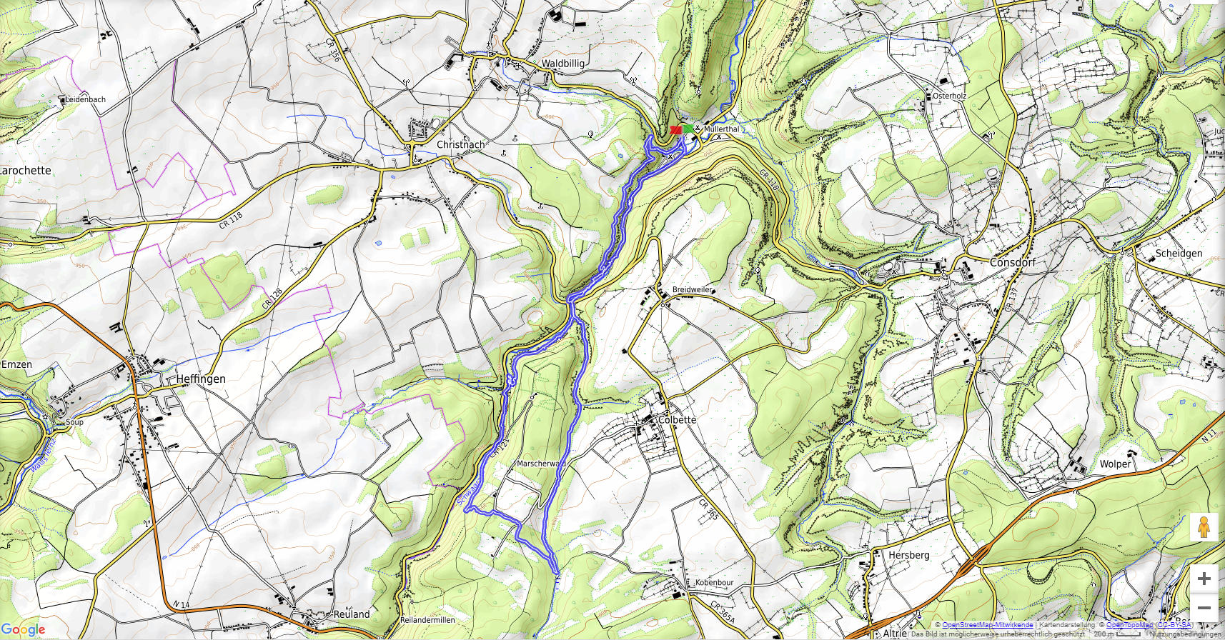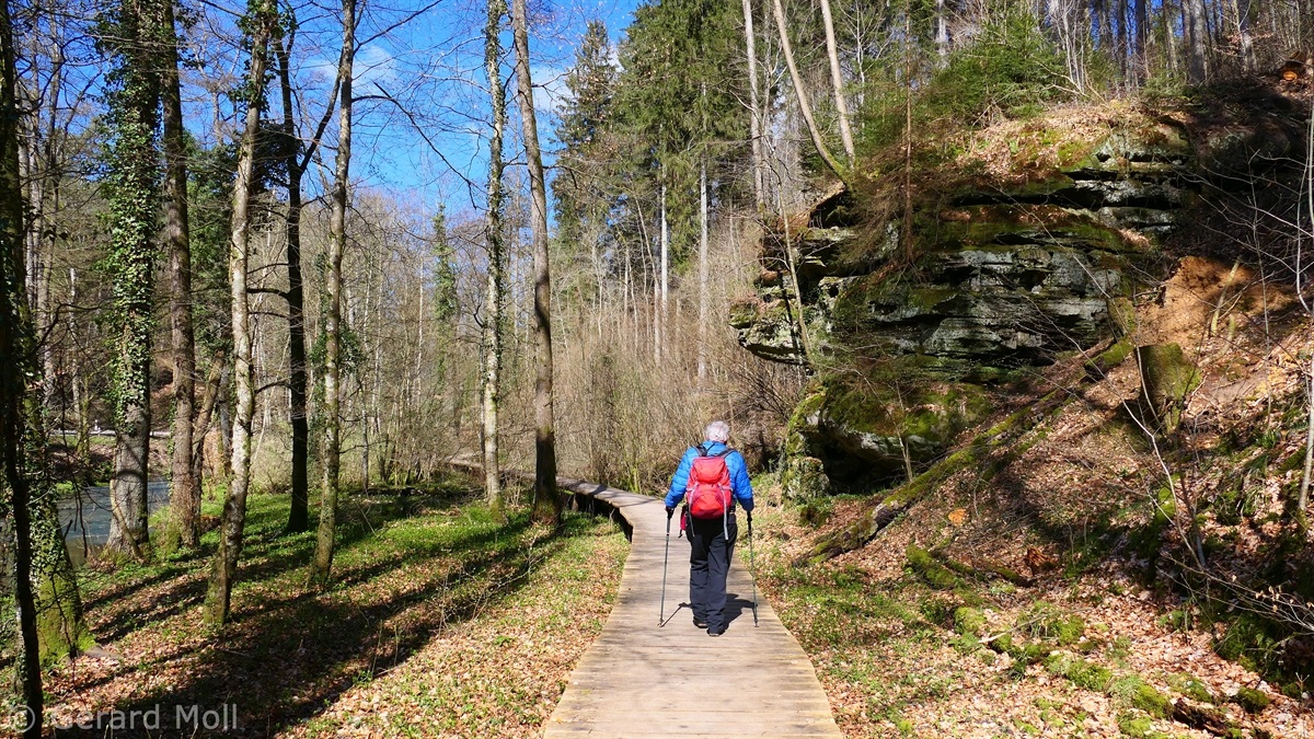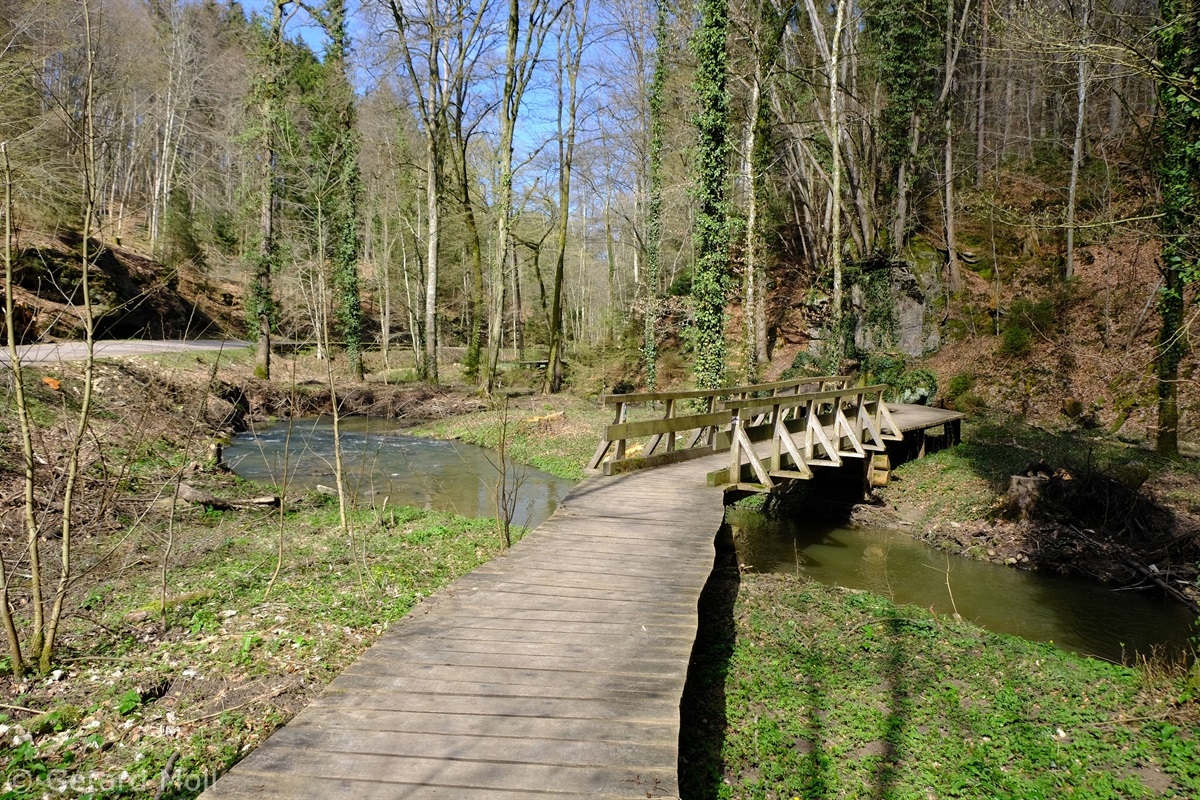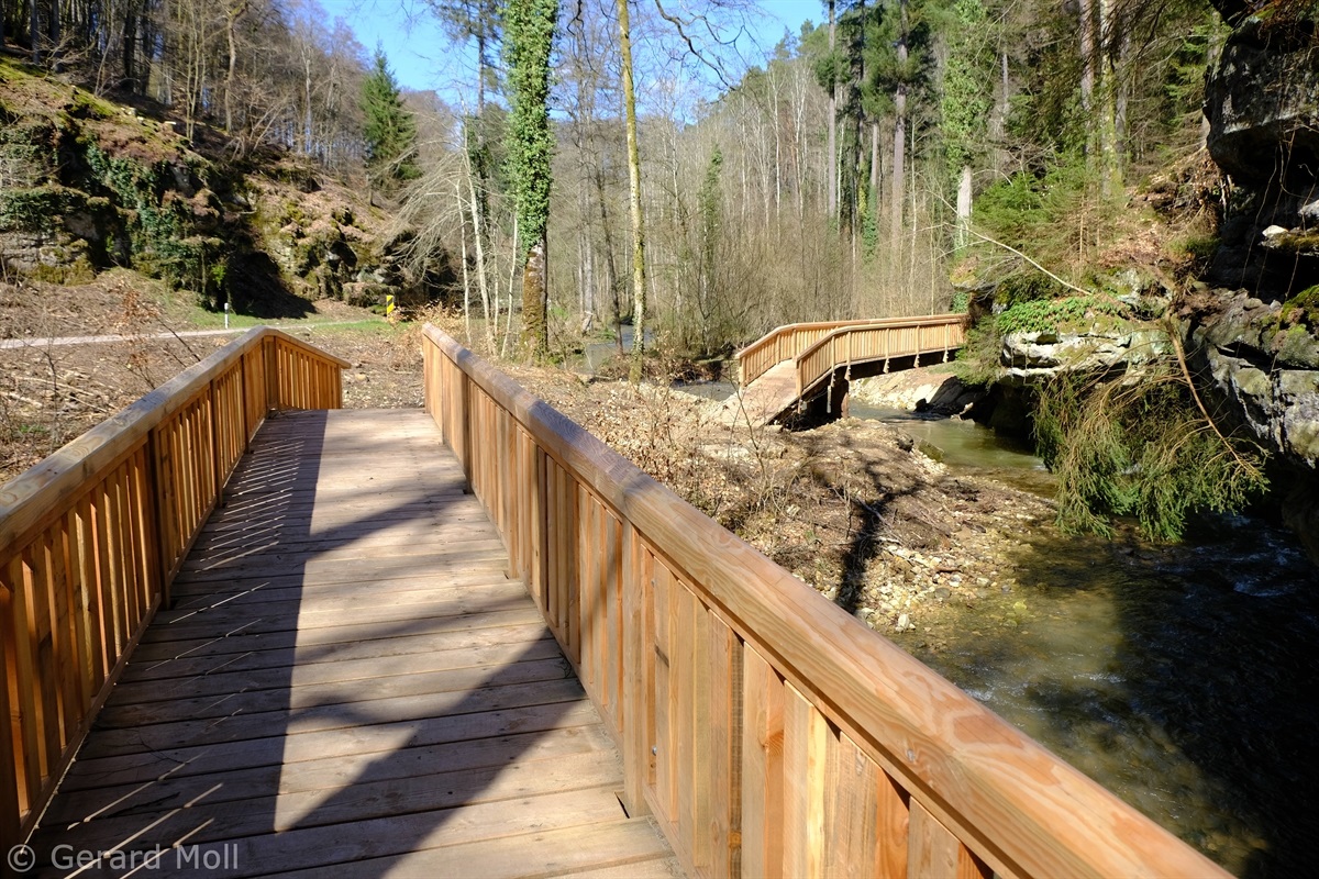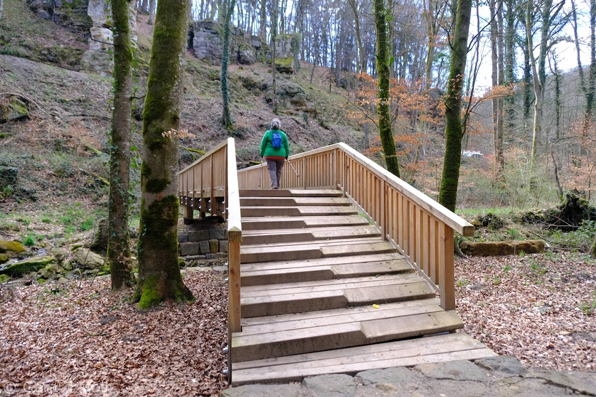Vom Parkplatz an der Heringer Mühle geht es zuerst steiler bergauf, dann queren wir zu einer Strassenkreuzung und wandern hinauf in den Marscherwald. Nachdem wir wieder die Schwarze Ernz erreicht haben führt uns ein Holzsteg zu den sehenswerten Kalktuffquellen, die auch im Winter sehr fotogen sind, wenn sie zugefroren sind. An dem bekannten Schiessentümpel vorbei kehren wir zur Heringer Mühle zurück.