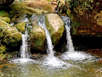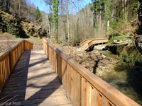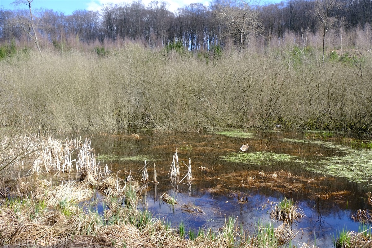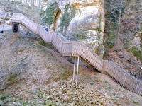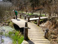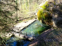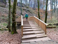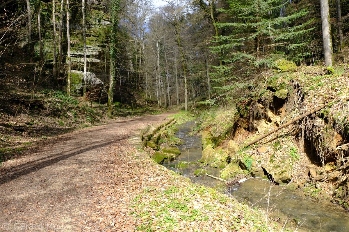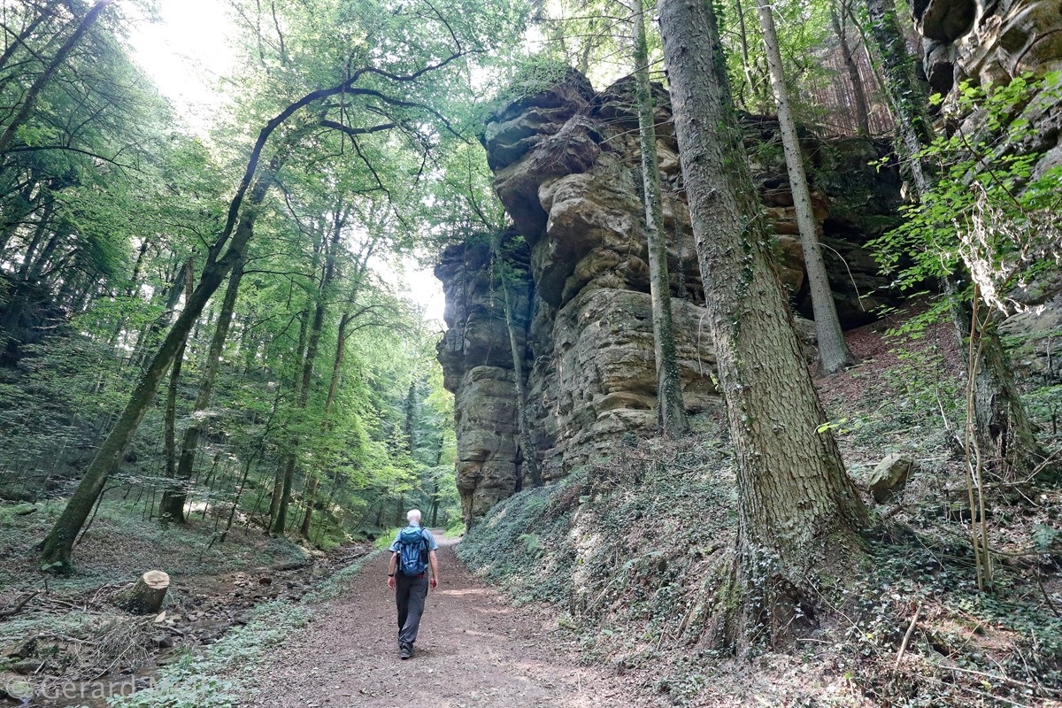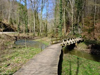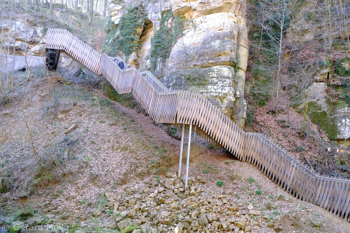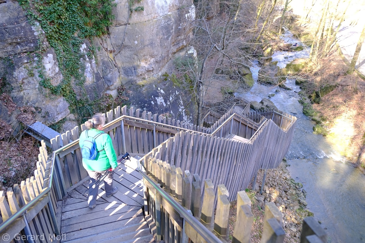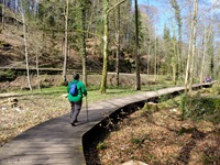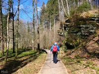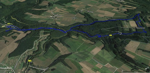 Vom Parkplatz an der Heringer Mühle geht es zuerst steiler bergauf, dann queren wir zu einer Strassenkreuzung und wandern hinauf in den Marscherwald. Nachdem wir wieder die Schwarze Ernz erreicht haben führt uns ein Holzsteg zu den sehenswerten Kalktuffquellen, die auch im Winter sehr fotogen sind, wenn sie zugefroren sind. An dem bekannten Schiessentümpel vorbei kehren wir zur Heringer Mühle zurück.