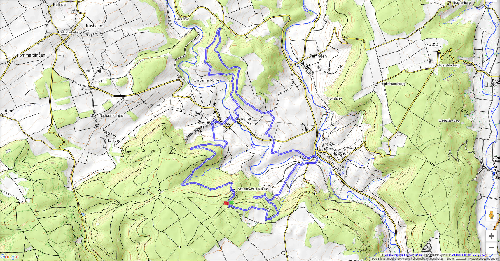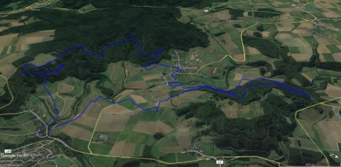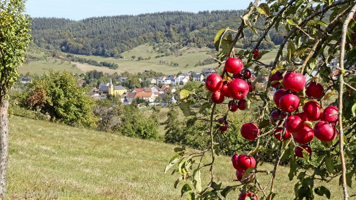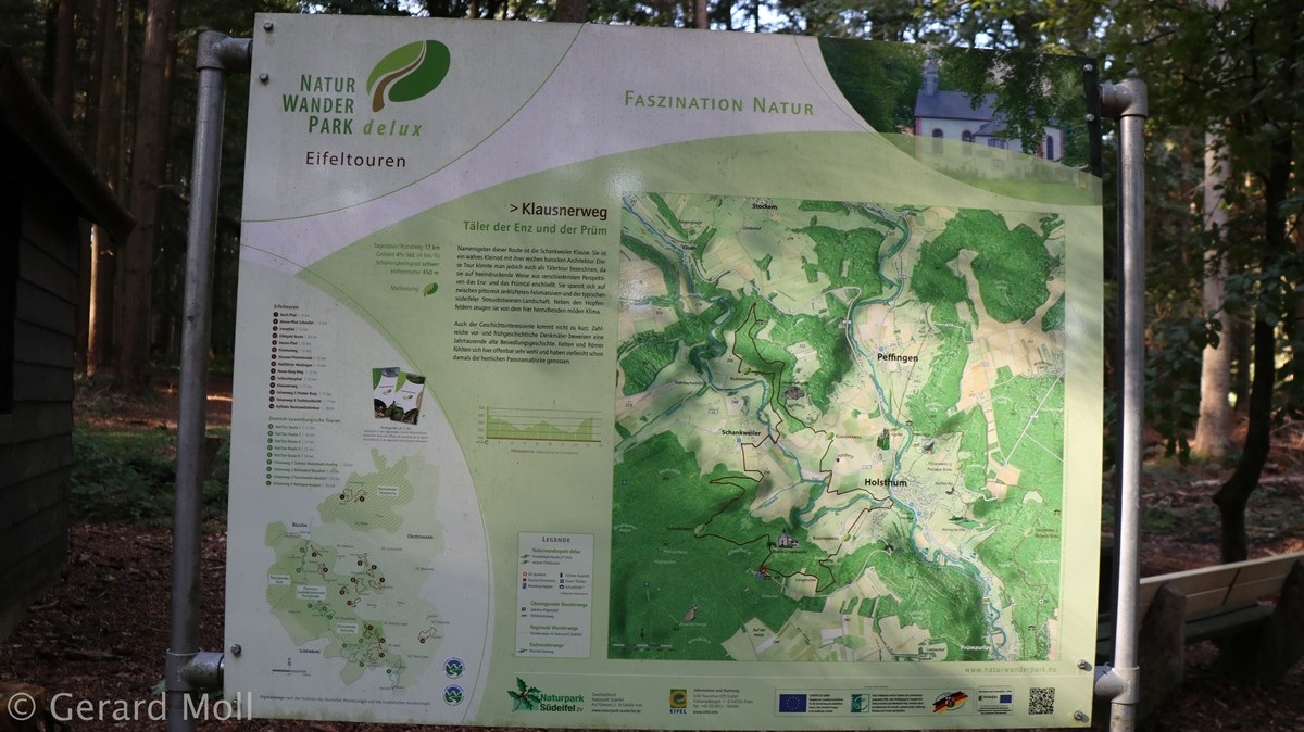 Vom Wanderparkplatz im Wald bei Holsthum ist es nicht weit zum ersten Höhepunkt der Tour: Die barocke Schankweiler Klause wurde 1732 vom Tiroler Baumeister Joseph Dangel errichtet. Durch Wald und über Felder erreichen wir den Ort Schankweiler, wo wir die Enz überschreiten. Am Hartberg vorbei kommen wir nach Holsthum und von dort über Streuobstwiesen zurück in den Wald nahe der Klause. Hier gibt es noch ein römisches Gräberfeld und den Langenstein, einen Menhir, zu sehen.