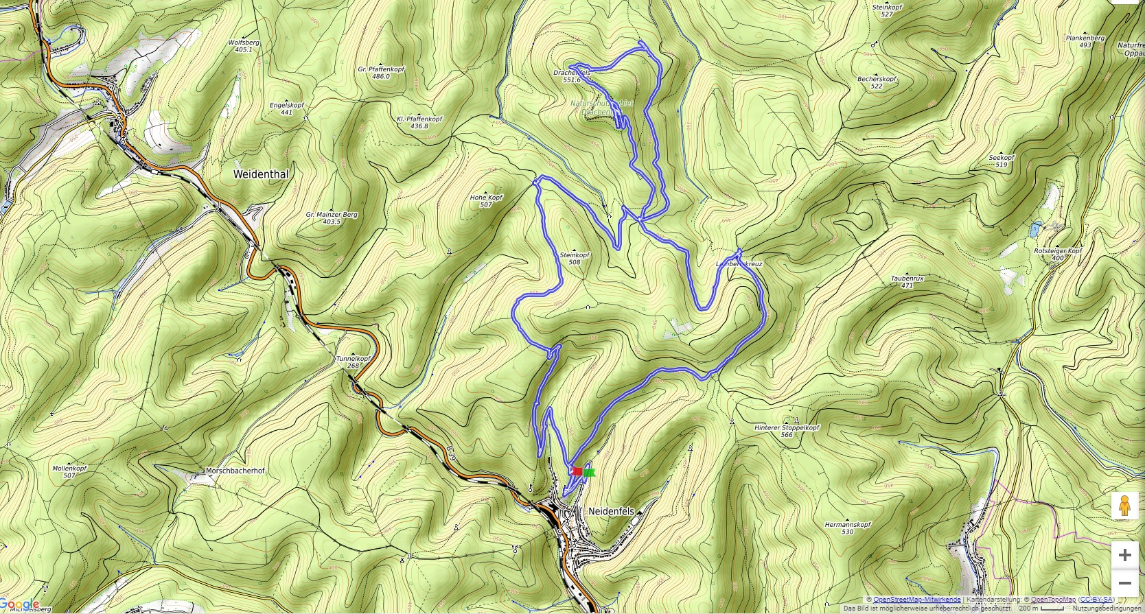 Unsere Tour startet in Neidenfels mit dem Aufstieg zur Ruine Neidenfels. Am Lambertskreuz erwartet uns eine Hütte des Pfälzerwald-Vereins, dann steigen wir auf den Drachenfels. Über eine Unterstandshütte (Potaschhütte) wandern wir zurück nach Neidenfels.