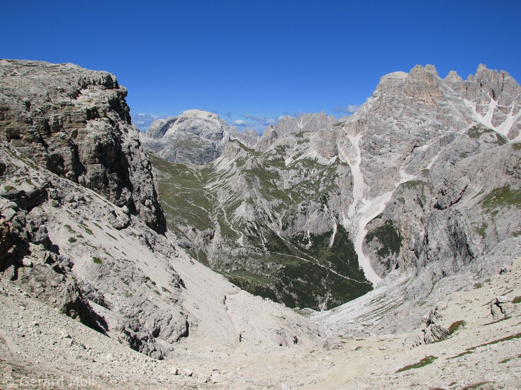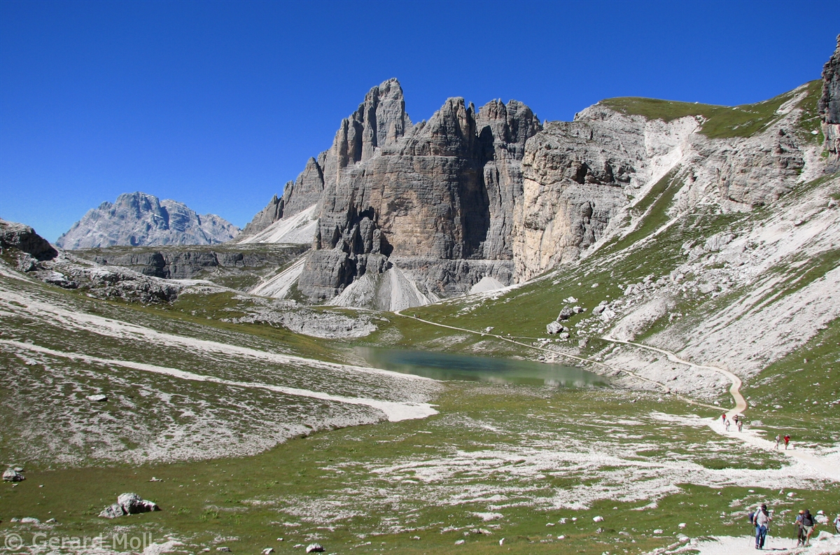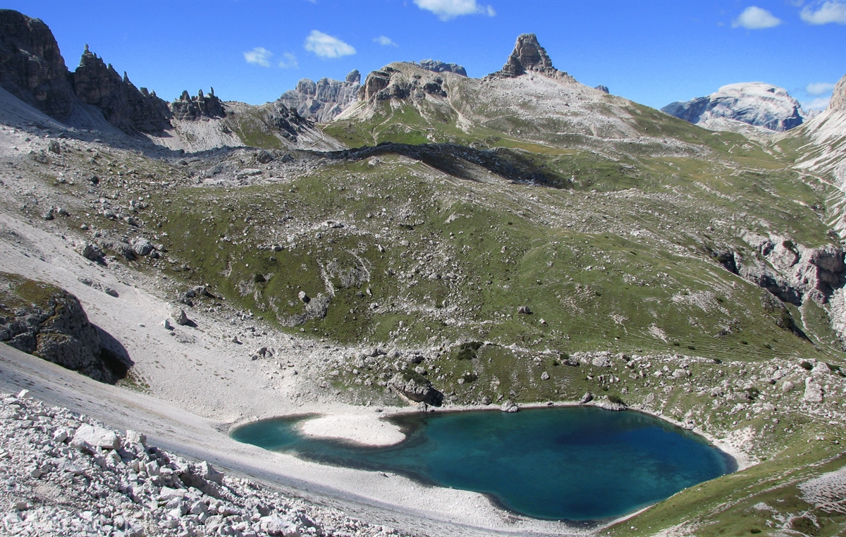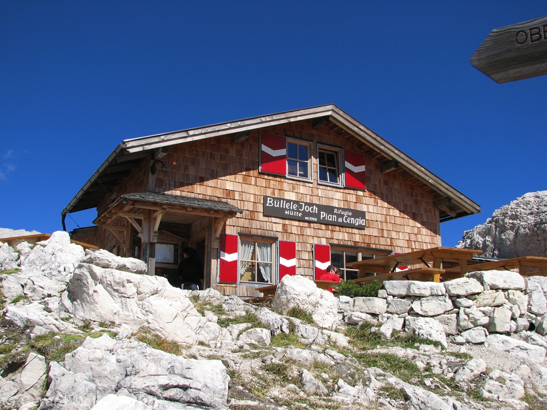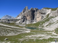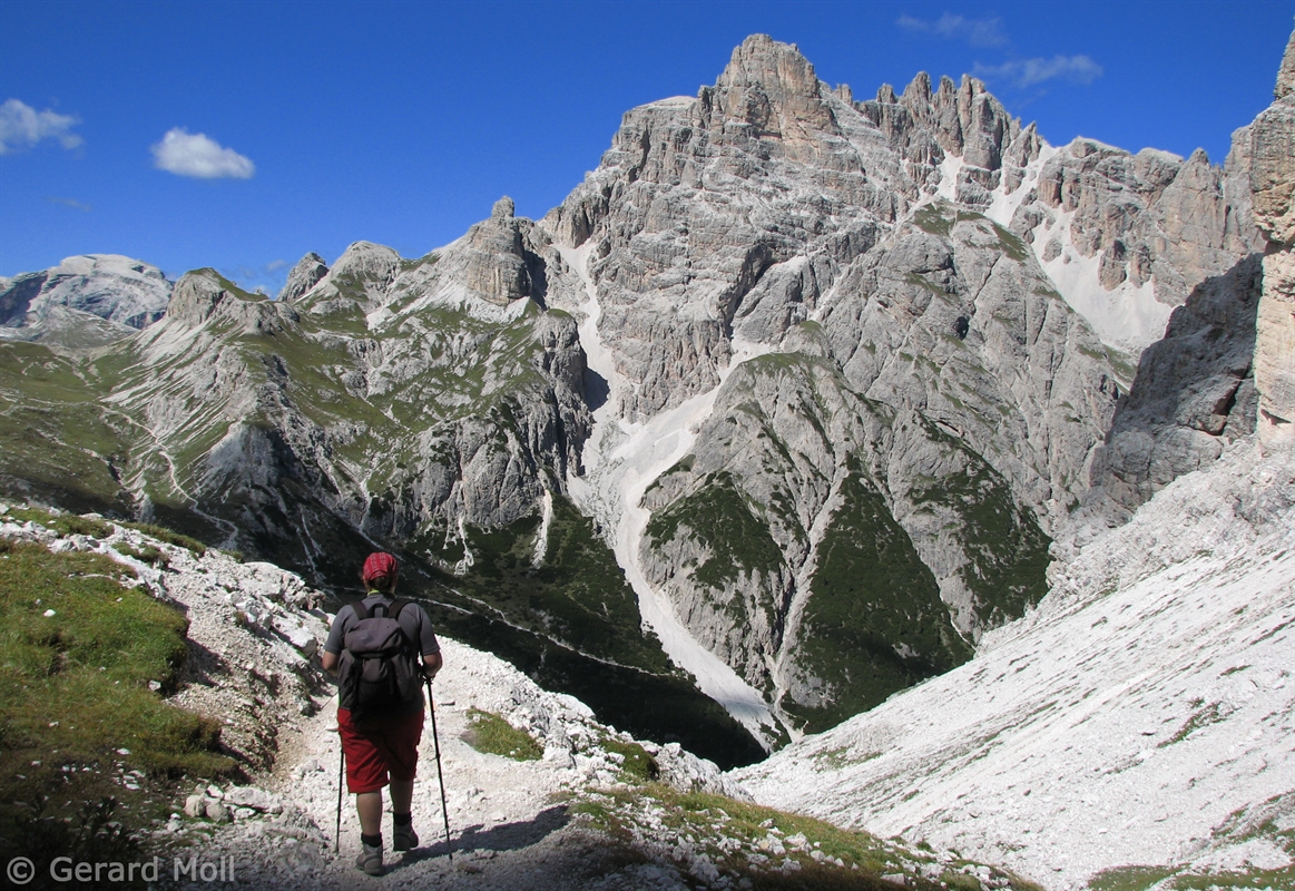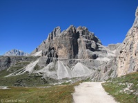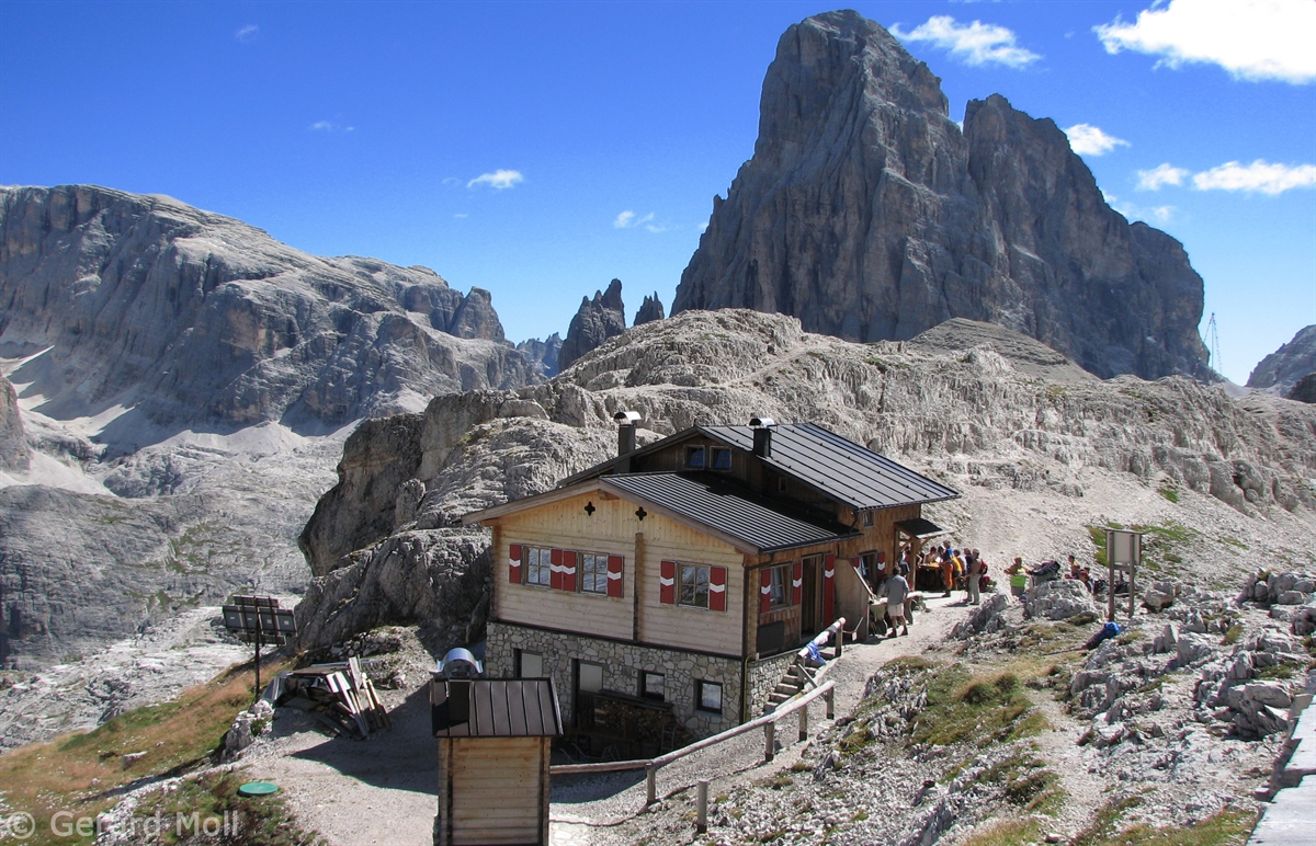 Vom Parkplatz (2320 m) am Ende der Mautstrasse zur Auronzohütte folgen wir den Menschenmassen zum Paternsattel. Kurz vor dem Sattel zweigen wir nach rechts ab und wandern zur Büllelejochhütte (2528 m). Der Gipfel der Obernbacherspitze (2675 m) ist schnell und unschwierig erreicht, dann geht es zurück zur Hütte. An der Nordflanke des Paternkofel vorbei queren wir zur Drei-Zinnenhütte (2405 m) und kehren über den Paternsattel zurück zur Auronzohütte.