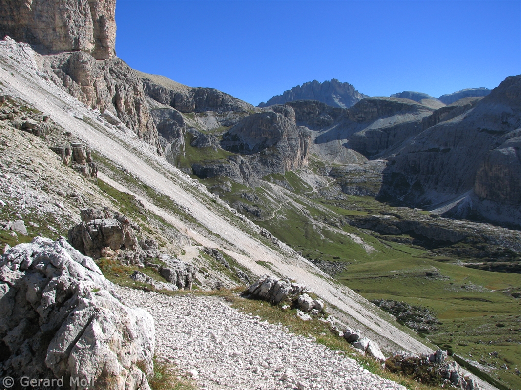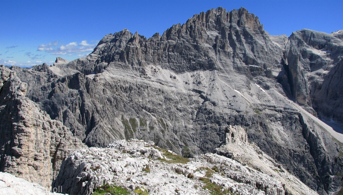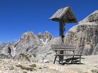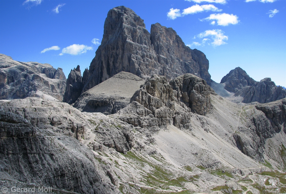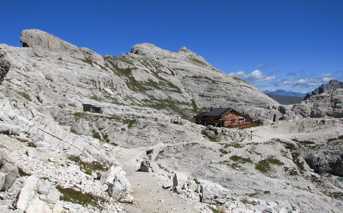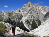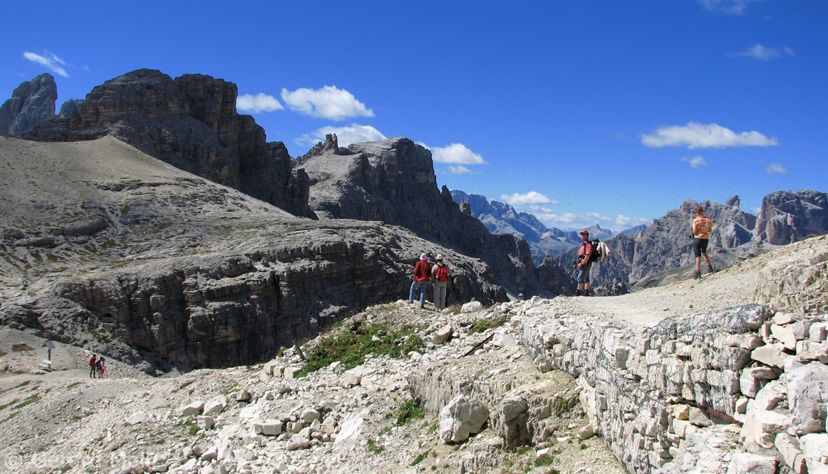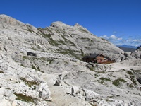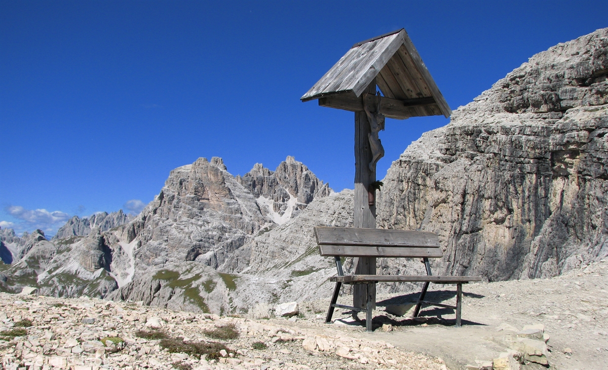 Vom Parkplatz (2320 m) am Ende der Mautstrasse zur Auronzohütte folgen wir den Menschenmassen zum Paternsattel. Kurz vor dem Sattel zweigen wir nach rechts ab und wandern zur Büllelejochhütte (2528 m). Der Gipfel der Obernbacherspitze (2675 m) ist schnell und unschwierig erreicht, dann geht es zurück zur Hütte. An der Nordflanke des Paternkofel vorbei queren wir zur Drei-Zinnenhütte (2405 m) und kehren über den Paternsattel zurück zur Auronzohütte.