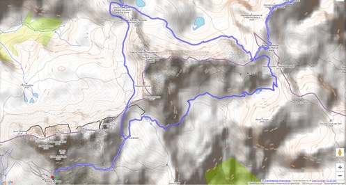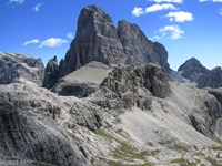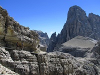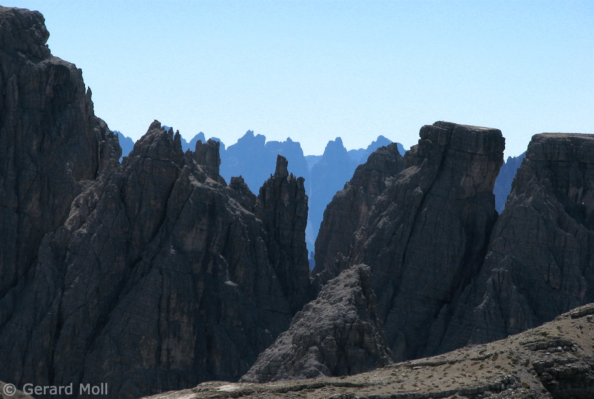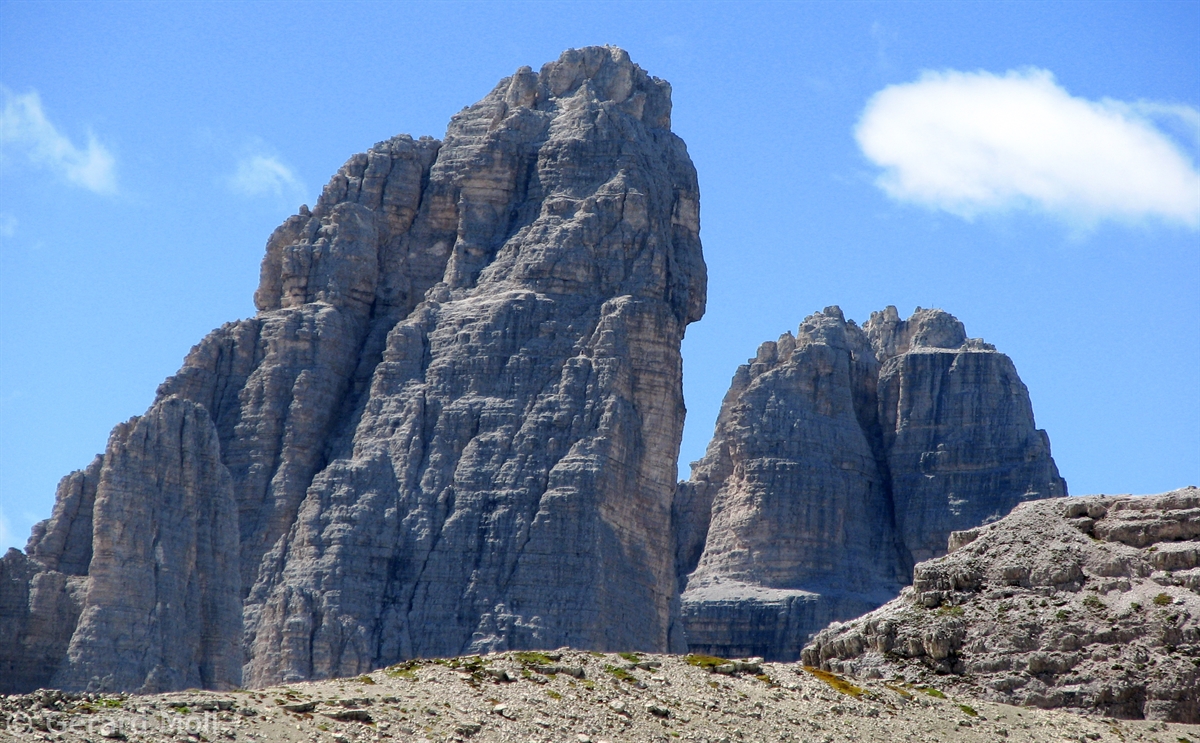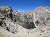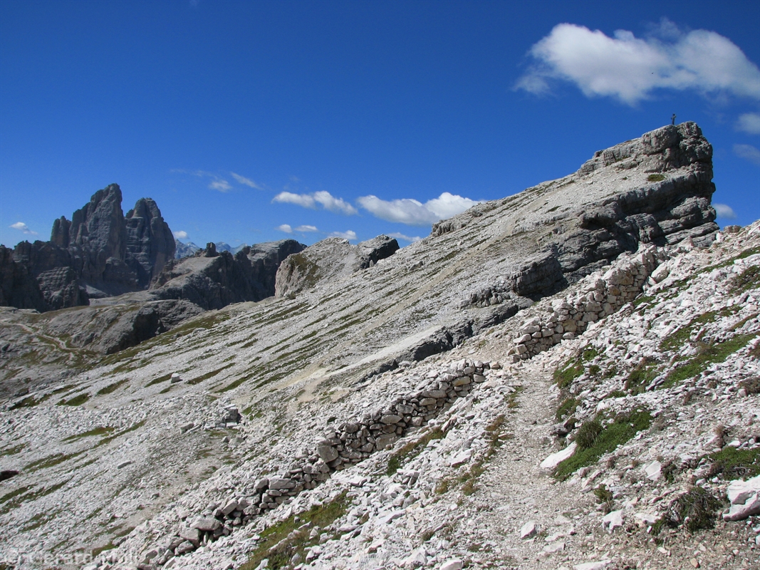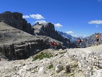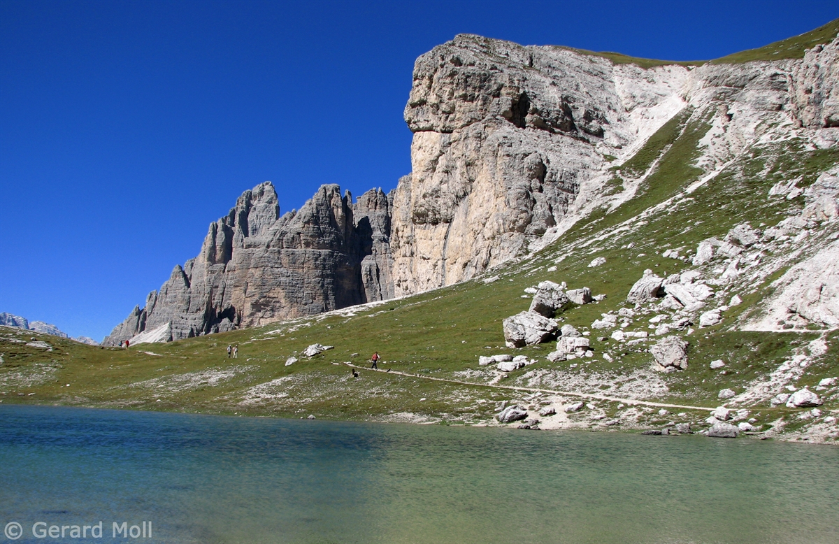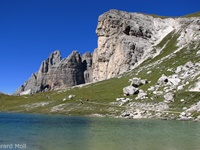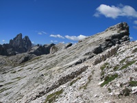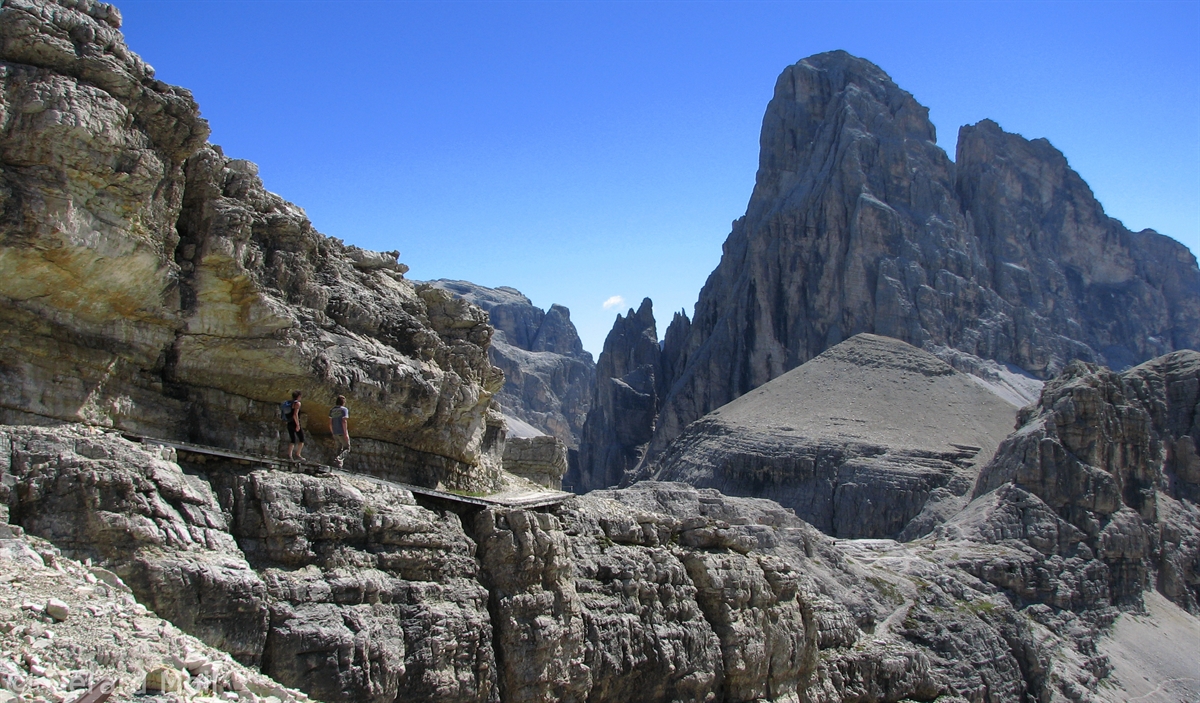 Vom Parkplatz (2320 m) am Ende der Mautstrasse zur Auronzohütte folgen wir den Menschenmassen zum Paternsattel. Kurz vor dem Sattel zweigen wir nach rechts ab und wandern zur Büllelejochhütte (2528 m). Der Gipfel der Obernbacherspitze (2675 m) ist schnell und unschwierig erreicht, dann geht es zurück zur Hütte. An der Nordflanke des Paternkofel vorbei queren wir zur Drei-Zinnenhütte (2405 m) und kehren über den Paternsattel zurück zur Auronzohütte.