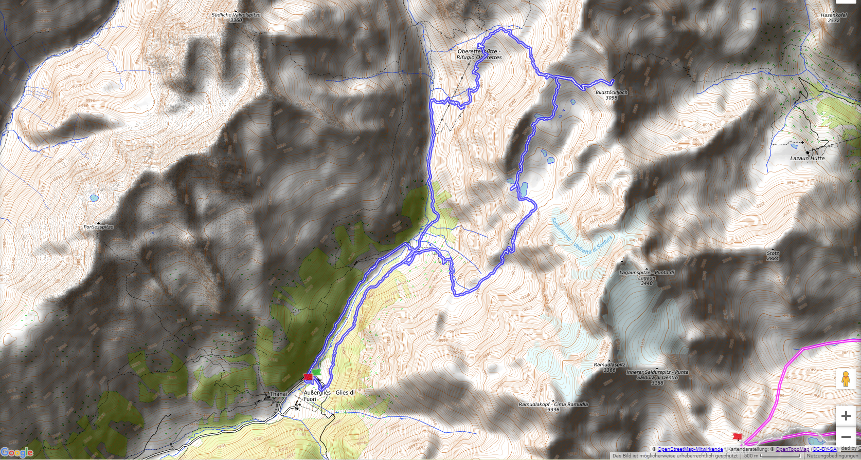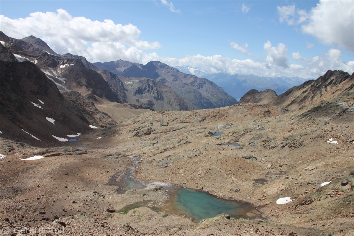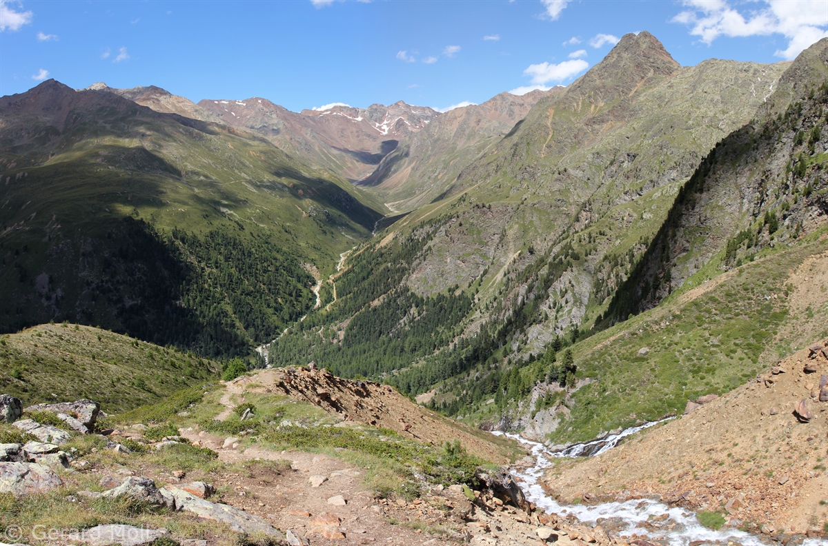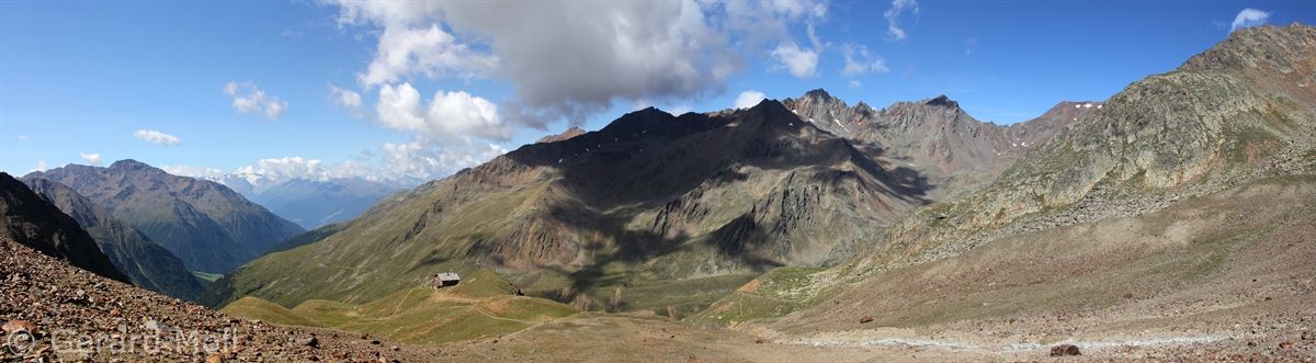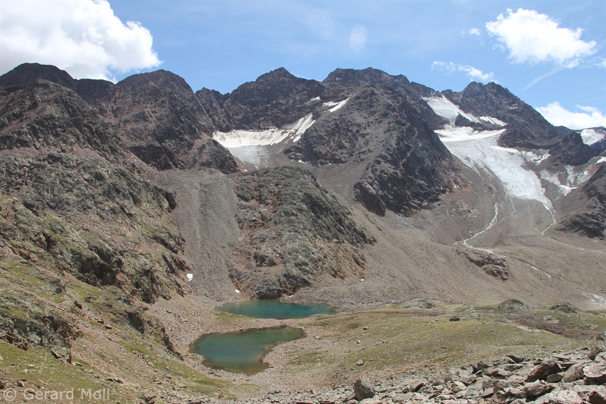 Im Matschertal kann man bis zu den Glieshöfen (1827 m) fahren. Von hier führt der Weg taleinwärts an der Matscher Alm vorbei, dann steiler hinauf bis zu der Oberetteshütte (2670 m). Der Weiterweg führt durch eine sehr abweisend aussehende, schuttige Flanke, aufatmend erreicht man das Plateau der Saldurseen. Wer noch über überschüssige Kräfte verfügt, kann noch den Abstecher zum Bildstöckljoch (3097 m) machen, der Blick ins Schnalstal belohnt einen für die Mühe. Dann gehen wir an den Saldurseen vorbei durch herrliches Gelände, bis der Weg wieder nach unten zur Inneren Matscher Alm und zum Glieshof führt.