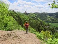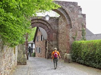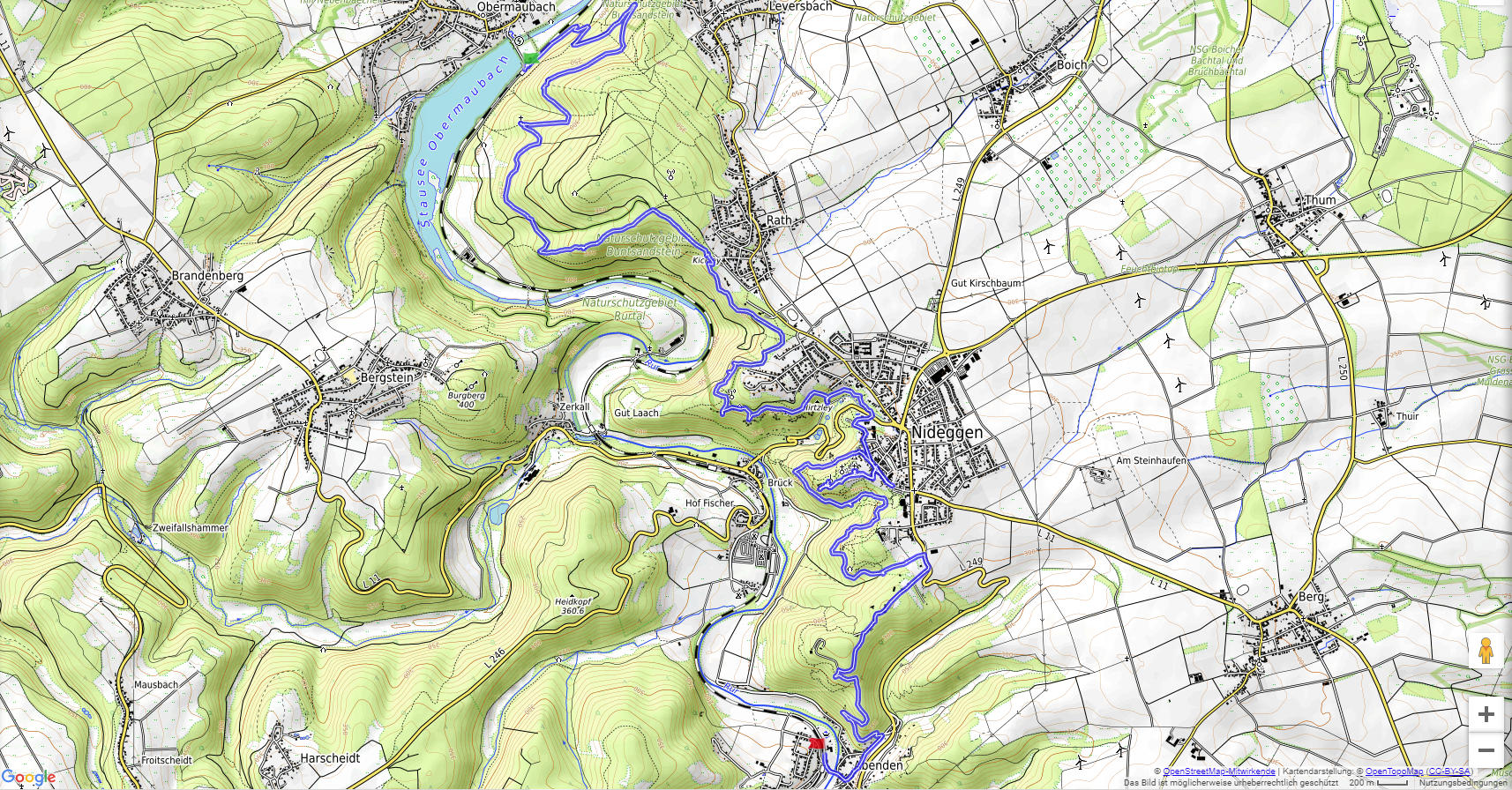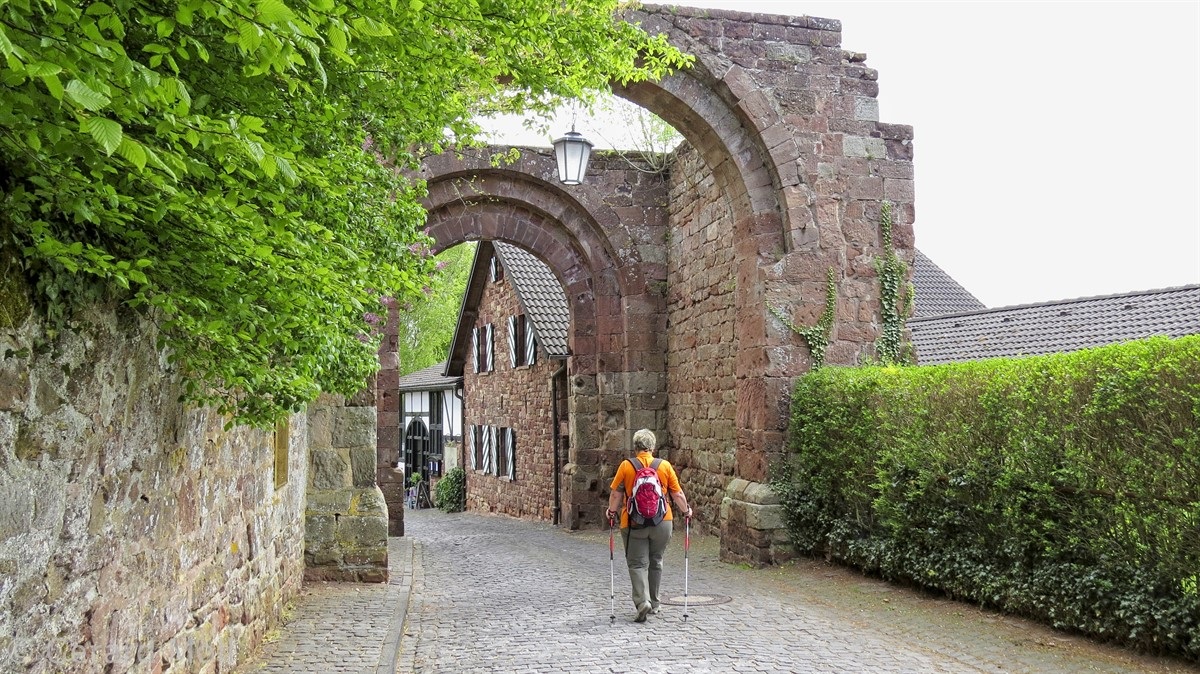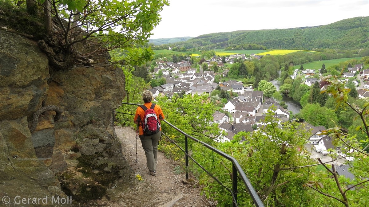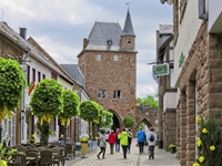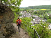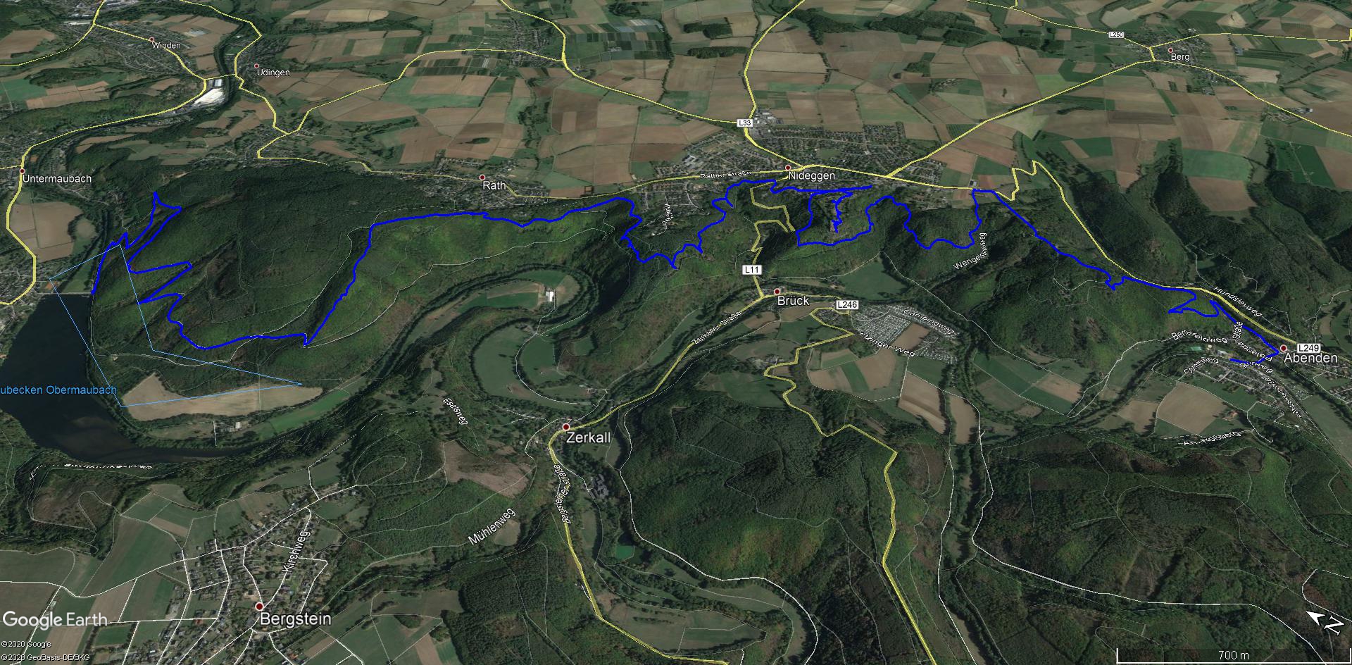 Die Bahn bringt uns entlang der Rur von Abenden nach Obermaubach. Östlich des Staubeckens steigen wir hinauf zur Höhe und vorbei am Eugenienstein wandern wir mit herrlichen Ausblicken über den Höhenzug. Durch das spektakuläre Hindenburgtor kommen wir nach Nideggen und besichtigen das schöne Städtchen mit seinen Stadttoren und der riesigen Burg. An interessanten Felsformationen vorbei erreichen wir Abenden.