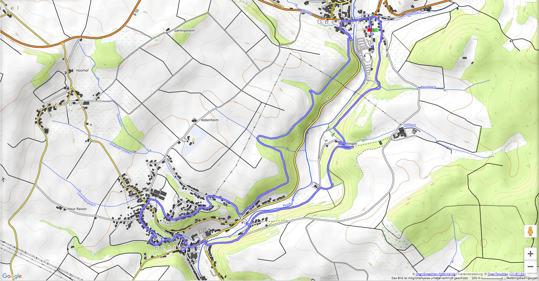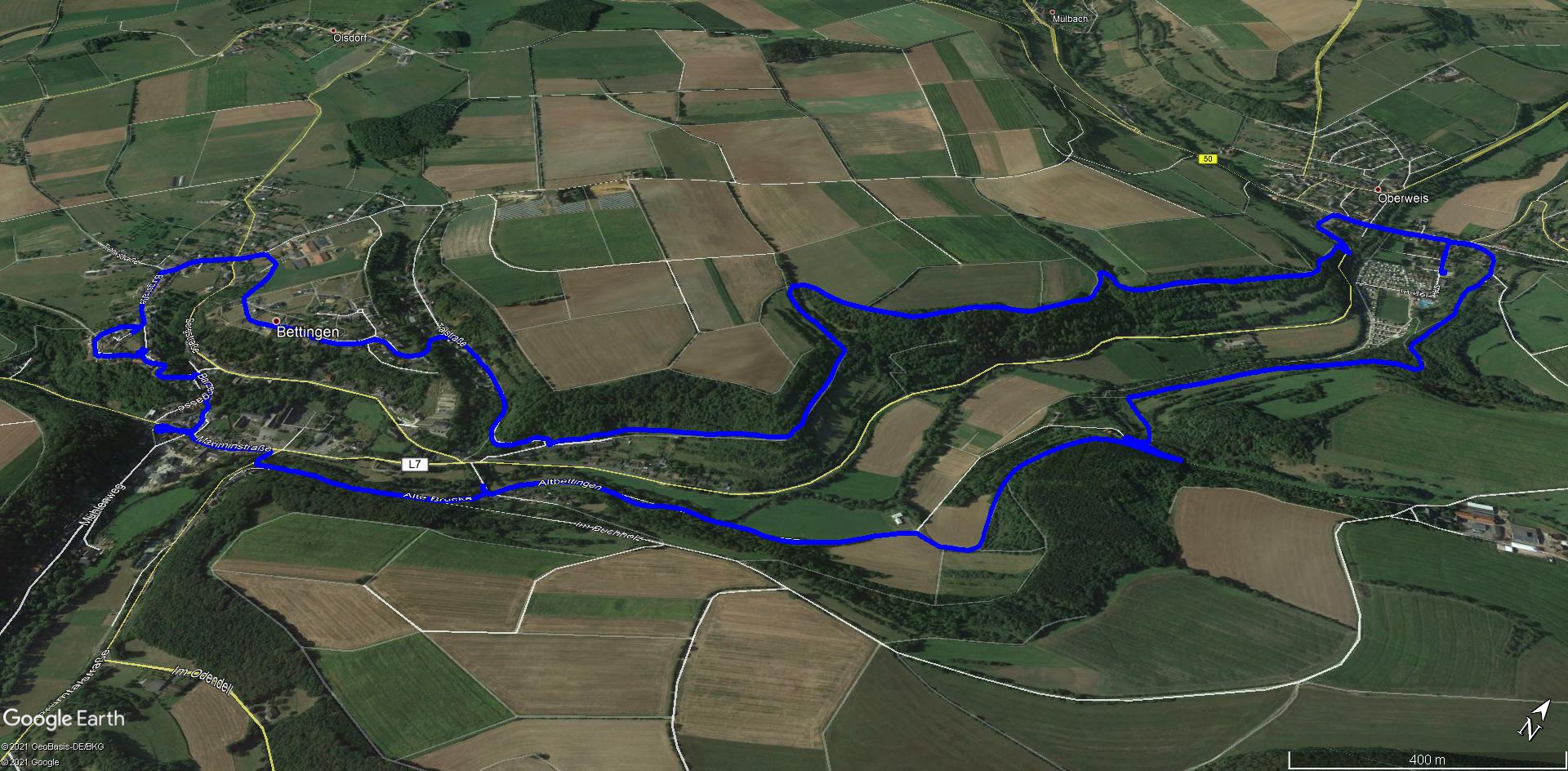 Vom Parkplatz am Campingplatz von Oberweis geht es hinauf auf die Höhen östlich der Prüm. Im Auf und Ab erreichen wir den Ort Bettingen. Ein steiler Aufstieg bringt uns hinauf zu den Resten der Burg. Durch ein Neubaugebiet erreichen wir die Höhen auf der anderen Prüm-Seite und kehren nach Oberweis zurück.