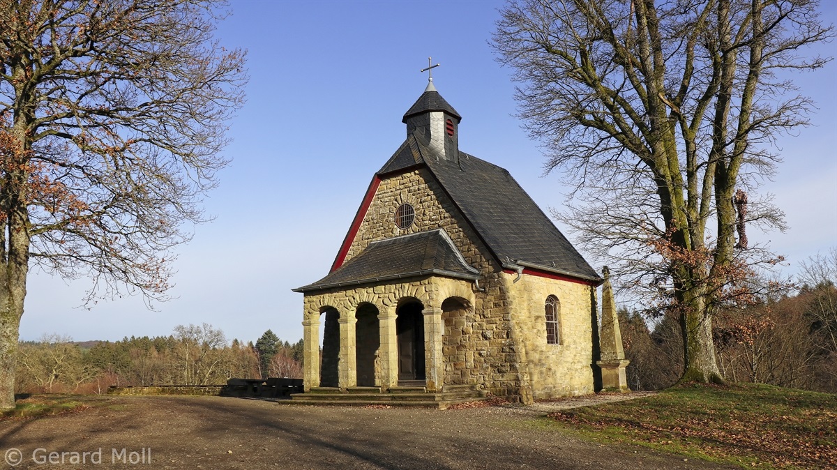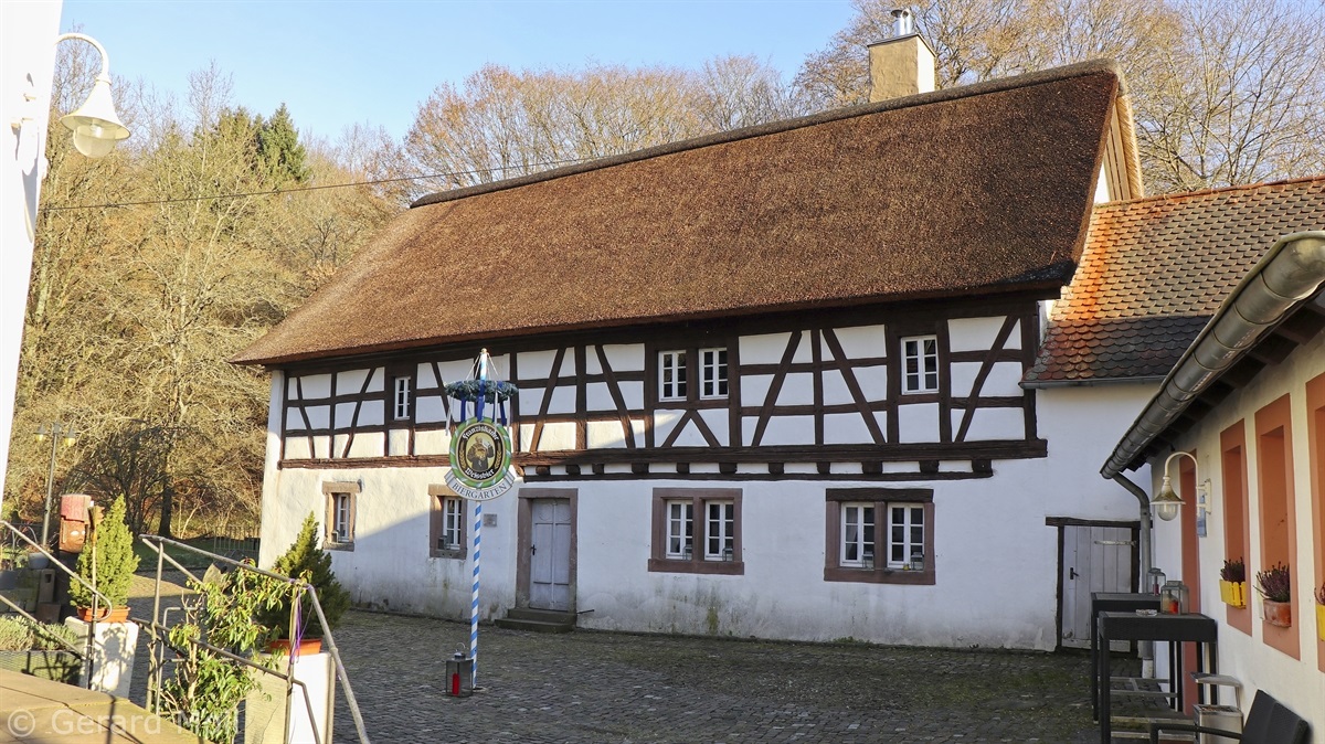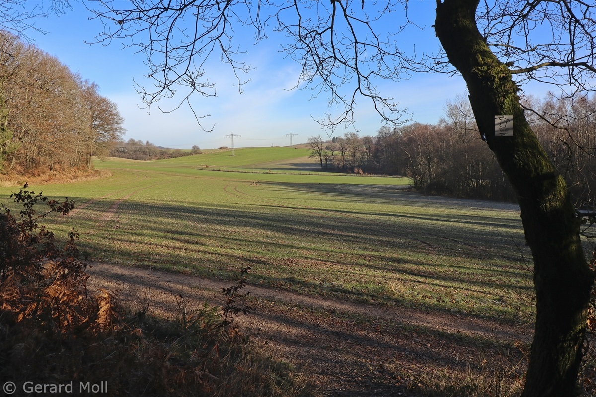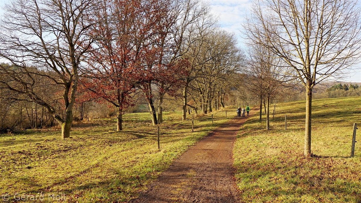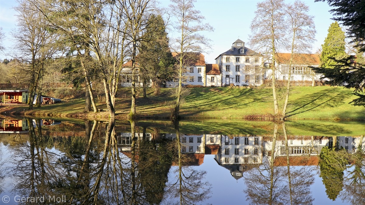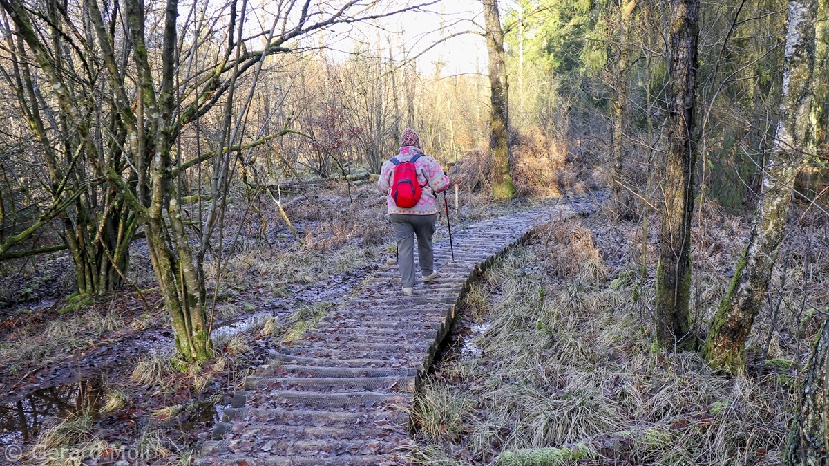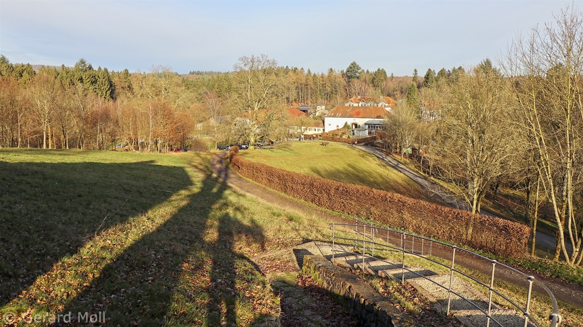 Vom Hofgut Imsbach Lapointe führt der gut angelegte Weg bis nach Selbach. Ein besonderer Anblick war dabei das seltene Haareis. Durch Wälder und über Felder erreichen wir die Johann-Adams-Mühle. Von hier gehen wir an einem Teich mit schöner Spiegelung vorbei zurück zum Hofgut, von wo wir noch einen kleinen Abstecher zur Kapelle des Hofguts machen.