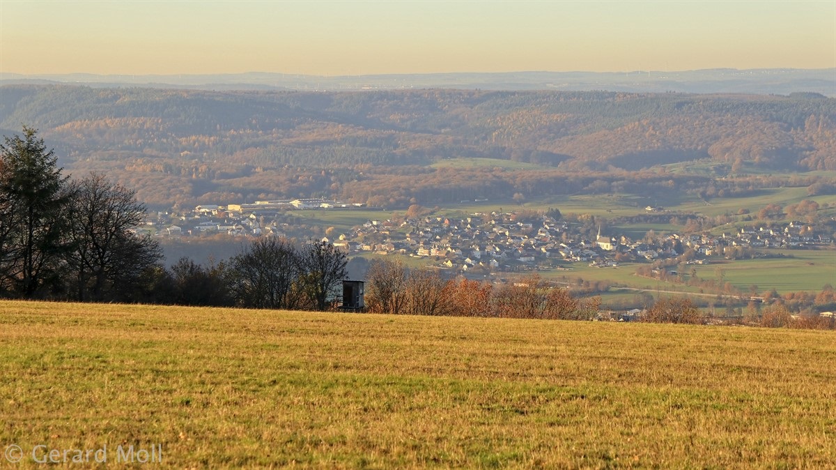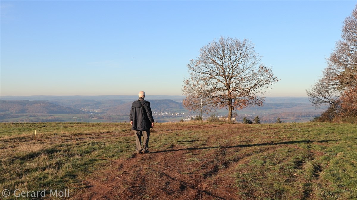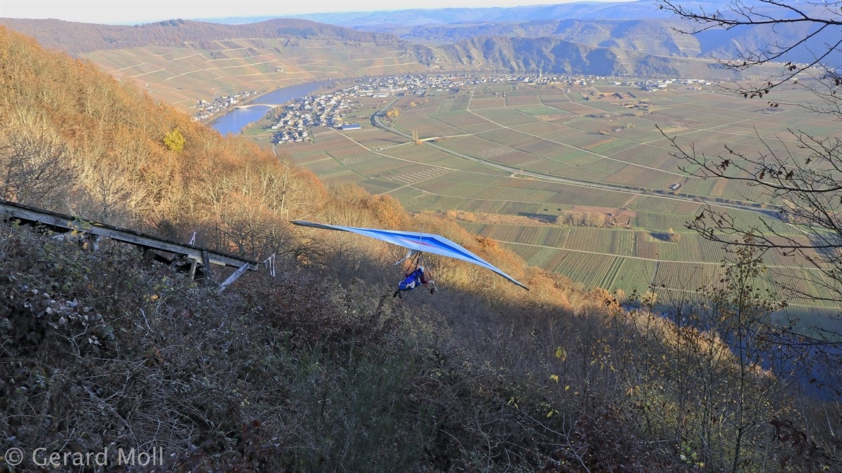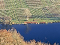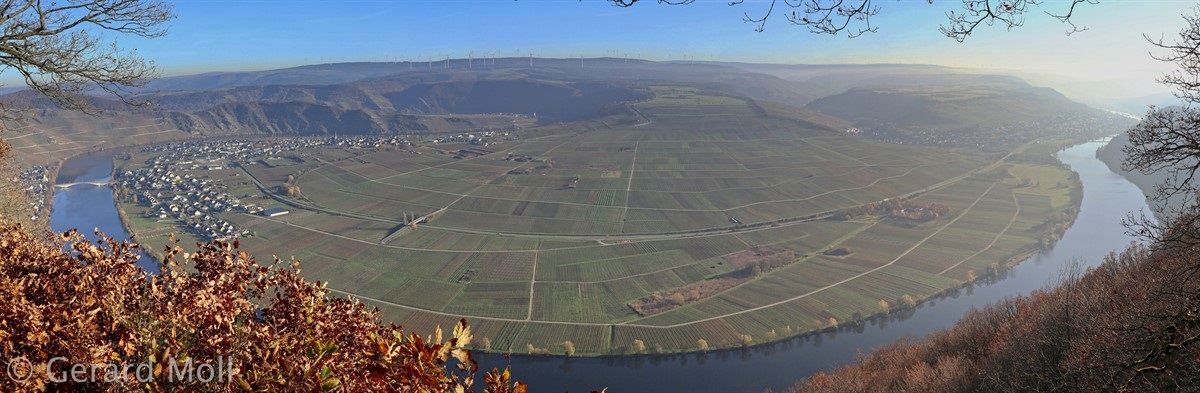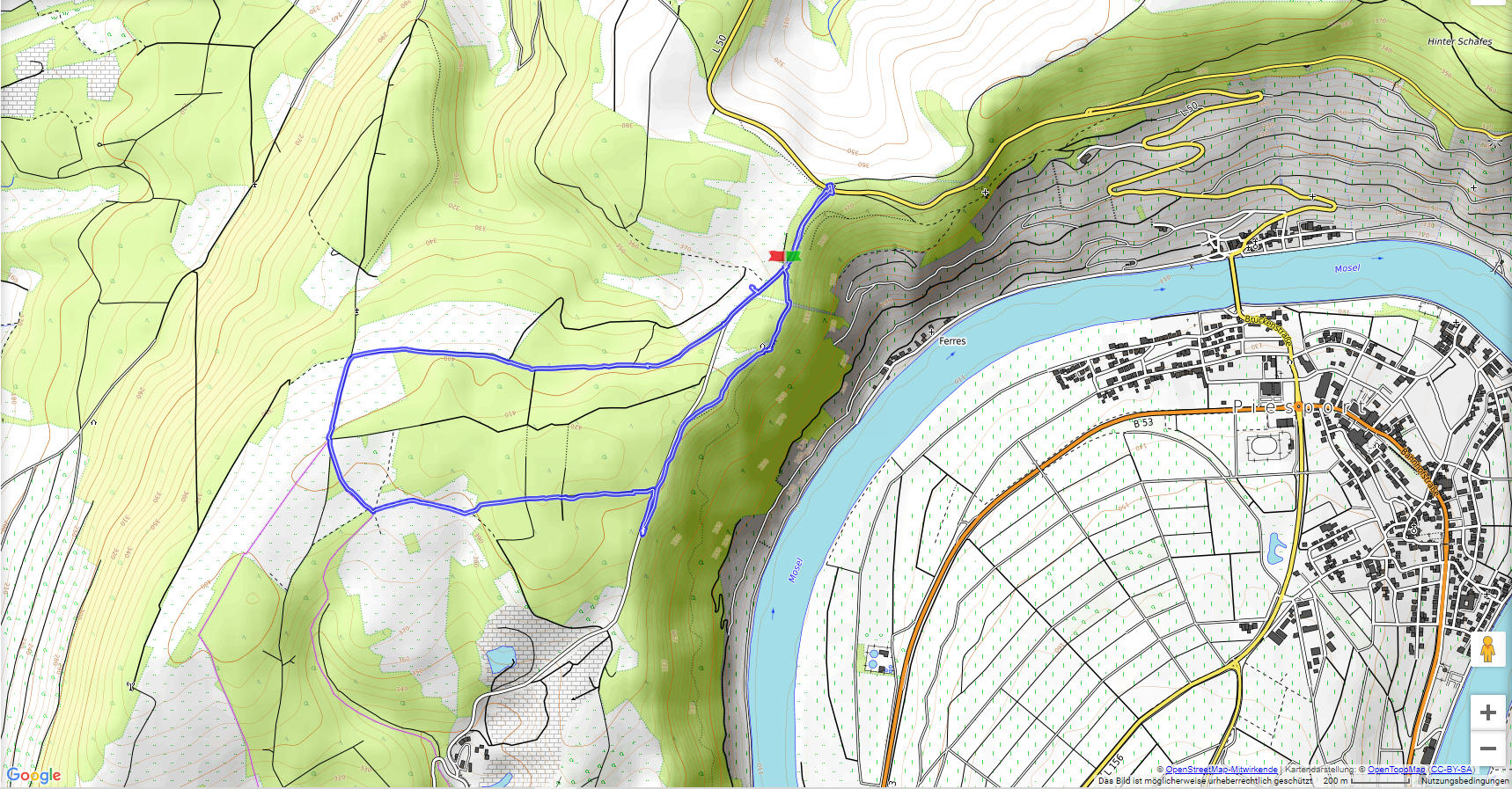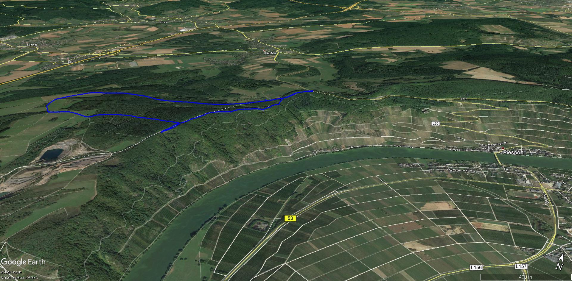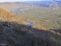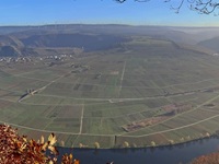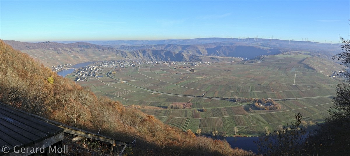 Wie bei der Tour am Piesporter Berg starten wir am Heiligenhäuschen. Bald ist der erste Aussichtspunkt auf Piesport erreicht, auch bei der Grillhütte "Weislei" bietet sich ein herrlicher Blick ins Moseltal. Bei der Abzweigung nach rechts in den Wald sollte man noch ein kleines Stück weitergehen bis zum Startplatz der Paraglider beim "Großen Moselblick". Von der Abzweigung führt der Weg durch Wald, dann wandern wir über Felder bis zum nächsten Höhepunkt. Bei einer Bank bietet sich ein weiter Panoramablick über die Eifel, ehe wir zum Ausgangspunkt zurückkehren.