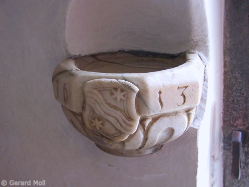Bild in Lightbox öffnen (open image in lightbox). Weihwasserstein von 1613 in der Kirche in Percha.