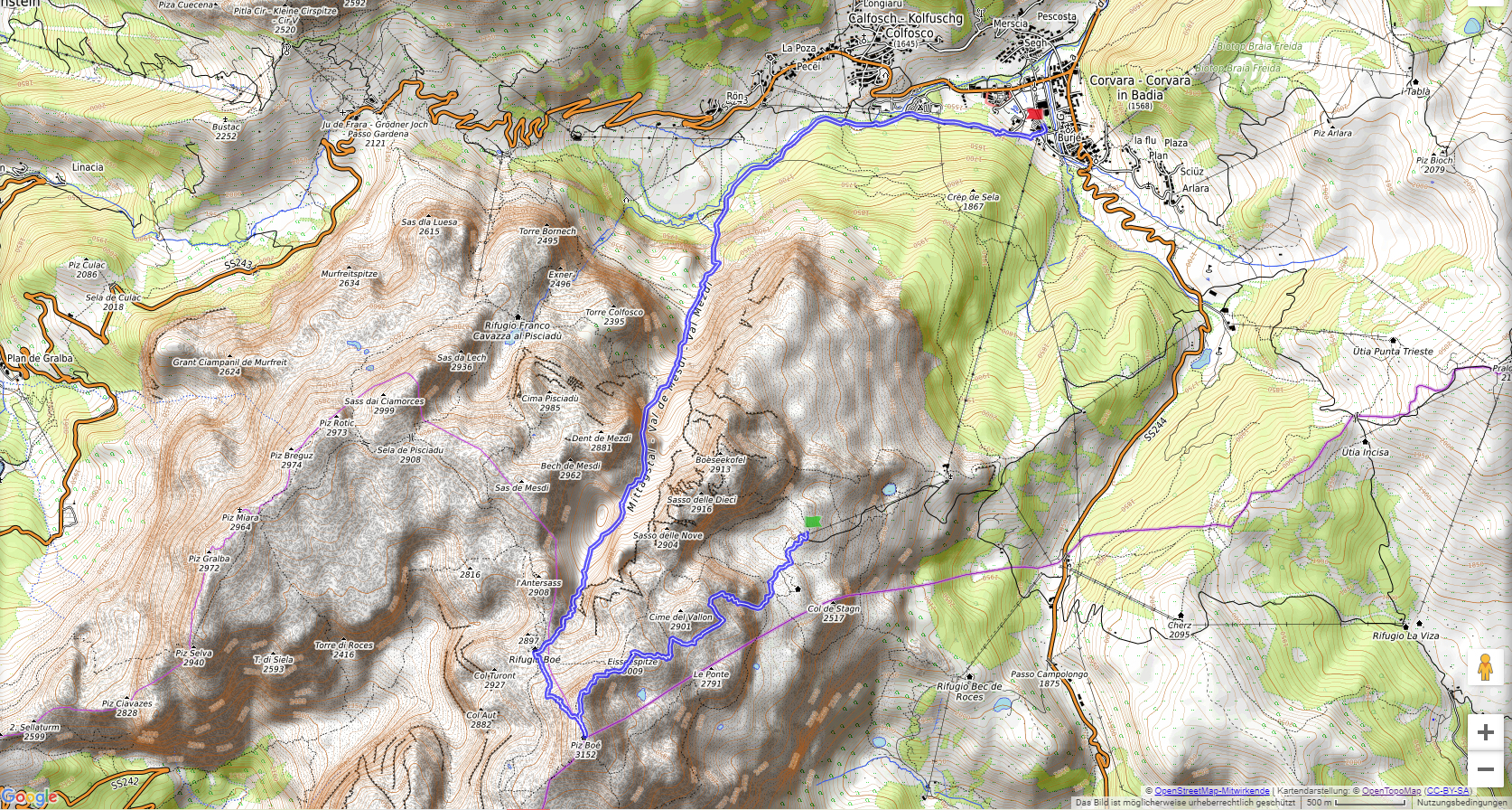 Von Corvara lassen wir uns von der Seilbahn auf 2537 m befördern. Dort haben wir die Wahl, den Piz Boe über den Weg 638 oder den Weg 672 zu erreichen, landschaftlich grossartig sind beide Wege. Am Gipfel (3152 m) erwartet uns die Capanna Fassa. Der Abstieg führt über die Boehütte (2873 m) und durch das phantastische Mittagstal zurück nach Corvara (1540 m). Es besteht auch die Möglichkeit, über den Antersas (2907 m) zur Pisciaduhütte hinüber zu gehen.