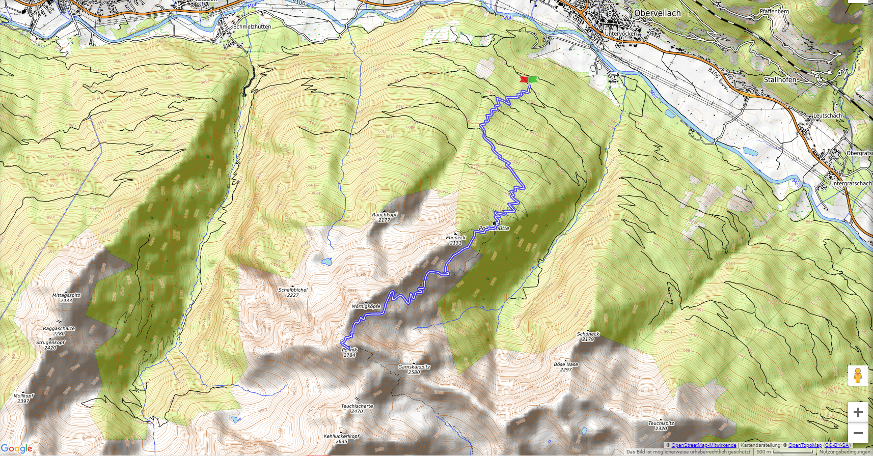 Von Obervellach sind wir zum Parkplatz der Polinikhütte auf 1389 m hochgefahren. Bis zur Polinikhütte (1873 m) müssen wir 500 Meter hinauf, zum Gipfel des Polinik (2784 m) kommen noch einmal 900 Meter hinzu ! Dabei ist der Weg nicht ganz einfach, aber die Aussicht vom Gipfel entschädigt uns für die Plagen des Aufstiegs.