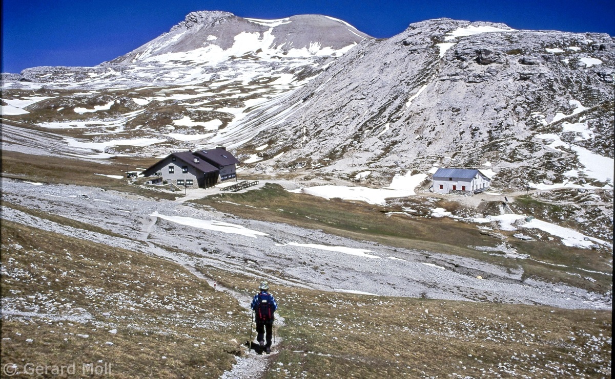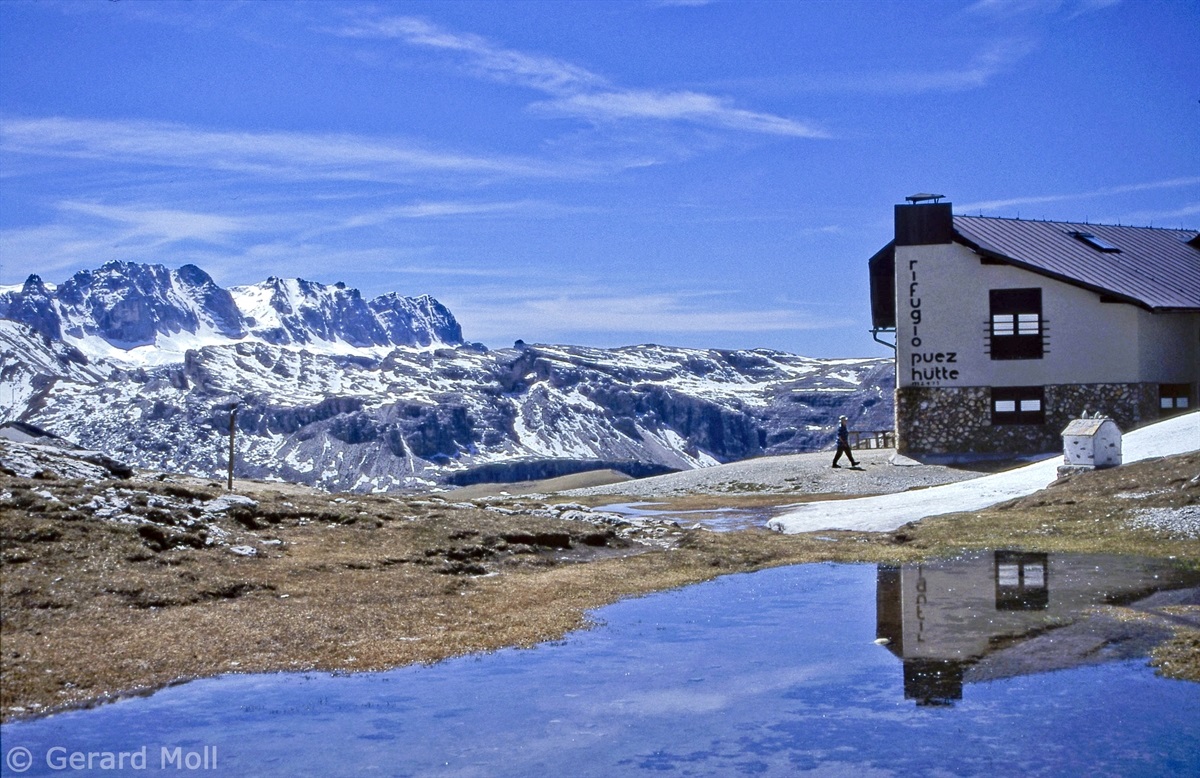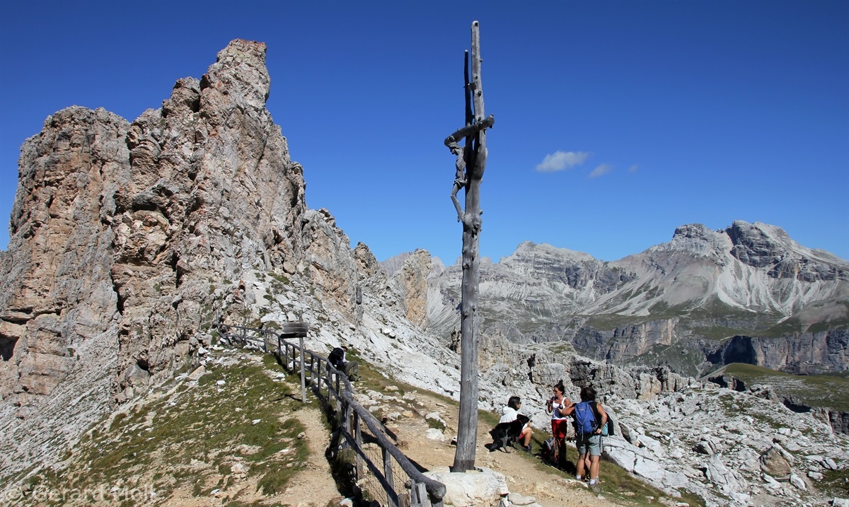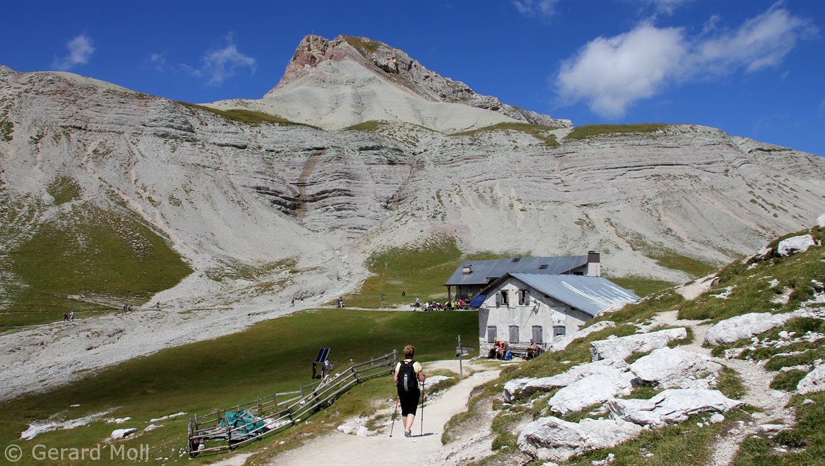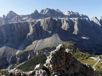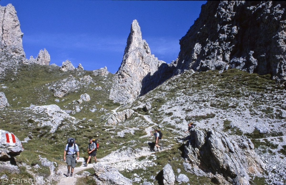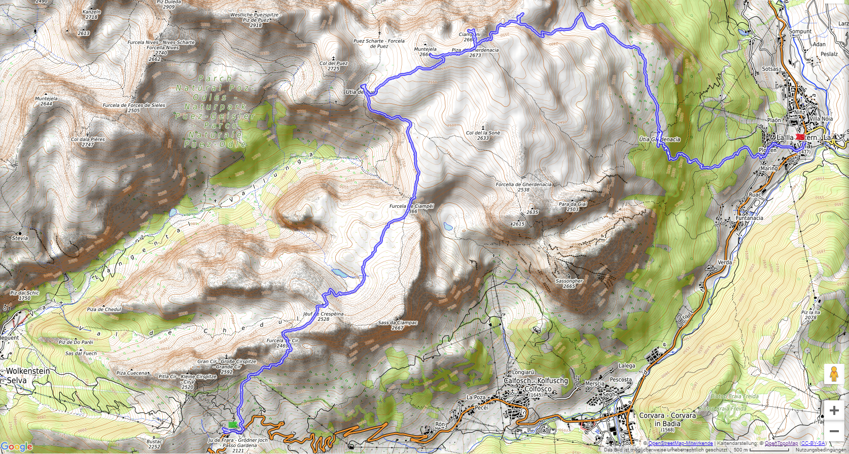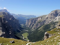 Wir sind von Stern mit dem Bus zum Grödnerjoch (2121 m) gefahren und an wilden Felstürmen vorbei zum Crespeinajoch (2528 m) gewandert. Über die phantastische Hochfläche sind wir über das Ciampeijoch zur Puezhütte (2475 m) gelangt. Über Muntejela (2666 m) und Piza de Gherdenacia (2668 m) wurde die Tour bis zur Gardenaciahütte (2050 m) fortgesetzt, von wo aus wir nach Stern (1416 m) abgestiegen sind.