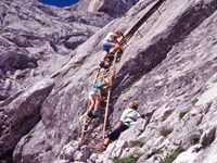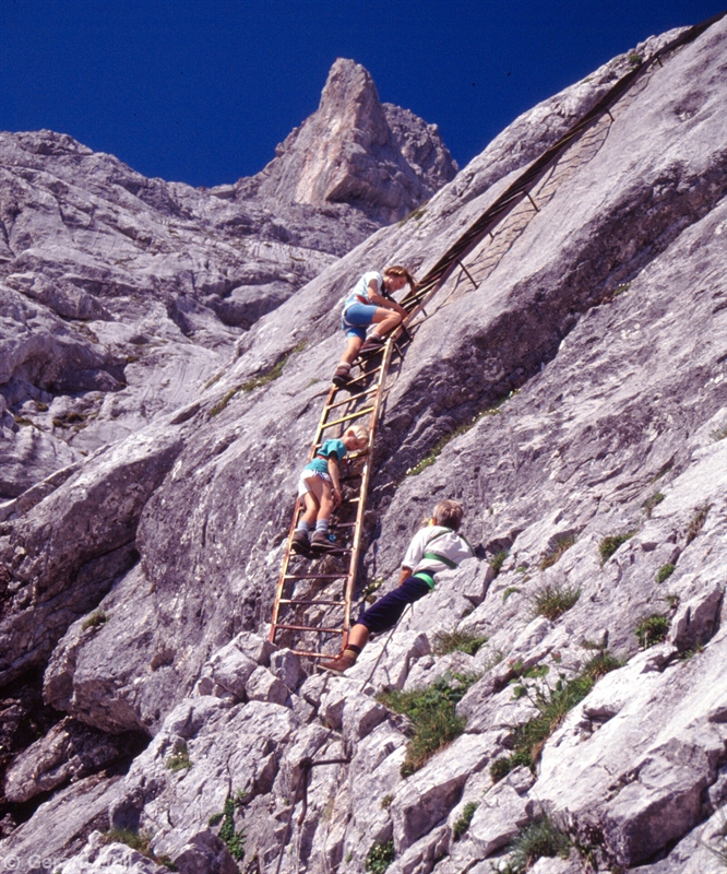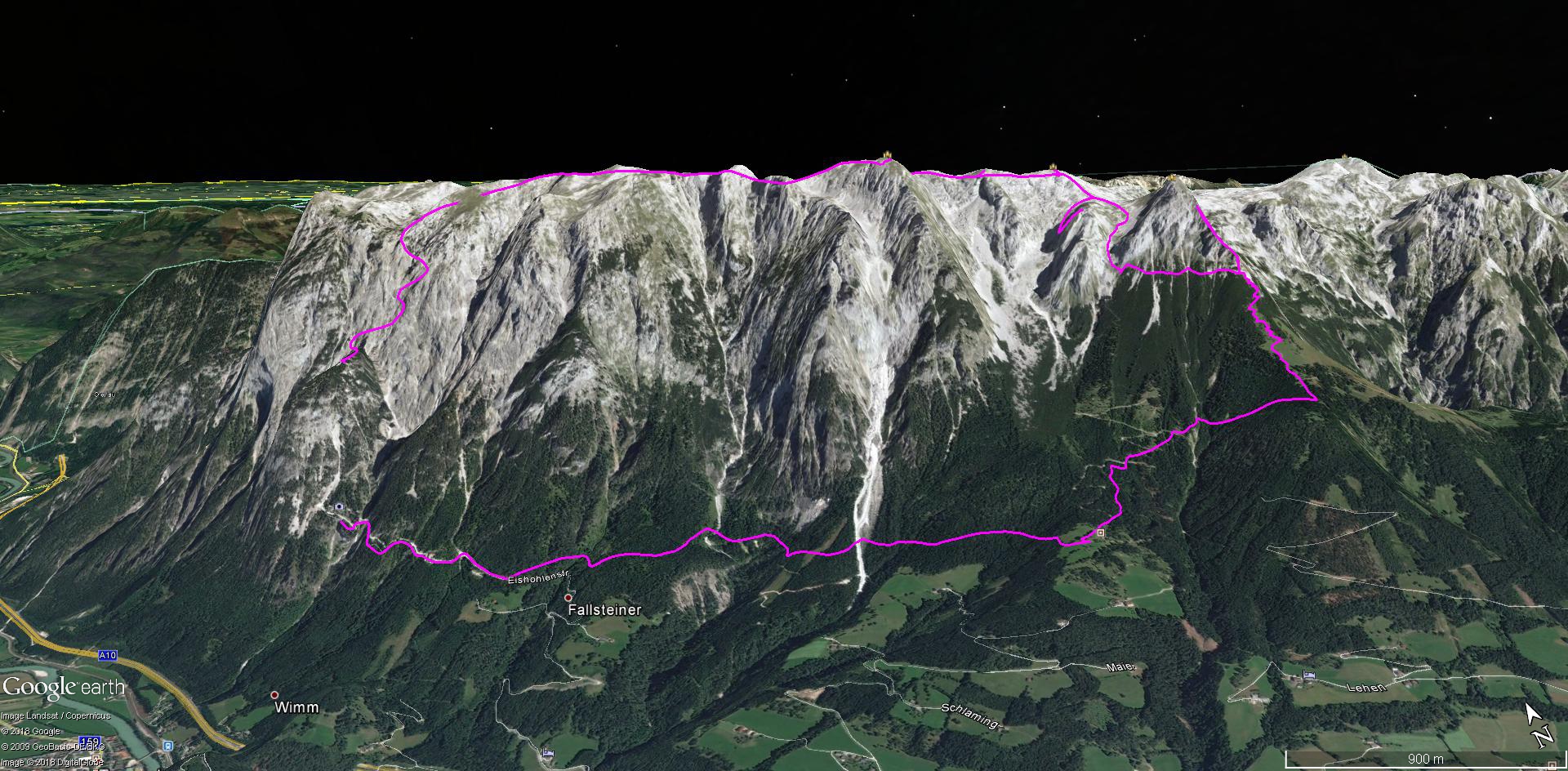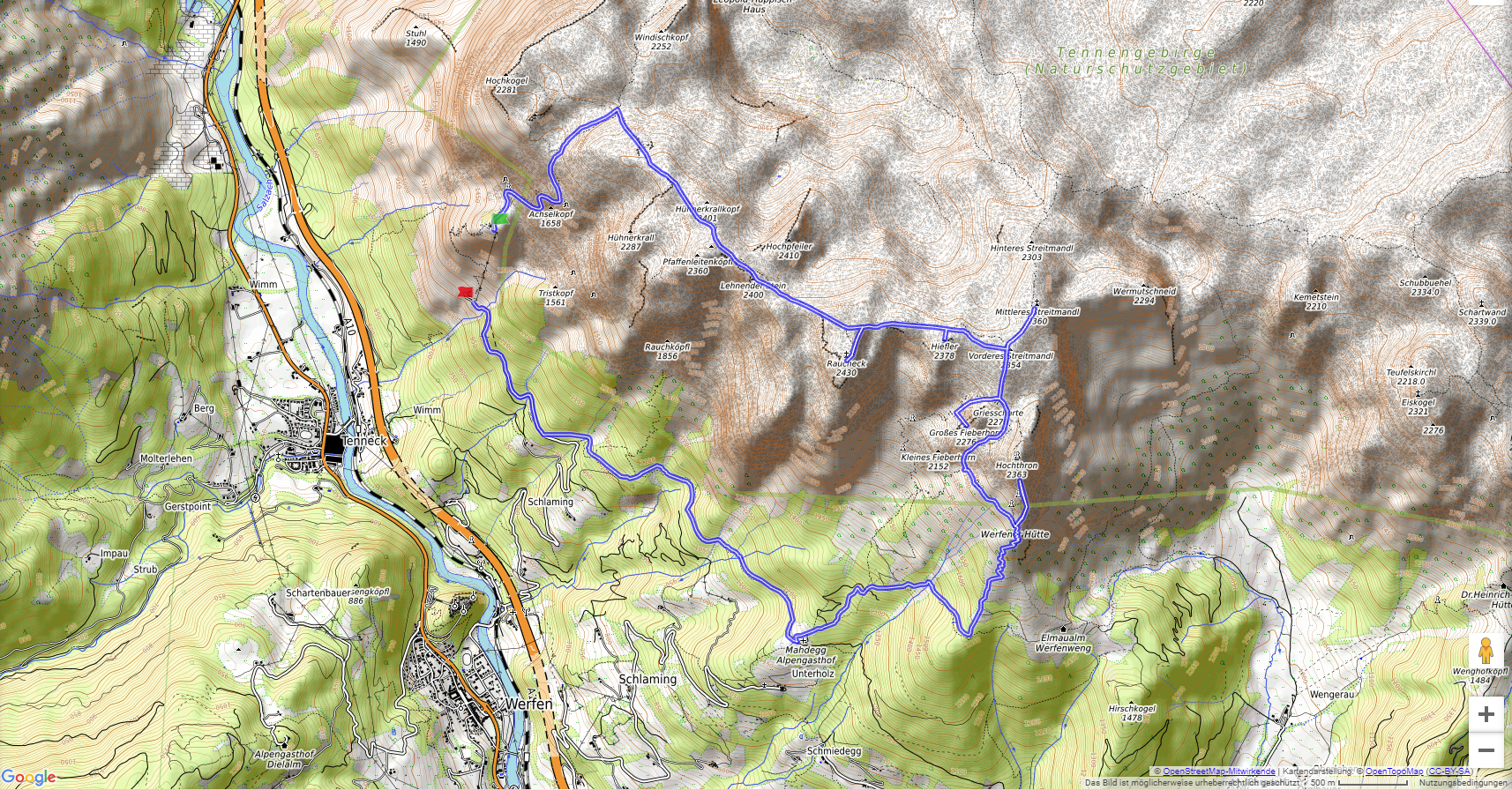 Vom Parkplatz zur Eisriesenwelt (1076 m) sind wir mit der Seilbahn bis auf 1582 m gefahren. An der Eisriesenwelt vorbei ging es bis auf die riesige Karsthochfläche und über sie bis zum höchsten Gipfel des Tennengebirges, dem Raucheck (2430 m). Nach Abstechern zur Edelweißerhütte (2350 m) und auf das Große Fieberhorn (2276 m) war noch das Hindernis der sehr steilen Thronleiter zu überwinden, ehe wir uns auf der Werfener Hütte (1969 m) ausruhen konnten. Am anderen Tag wurde nach einem gescheiterten Versuch am Hochthron (2362 m) der Abstieg über die Mahdeggalm zurück zum Ausgangspunkt in Angriff genommen.