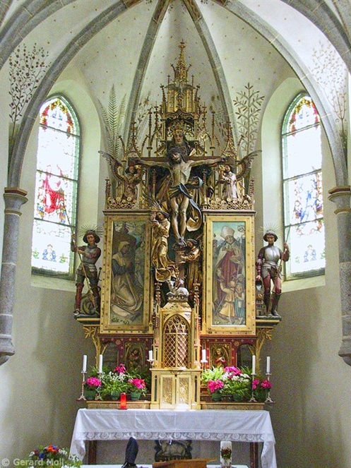 Bild in Lightbox öffnen (open image in lightbox). Von der spätgotischen Pfarrkirche zum hl. Wolfgang  ist nur der Turm erhalten geblieben, die übrige Kirche wurde 1911 neu errichtet.