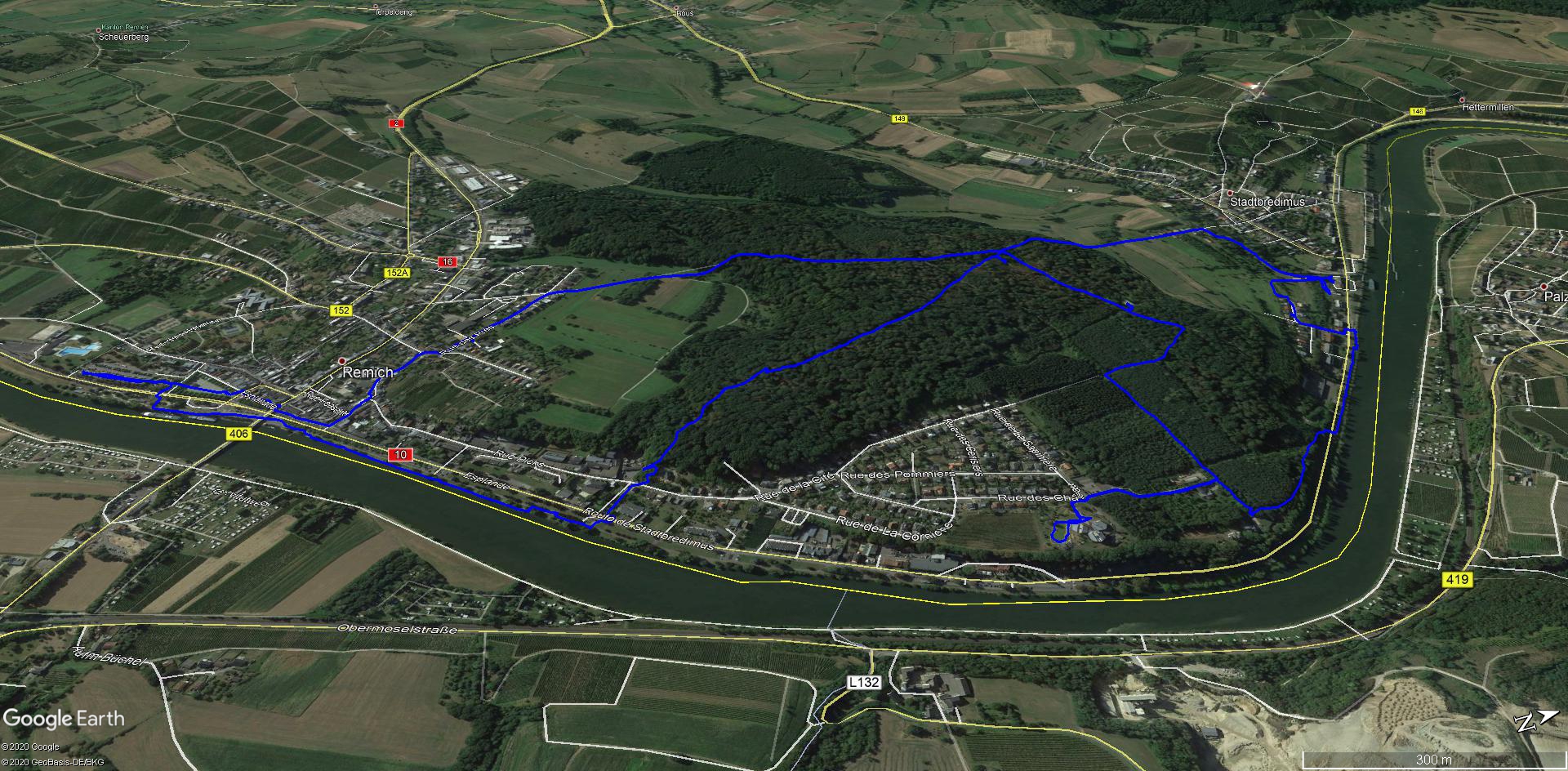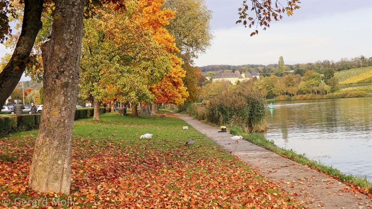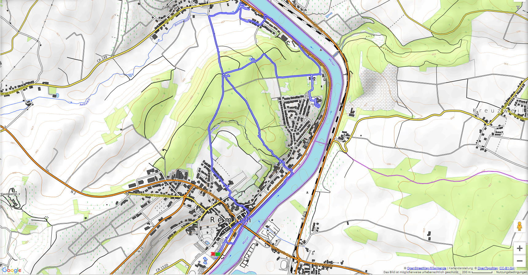 Vom Parkplatz in Remich führt der Weg durch den Ort hinauf in den Wald bis zu einem Wegkreuz. Dann geht es hinunter nach Stadtbredimus. An der Mosel entlang wandern wir bis an eine Biegung des Flusses, dann steigen wir an Schloss Buschland vorbei hinauf. Ein kleiner Abstecher zum nahen "Centre de Formation et de Seminaires" ist lohnend. Dann folgen wir dem Weg in den Wald bis zu dem oben erwähnten Wegkreuz und steigen nach Remich ab.