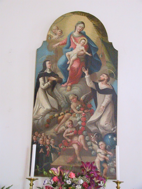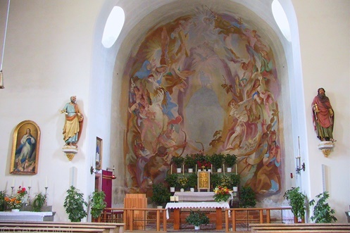 Bild in Lightbox öffnen (open image in lightbox). Der 1953 geweihte Neubau der Pfarrkirche zum hl. Sebastian in Reschen entstand als Ersatz für die beim Bau des Stausees abgerissene Kirche aus dem 19. Jahrhundert. Altarbilder und Skulpturen aus der alten Kirche.