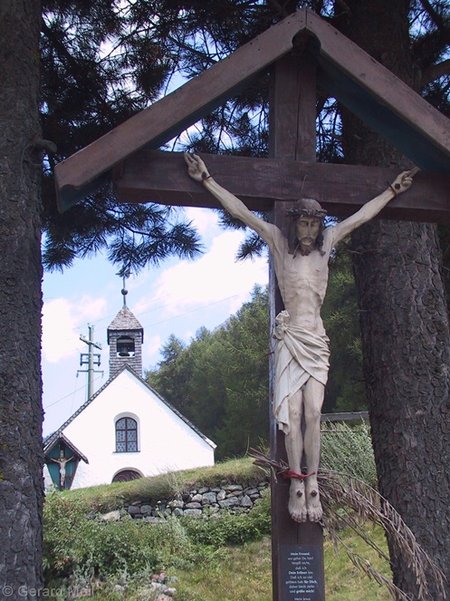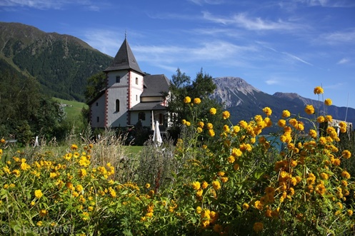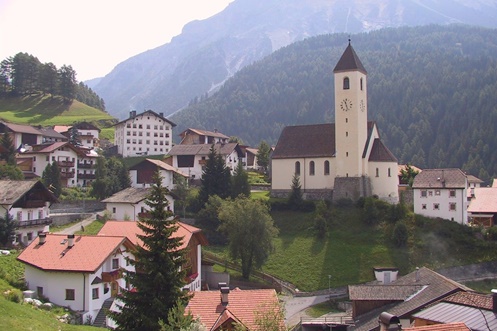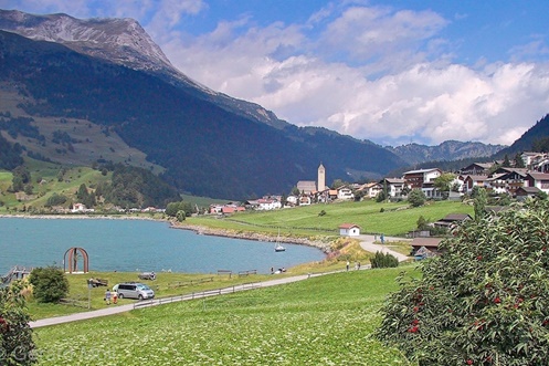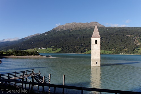 ursprüngliche Lage des Ortes erinnert noch der Kirchturm, der aus den Fluten des Reschensees ragt.