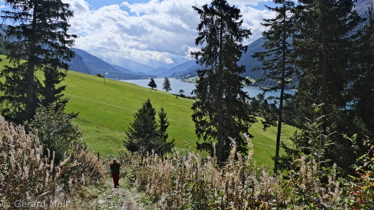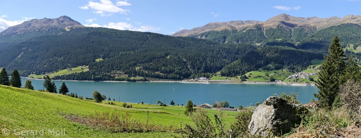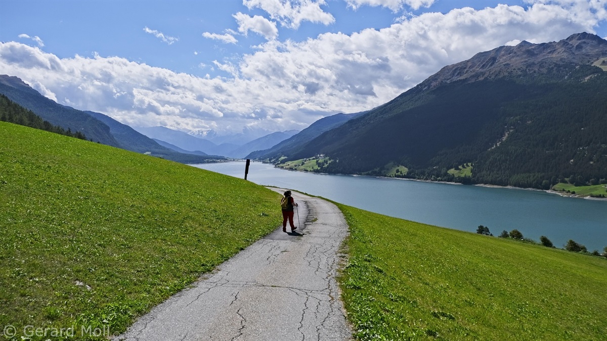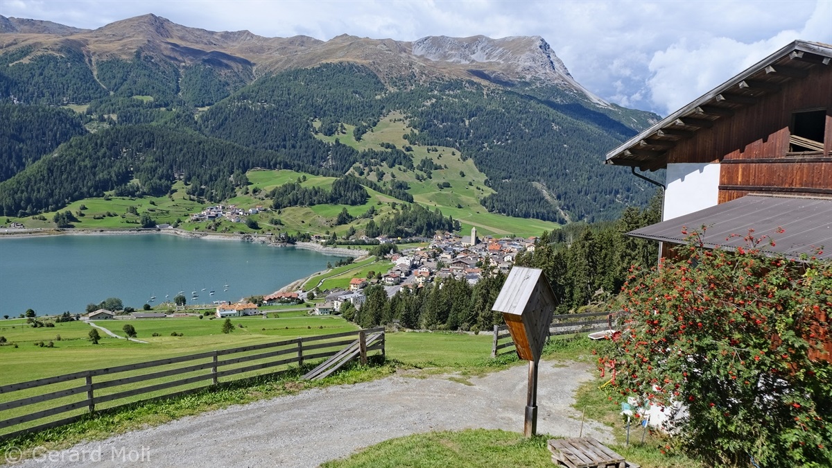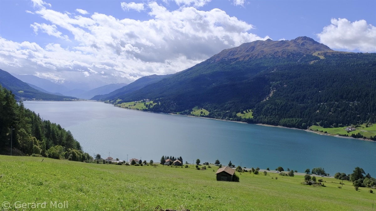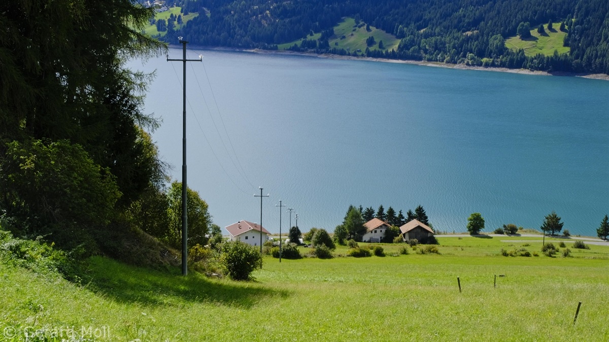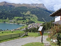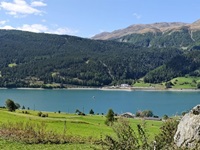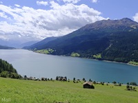 Wir haben eine Regenpause genutzt und sind von dem Ort Reschen hinauf zu den Klopairhöfen gewandert. Von dort sind wir zur Reschenstrasse abgestiegen und sind am Reschensee entlang zurück spaziert.
