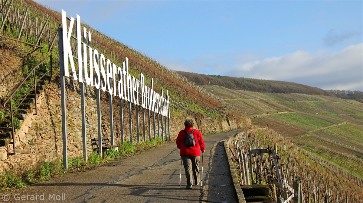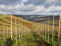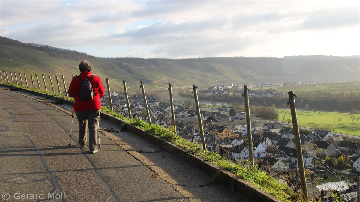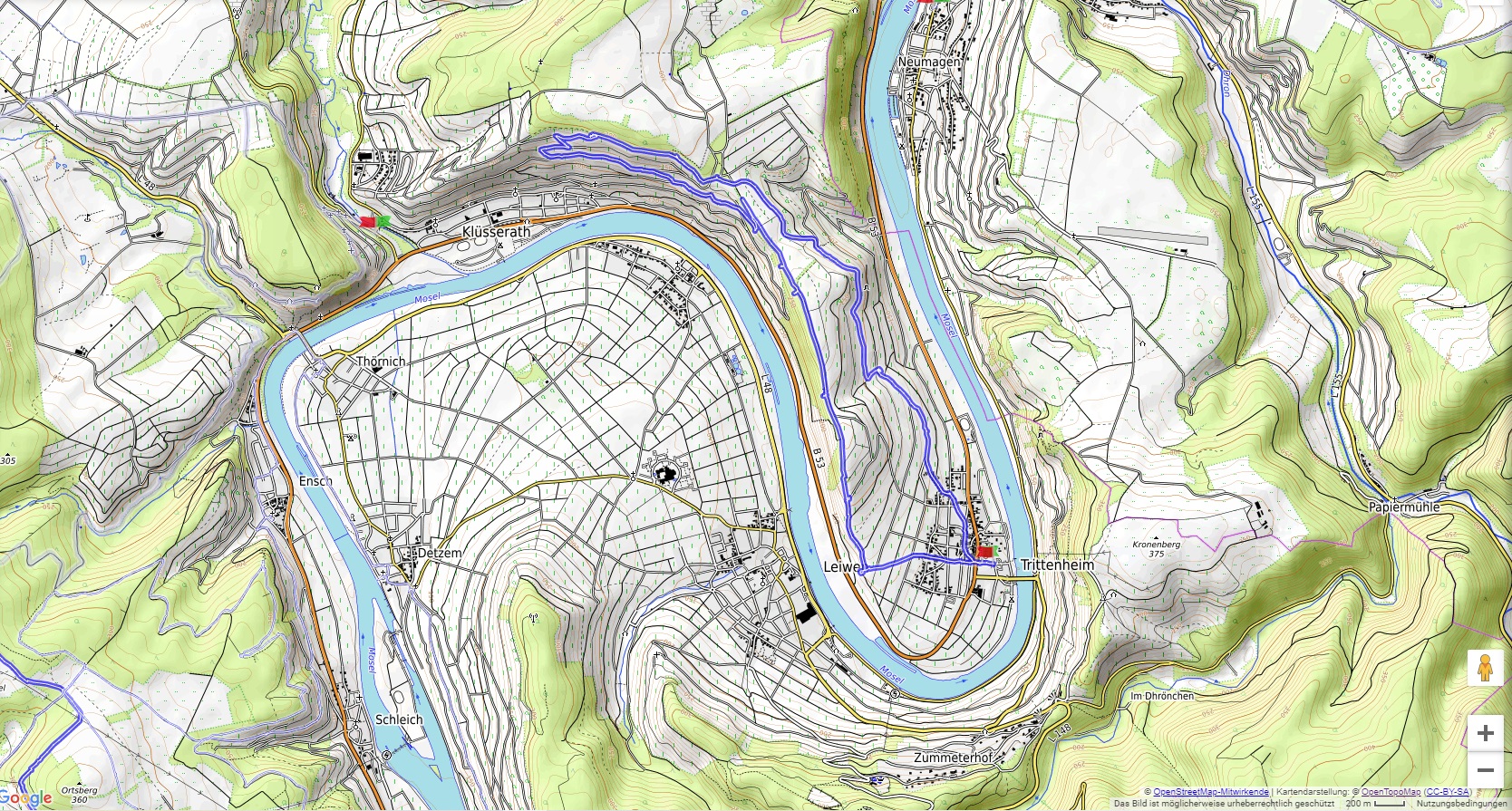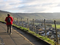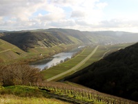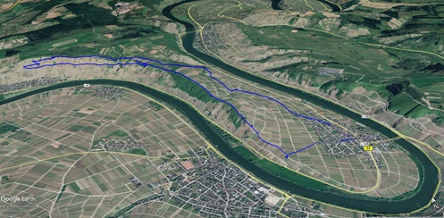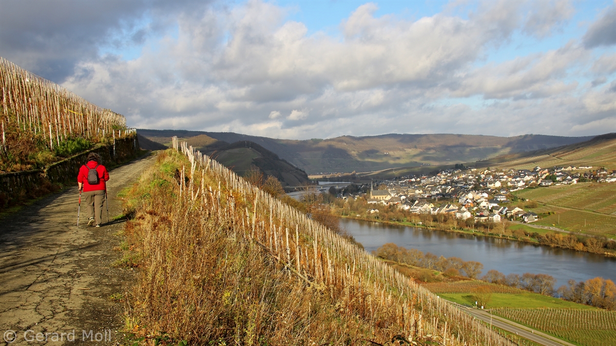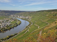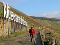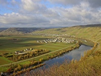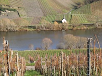 Wir wandern von Trittenheim Richtung Norden entlang der Mosel durch Weinberge, vorbei am alten jüdischen Friedhof, hinauf zur Hochfläche des Neuberges mit seinem Motocrossgelände. Nun geht es westwärts fast hinunter bis Klüsserath. Von dort durch die Klüsserather Weinlagen zum Hinkelstein und weiter zur Laurentiuskapelle bei Trittenheim.