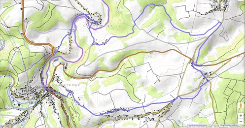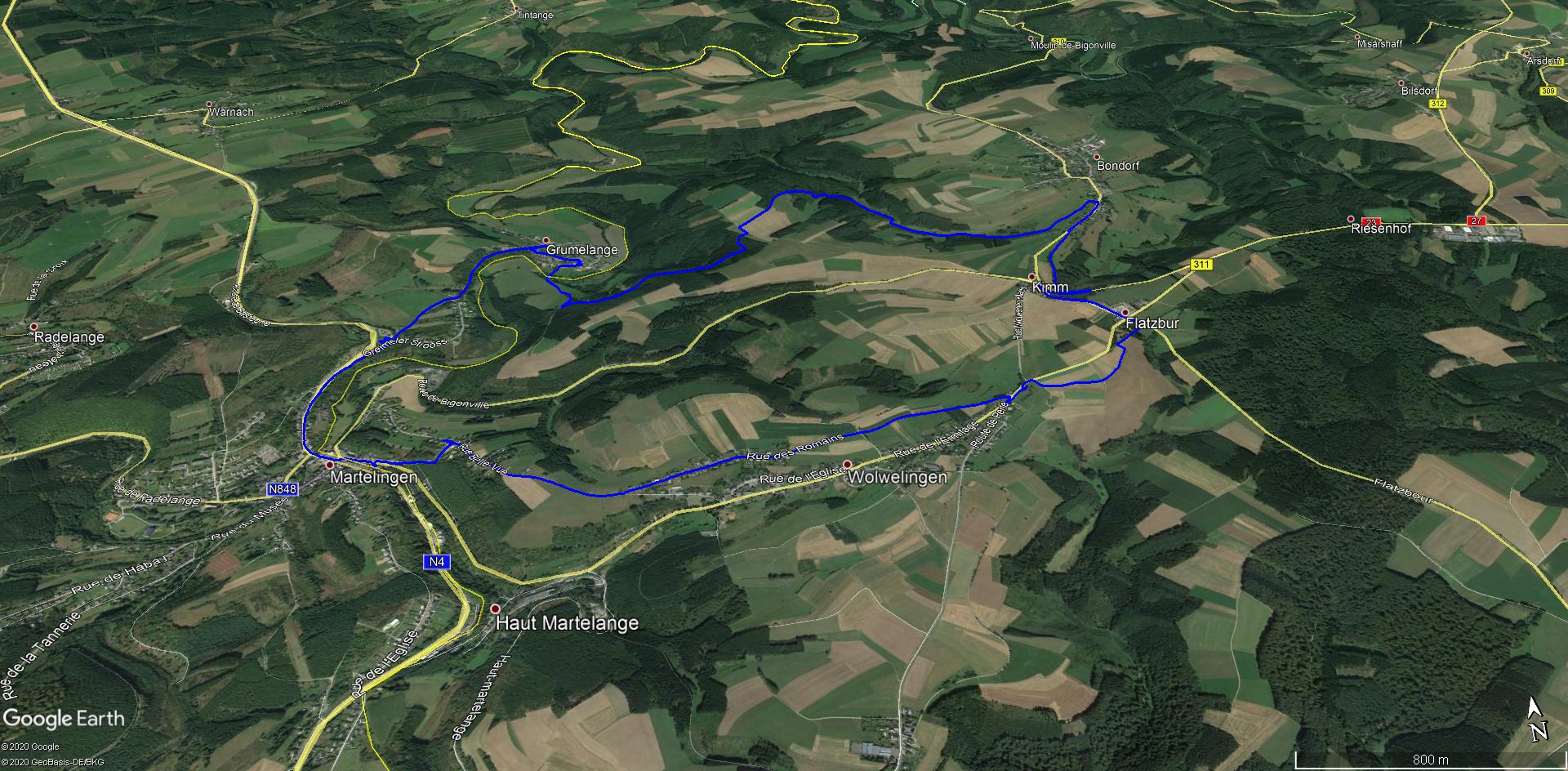 Von Rombach-Martelange folgen wir der N4 bis zum Denkmal der "Chasseurs Ardennais". Dann führt der Weg nach Grumelange. Im Tal überqueren wir die Sauer und auf der Luxemburger Seite steigen wir hinauf bis zum Ortseingang von Bigonville. Über Flatzbour erreichen wir die Wolwener Klaus und kehren nach Rombach-Martelange zurück.