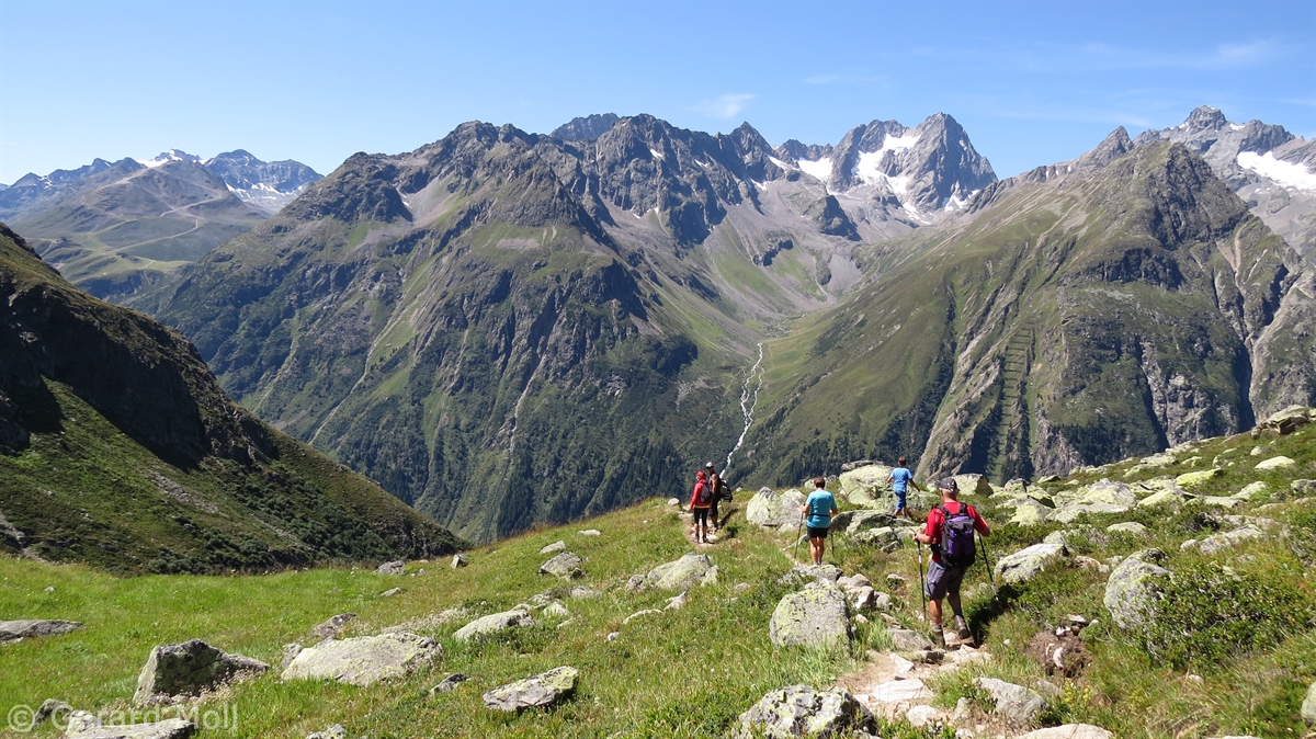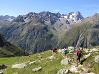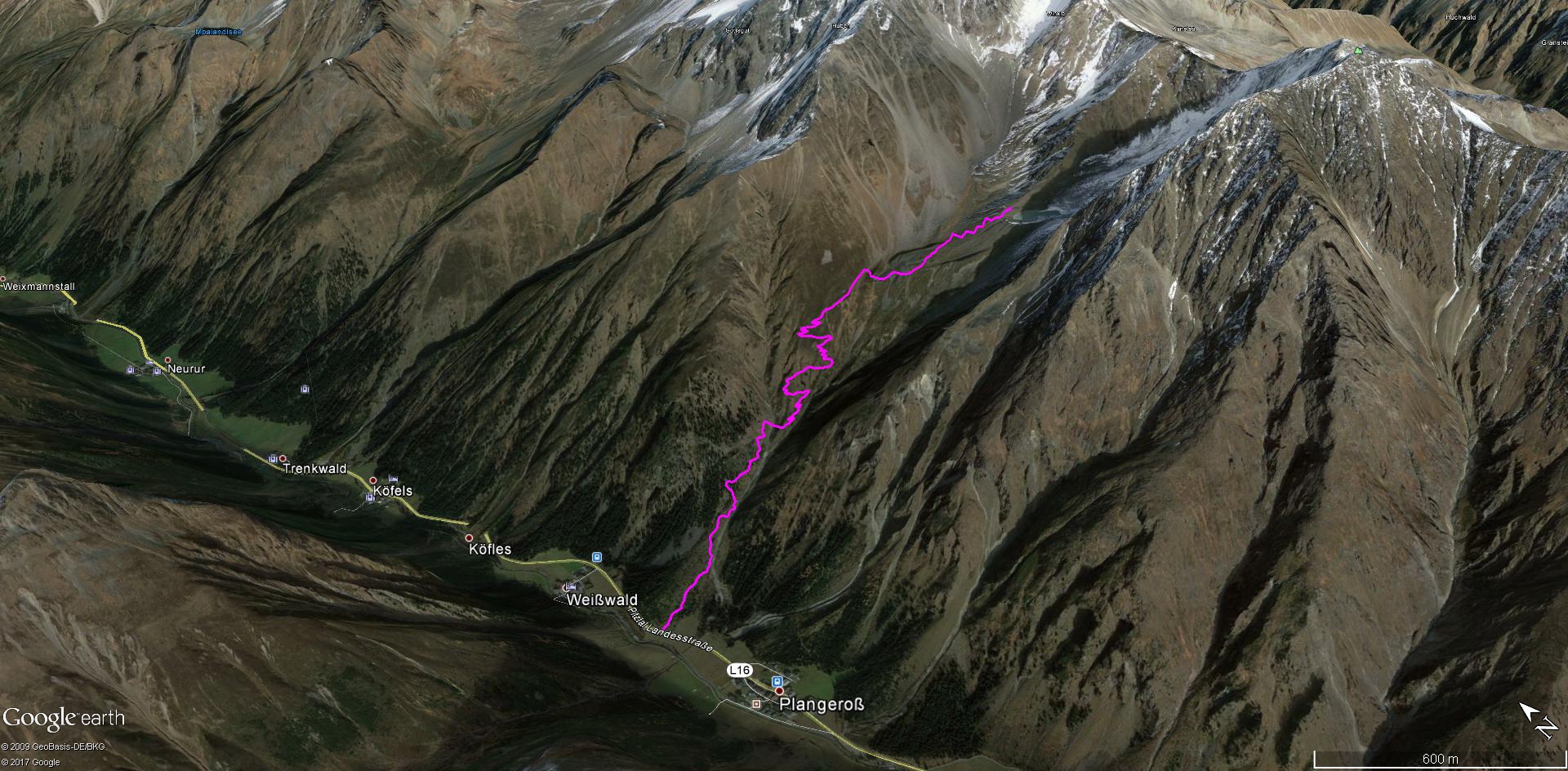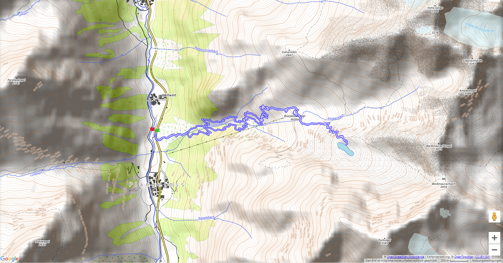 Wir parken kurz vor Plangeross im Pitztal (1607 m). Der sehr schöne, aber steile  Anstieg bringt uns rasch hinauf zur Rüsselsheimer Hütte (Neue Chemnitzer Hütte) auf 2328 m.