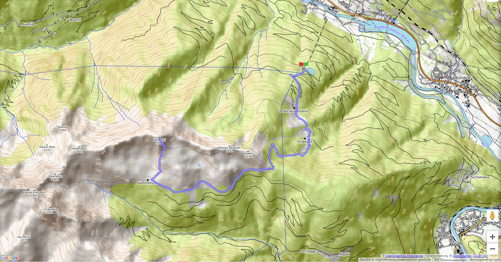Von Oberkolbnitz fahren wir mit der Panoramabahn Kreuzeck auf etwa 1200 m. Über die Foidlhütte und die Klinghütte erreichen wir die Salzkofelhütte (1987 m). Noch einmal 500 Meter und wir sind am Gipfel des Salzkofel (2498 m). Wir kehren auf dem gleichen Weg zurück.
