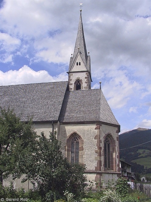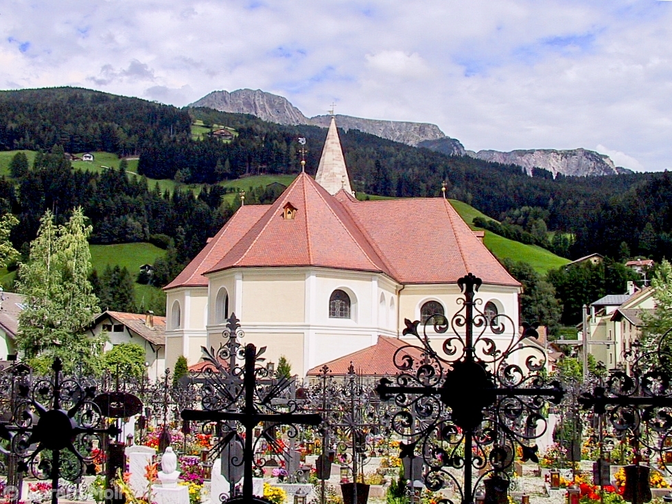 Bild in Lightbox öffnen (open image in lightbox). Die neuromanische Pfarrkirche zu Mariä Himmelfahrt in Sarnthein stammt im wesentlichen von 1856, nur Teile des Turms sind deutlich älter (um 1350)