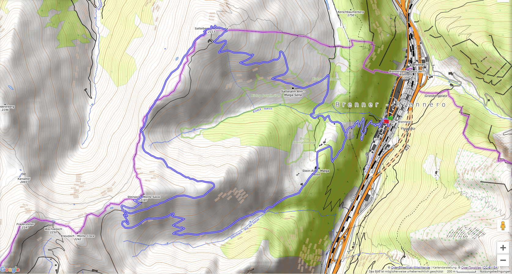 Vom Brennerpass (1375 m) geht es zuerst steiler, dann auf einem Fahrweg hinauf zum Sattelberg (2115 m). Über das Steinjoch (2185 m) kehren wir zurück zum Brenner.